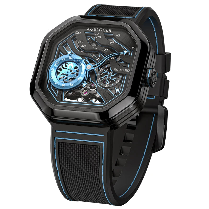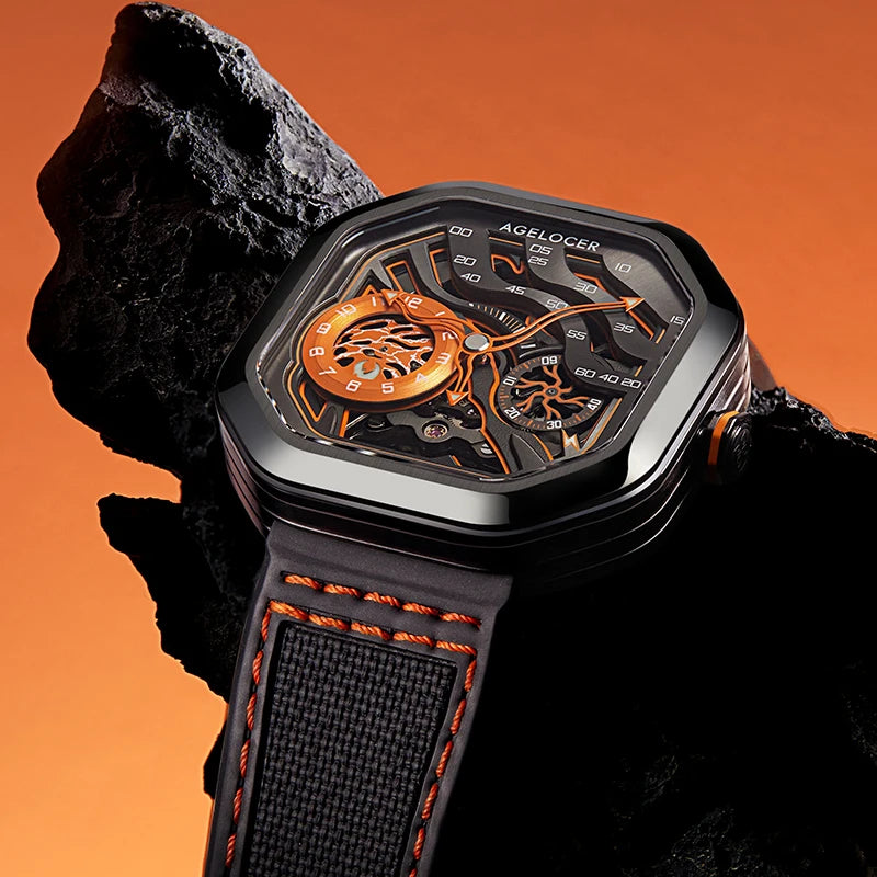 AGELOCER Original Volcano Watch Men's Square Luxurious Skeleton Automatic Mechanical Watch Birthday Gift for Men