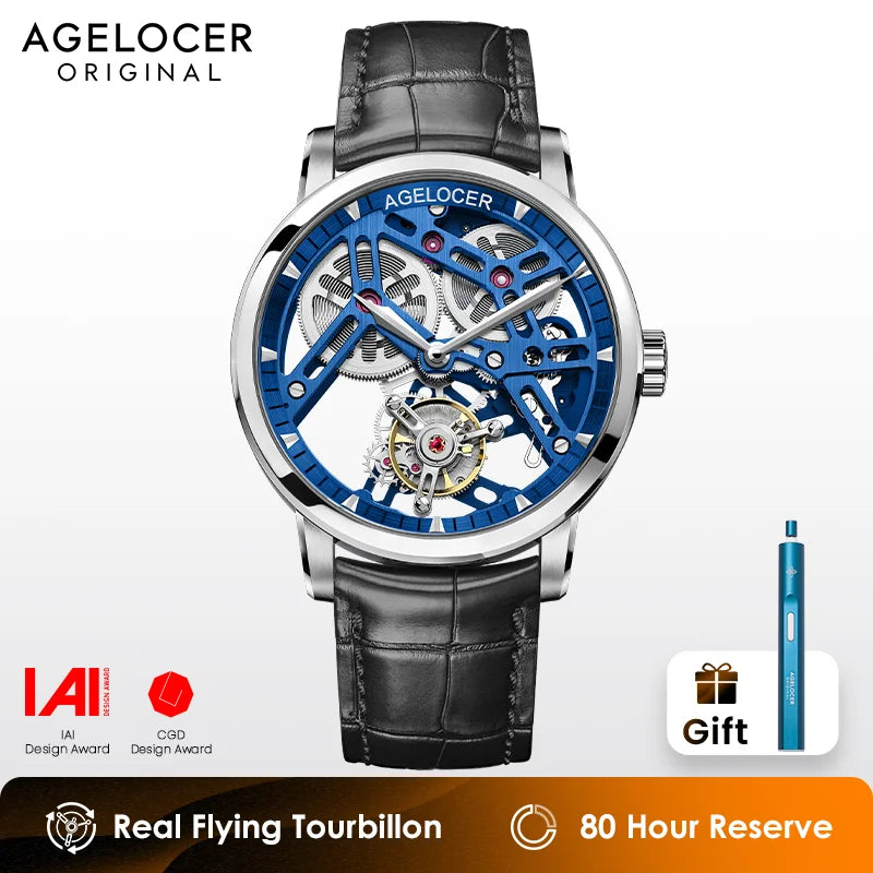 AGELOCER Original Tourbillon Watch Sapphire Crystal Case Men's Skeleton Manual Mechanical Watch Birthday Gift for Men
