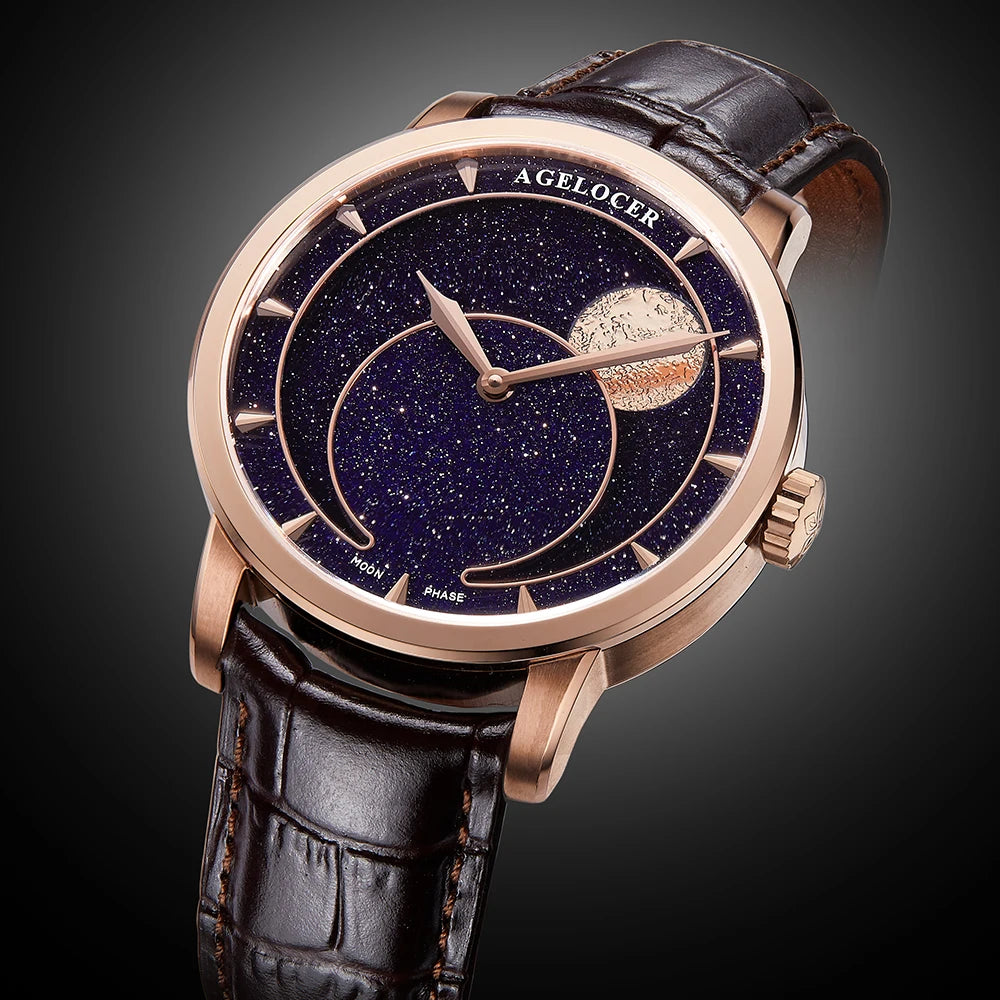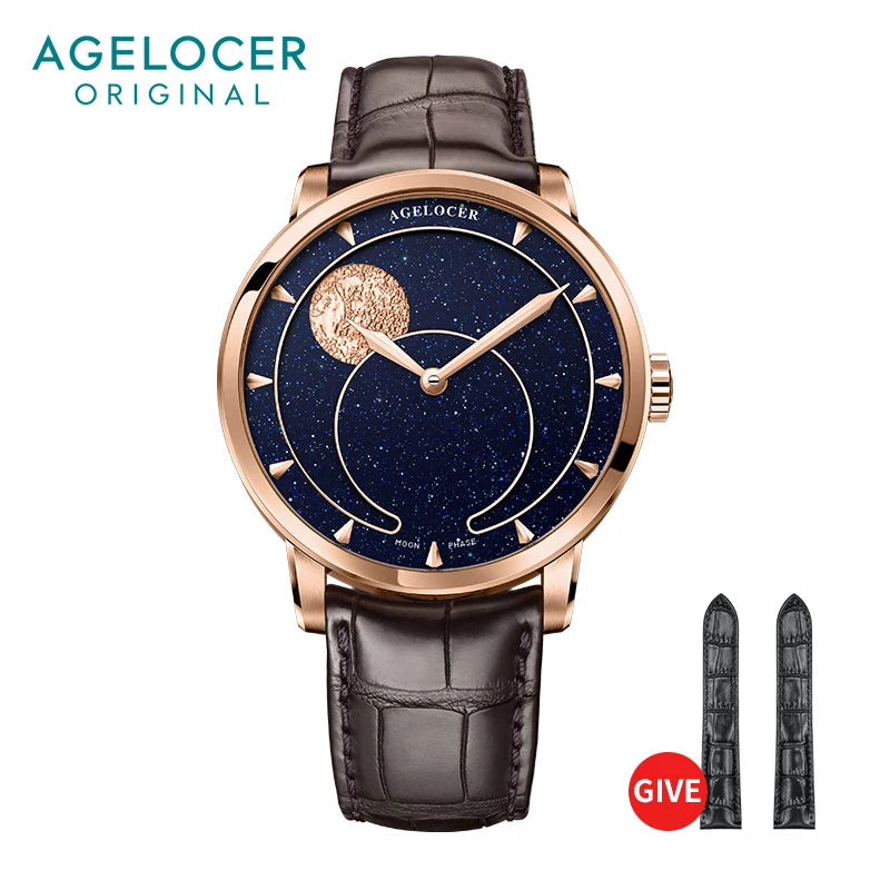 AGELOCER Men's Watch Blue Moon Phase Dress New Stainless Steel Automatic Mechanical Luxury Fashion WristWatch
