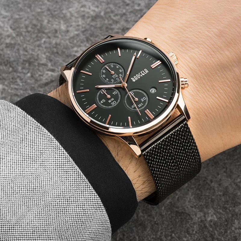 BAOGELA Men's Watch Waterproof Analog Quartz Wrist Watches Gold With Black Stainless Steel Mesh Band, Chronograph Date 1611
