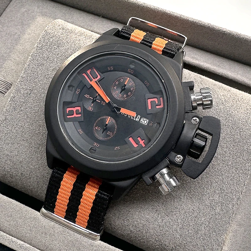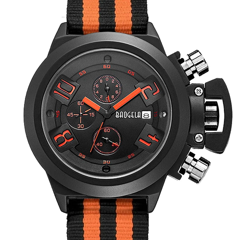 Baogela men's sports chronograph quartz watches fashion leather strap 24-hour display army wristwatch for man 1703Black