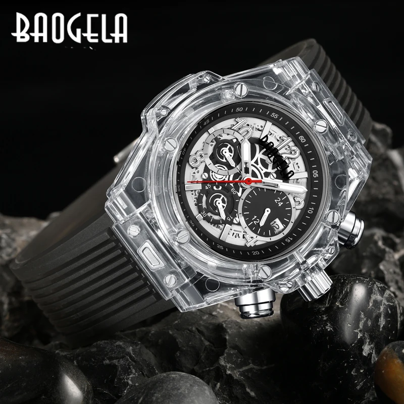 Baogela Luxury Men Watch Quartz Calendar Transparent Case Watches Sports Waterproof Wristwatch Male Relogio Male
