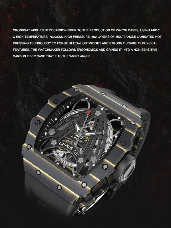 CRONUSART Men Automatic Watch 50MM Luxury Tonneau Mechanical Wristwatch Carbon Fibre Case Luminous Fluororubber Strap