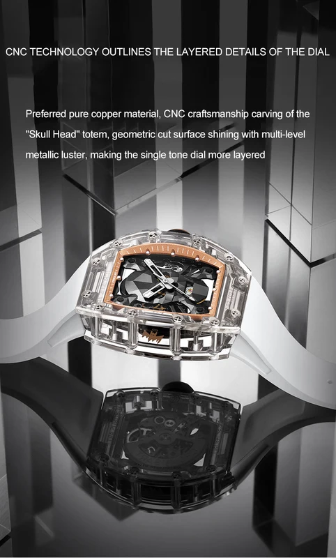 CRONUSART Men Automatic Watch 50mm*42mm Luxury Tonneau Mechanical Wristwatch Luminous Fluororubber Strap Hollow out Skull Dial