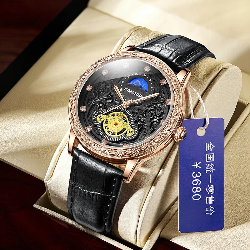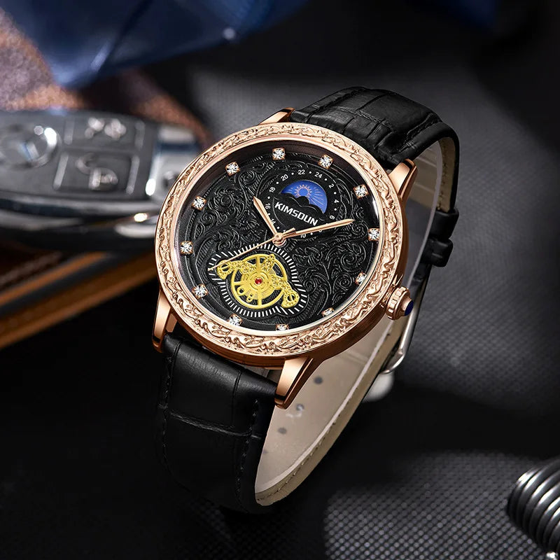 KIMSDUN brand new MEN watches carved lunar phase high-grade men's quartz watch Large Dial Leather Strap fashion man Wristwatch