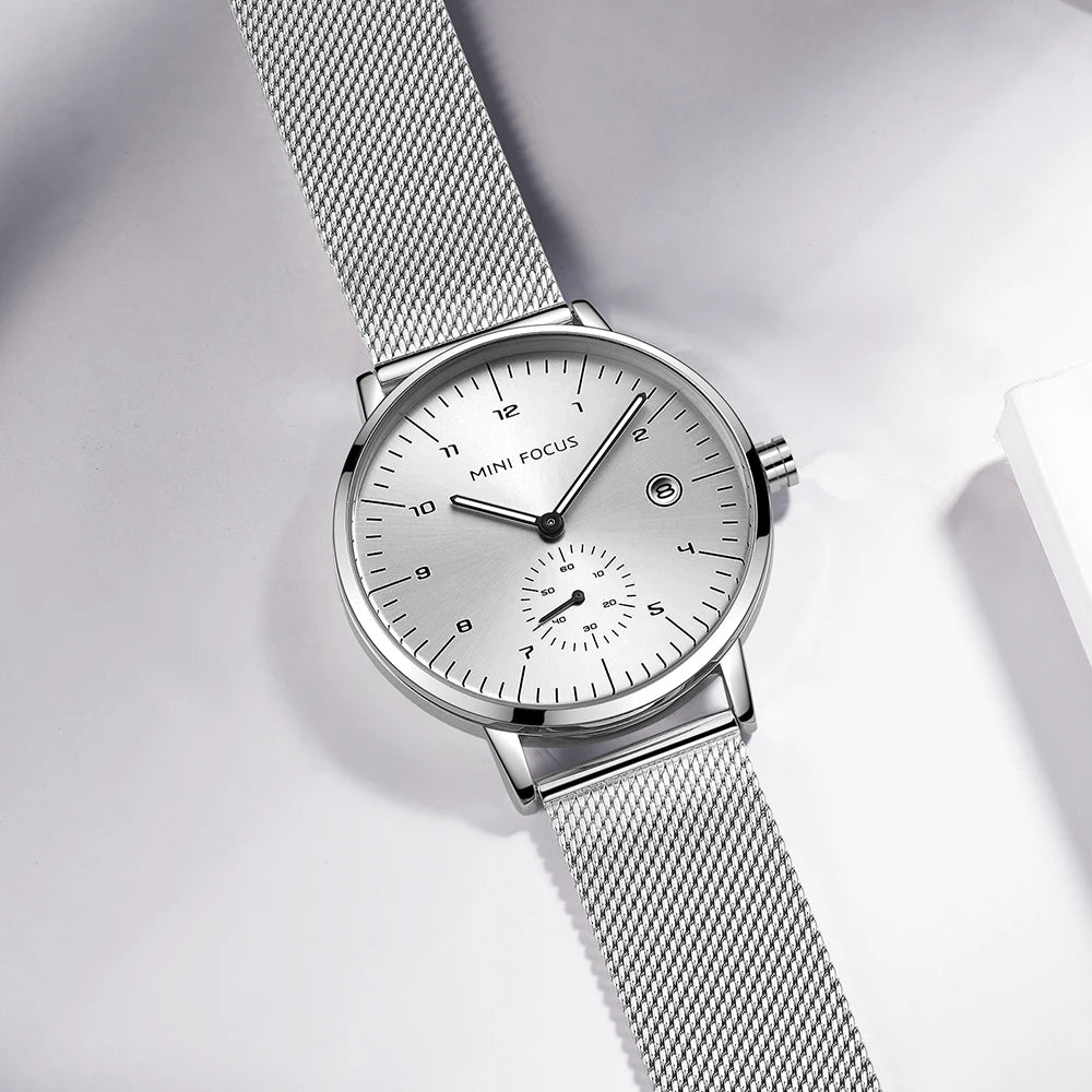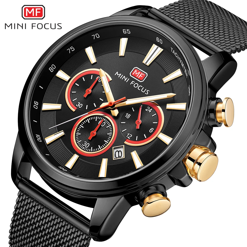 MINI FOCUS Top Brand Luxury Waterproof Watch for Men Multifunction Date Display Quartz Watches Mesh Stainless Steel Strap 0142G