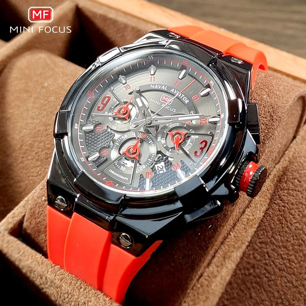 MINI FOCUS Chronograph Quartz Watch for Men Tonneau Dial Military Sport Wristwatch with Orange Silicone Strap Auto Date 0399