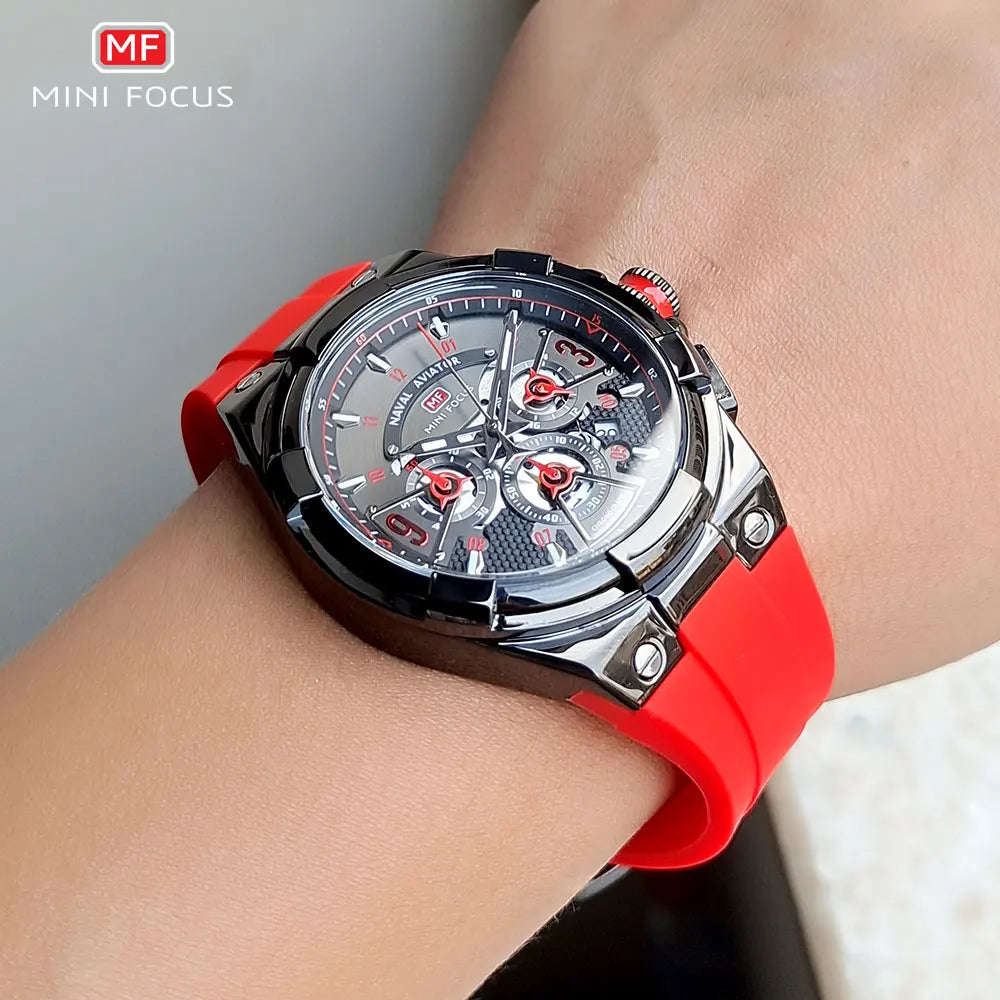 MINI FOCUS Red Watch for Men Fashion Luxury Chronograph Quartz Wristwatch with Silicone Band Luminous Hands Date Waterproof 0350