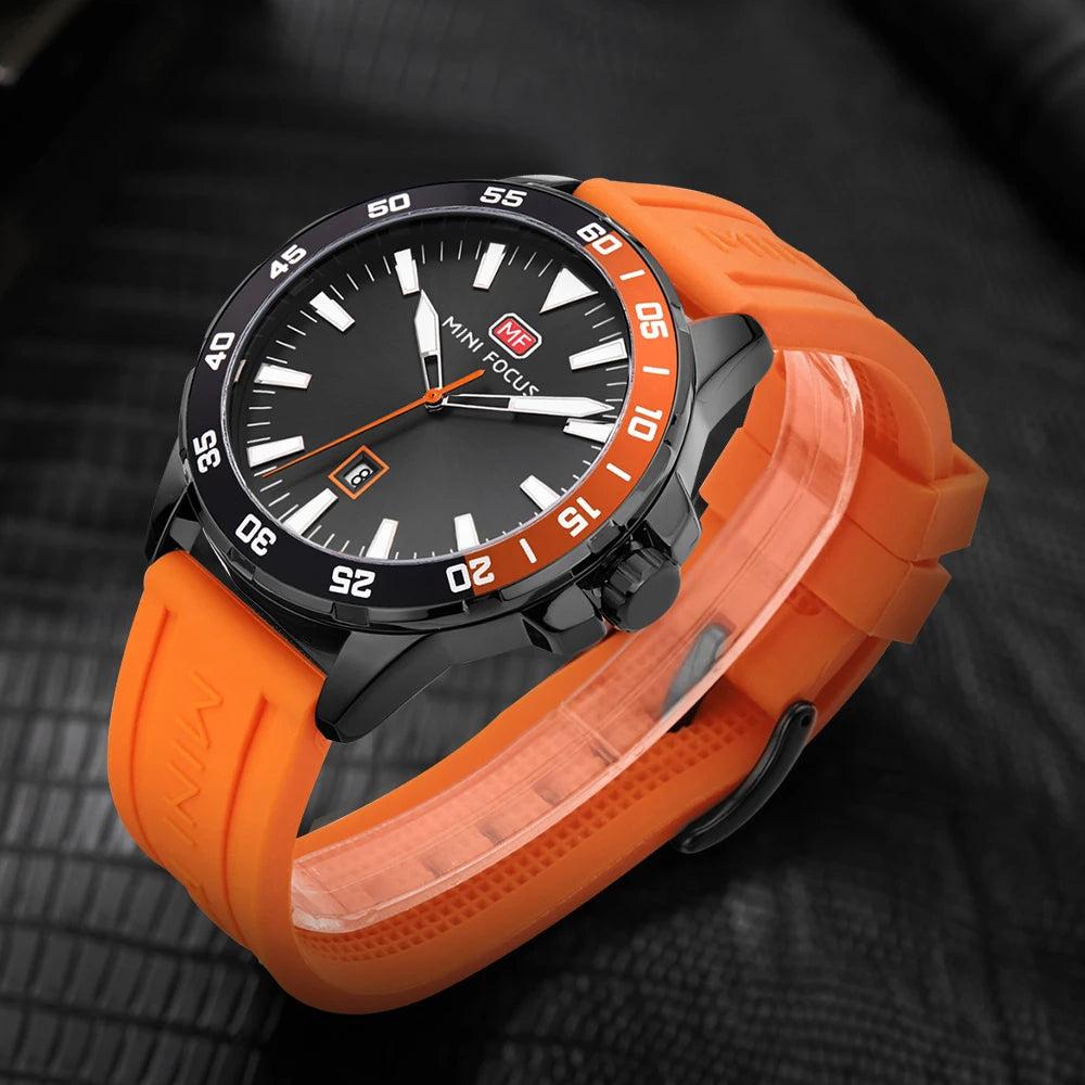MINI FOCUS Business Mens Quartz Wristwatches Luminous Hands Calendar Orange Casual Silicone Strap Fashion Luxury Brand Men Watch