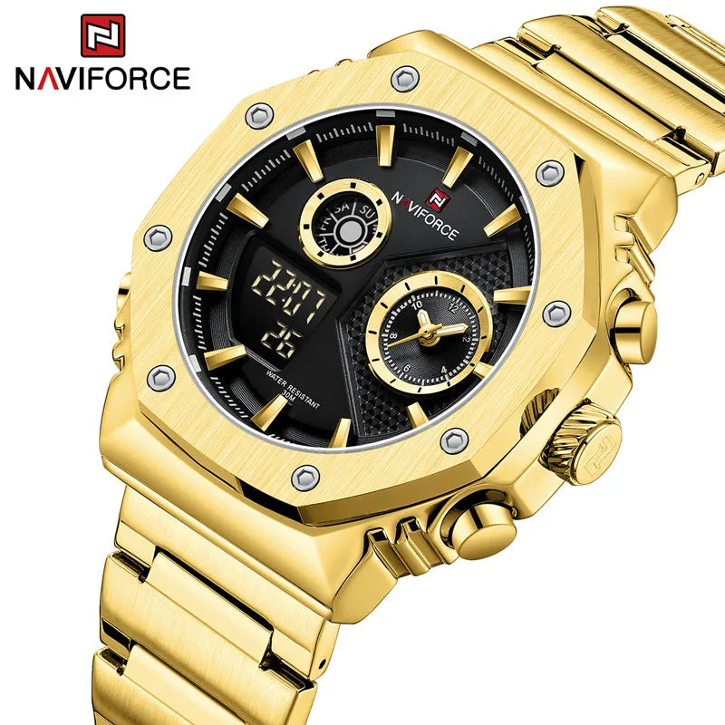 NAVIFORCE Men's Sport Watch Stainless Steel Strap Waterproof Quartz Wristwatch Male LCD Display Durable Clock Relogio Masculino