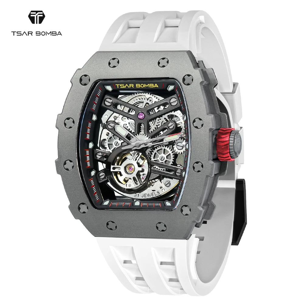 TSAR BOMBA Automatic Watch Men Carbon Fiber Mechanical Wristwatch Skeleton Clock Mens Tonneau Luxury Watches