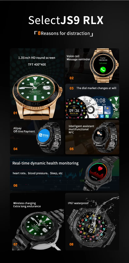 Js9 RLX Smart Watch Offline Payment NFC Wireless Charger Heart Rate Blood Pressure Blood Oxygen