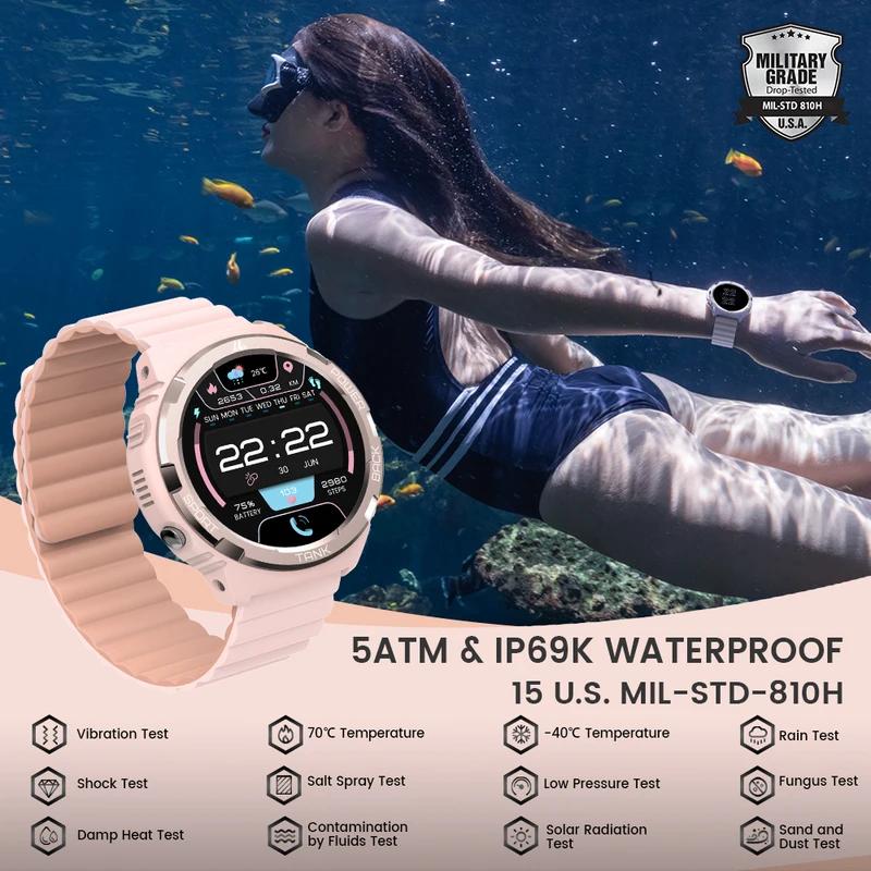 KOSPET Tank S1 is made of military-grade sixth-generation aviation aluminum, strong and corrosion-resistant, ultra-thin and ergonomic shell, its waterproof level reaches 5ATM, and there are up to 70 sports modes for women's smart watches , such as yoga, swimming, elliptical machine, etc. At the same time, it also realizes 6 kinds of sports intelligent recognition, no need to manually enter the sports mode.