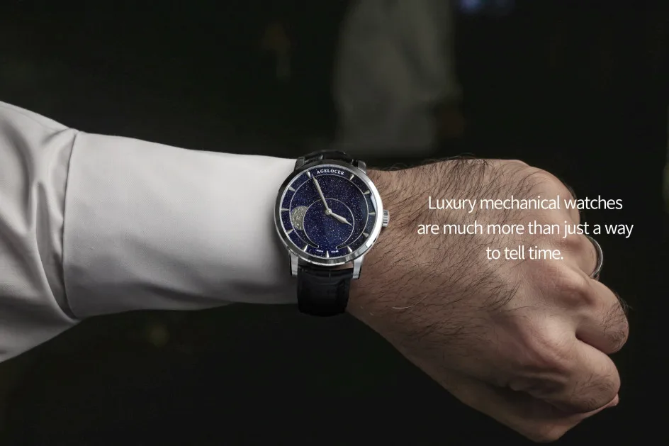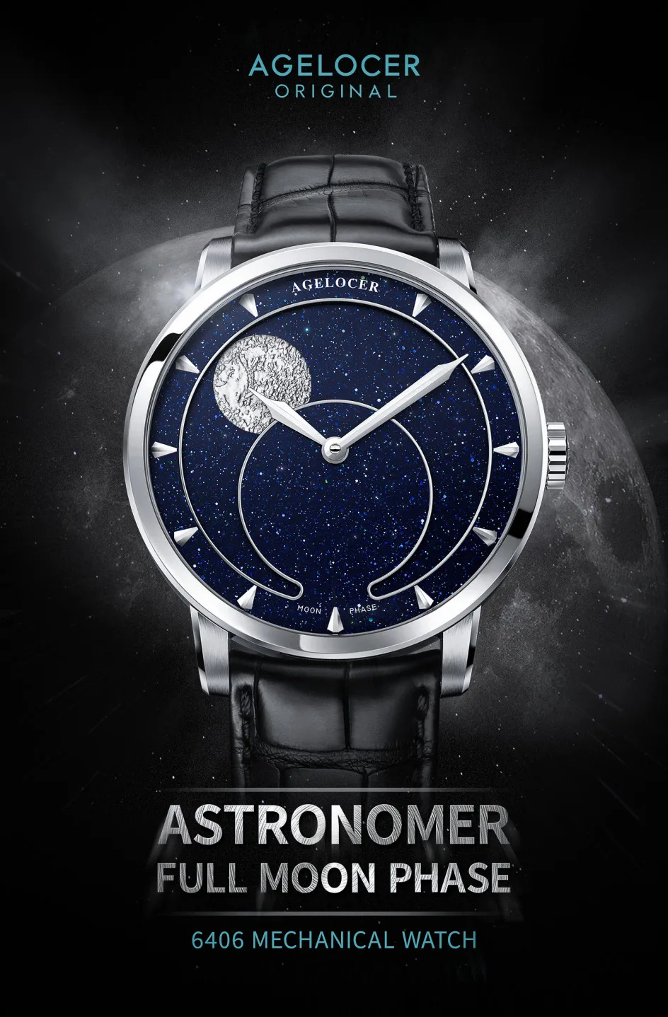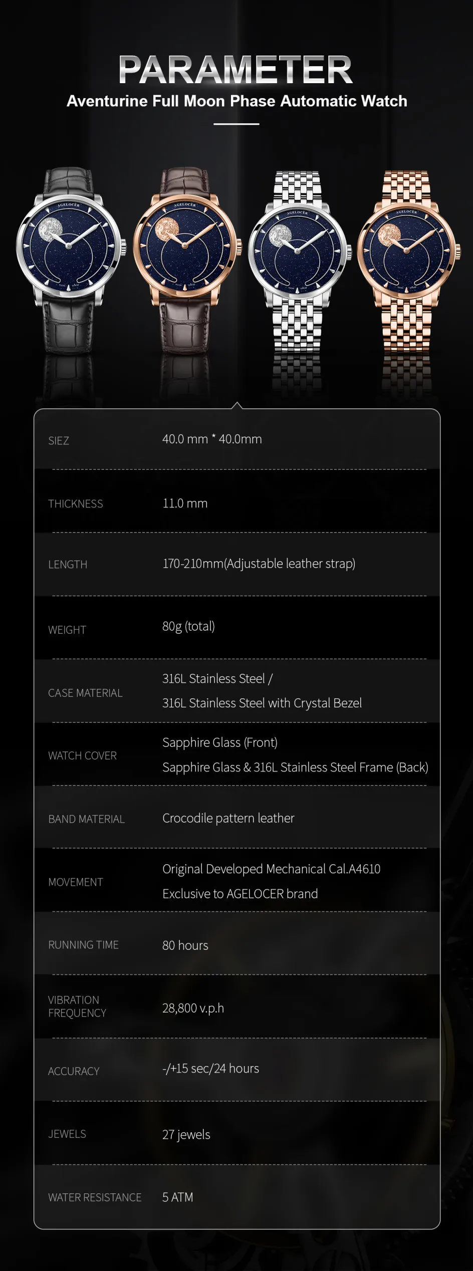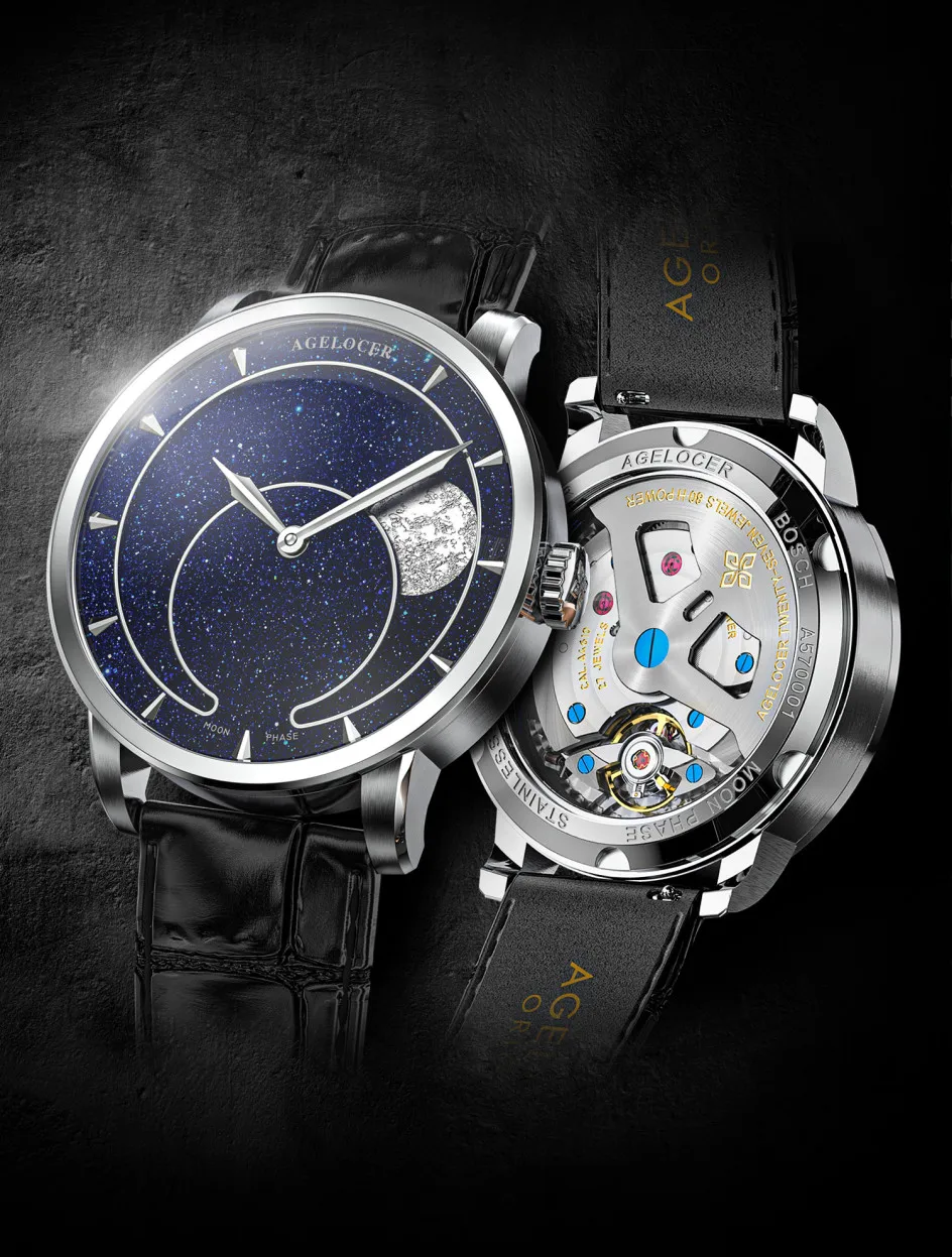 AGELOCER Men's Watch Blue Moon Phase Dress New Stainless Steel Automatic Mechanical Luxury Fashion WristWatch