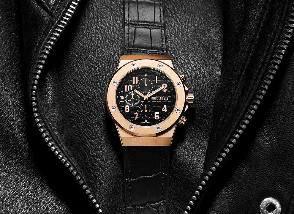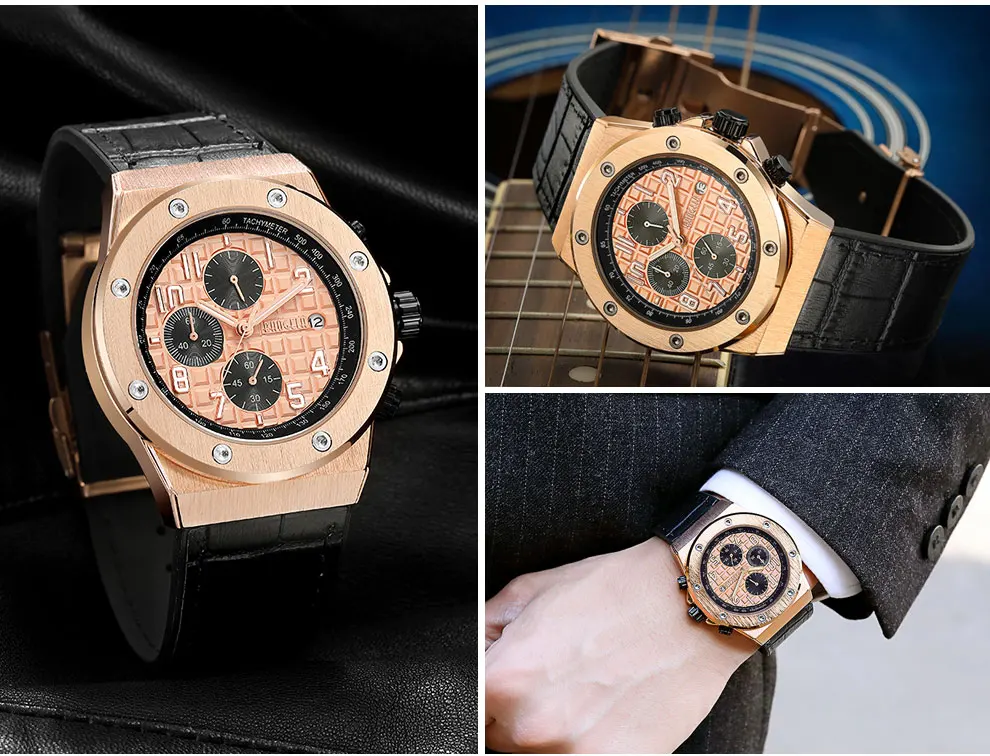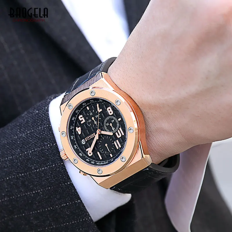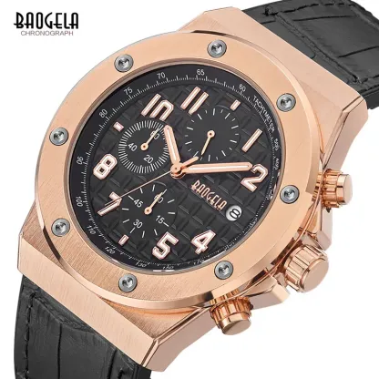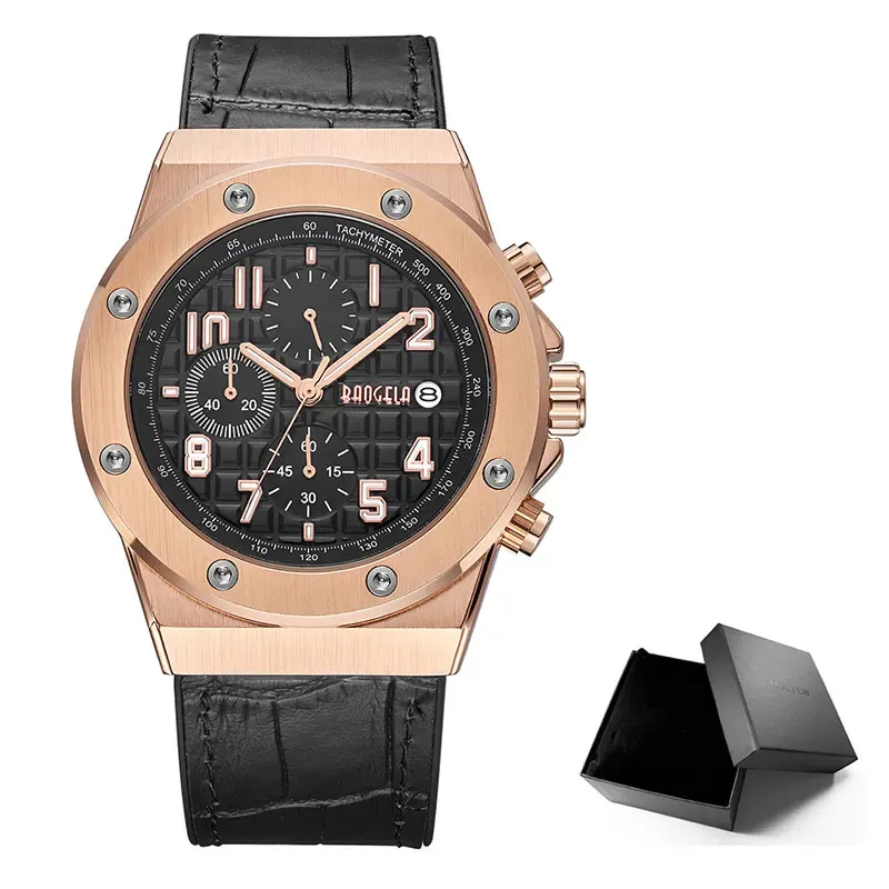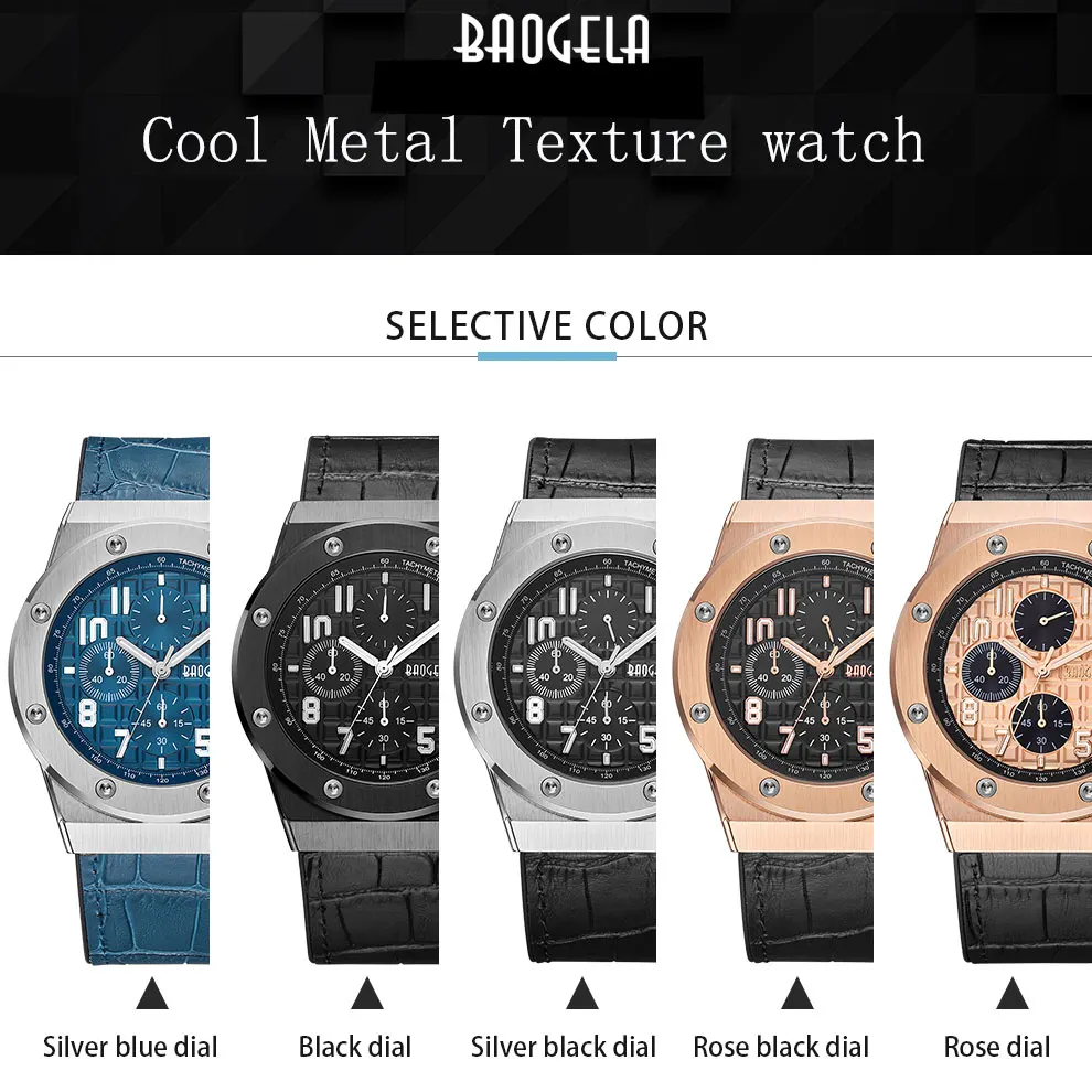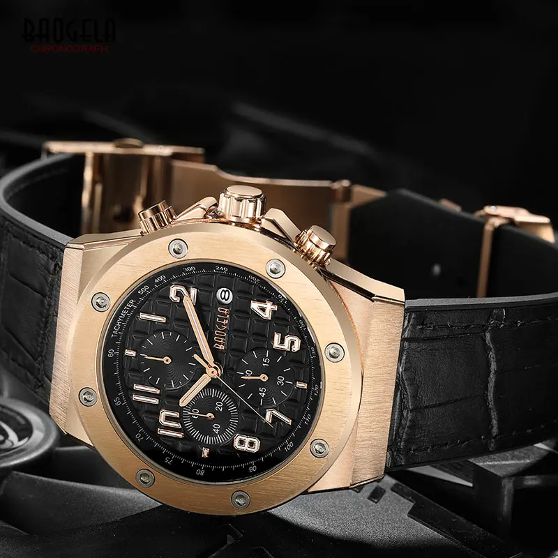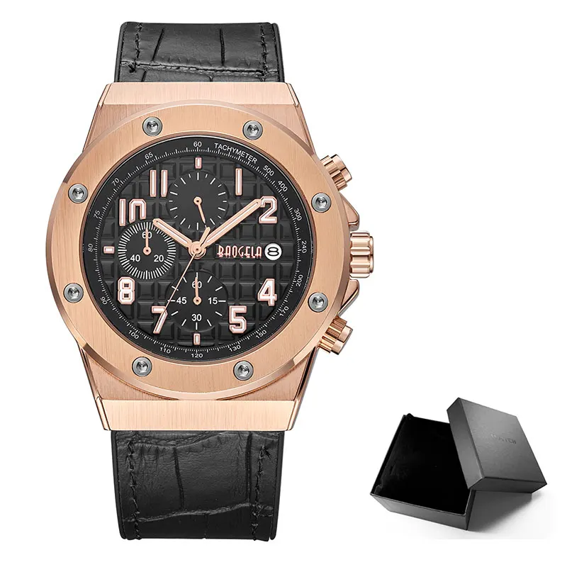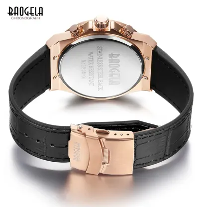 BAOGELA Men's Chronograph Quartz Watches 2019 New Waterproof Sports Casual Wrist Watch Man Leather Strap Clock 1805 Rose black