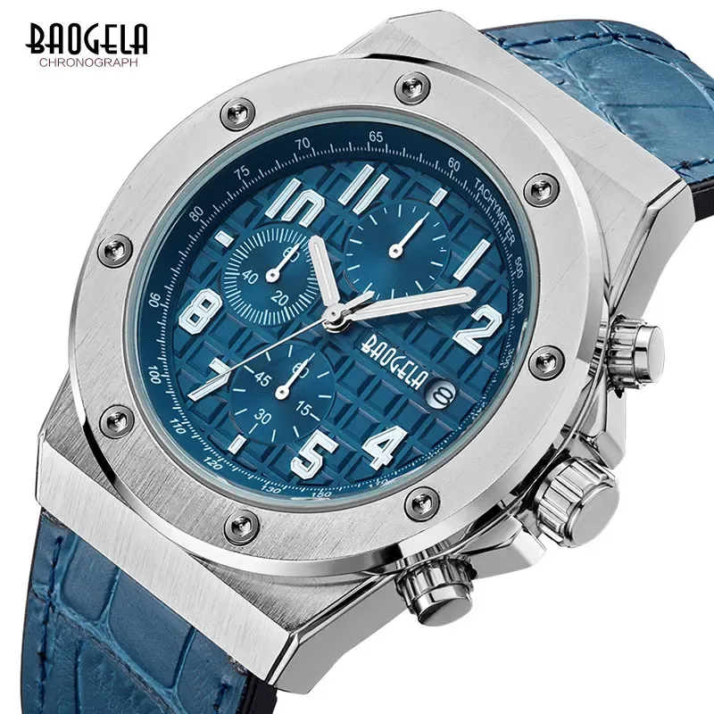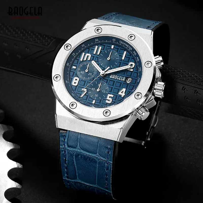 BAOGELA Men's New Quartz Watches 2019 Waterproof Chronograph Casual Luminous Wrist Watch Man Leather Strap Relogios 1805 Blue