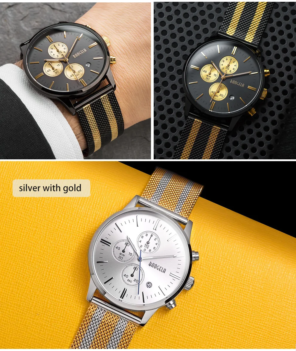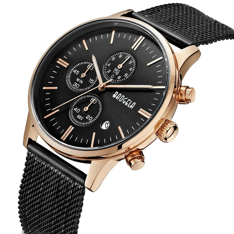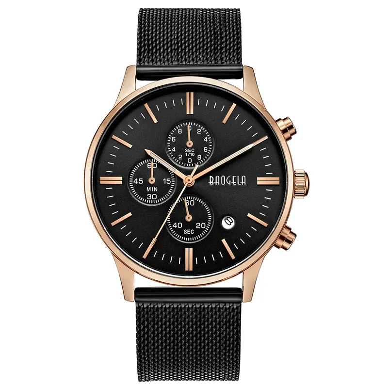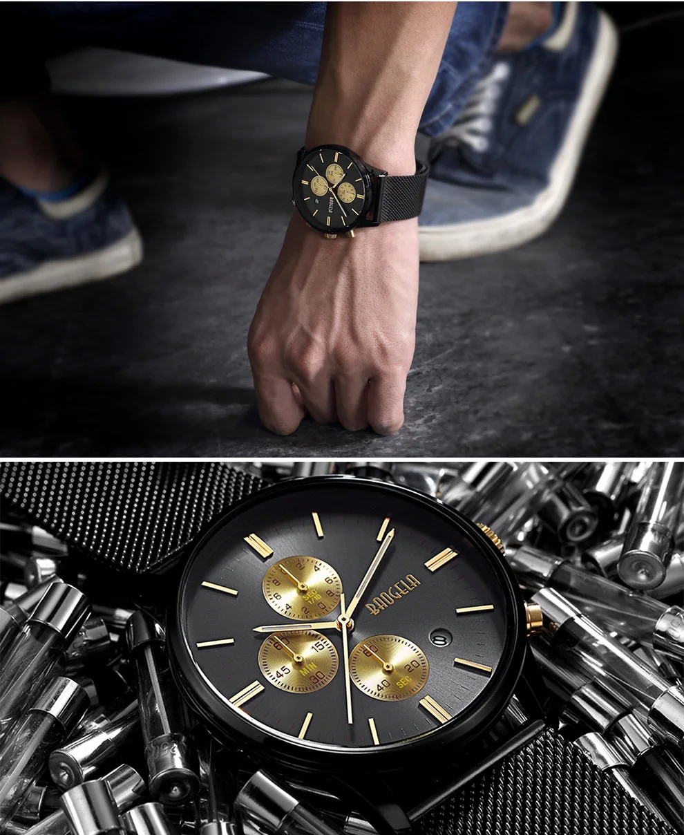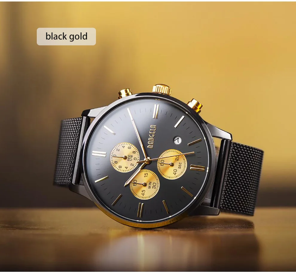 BAOGELA Men's Watch Waterproof Analog Quartz Wrist Watches Gold With Black Stainless Steel Mesh Band, Chronograph Date 1611