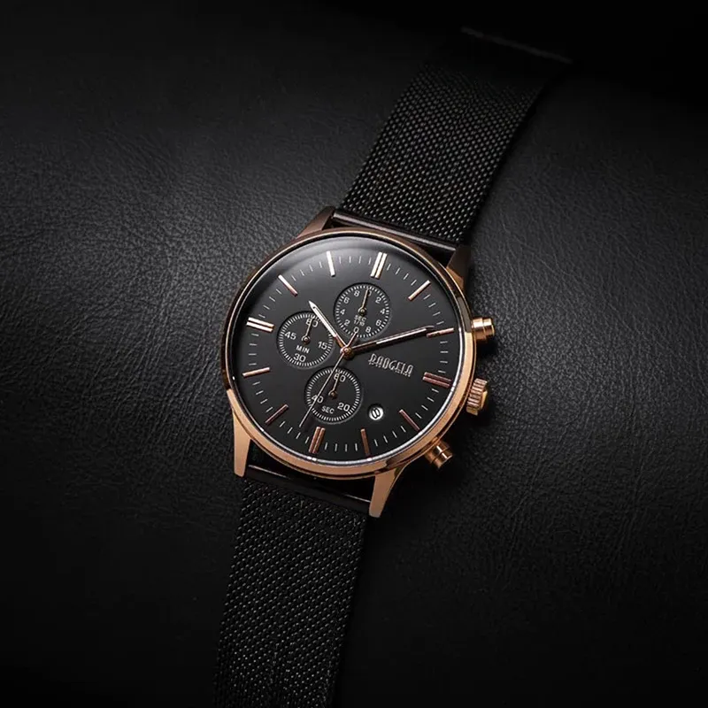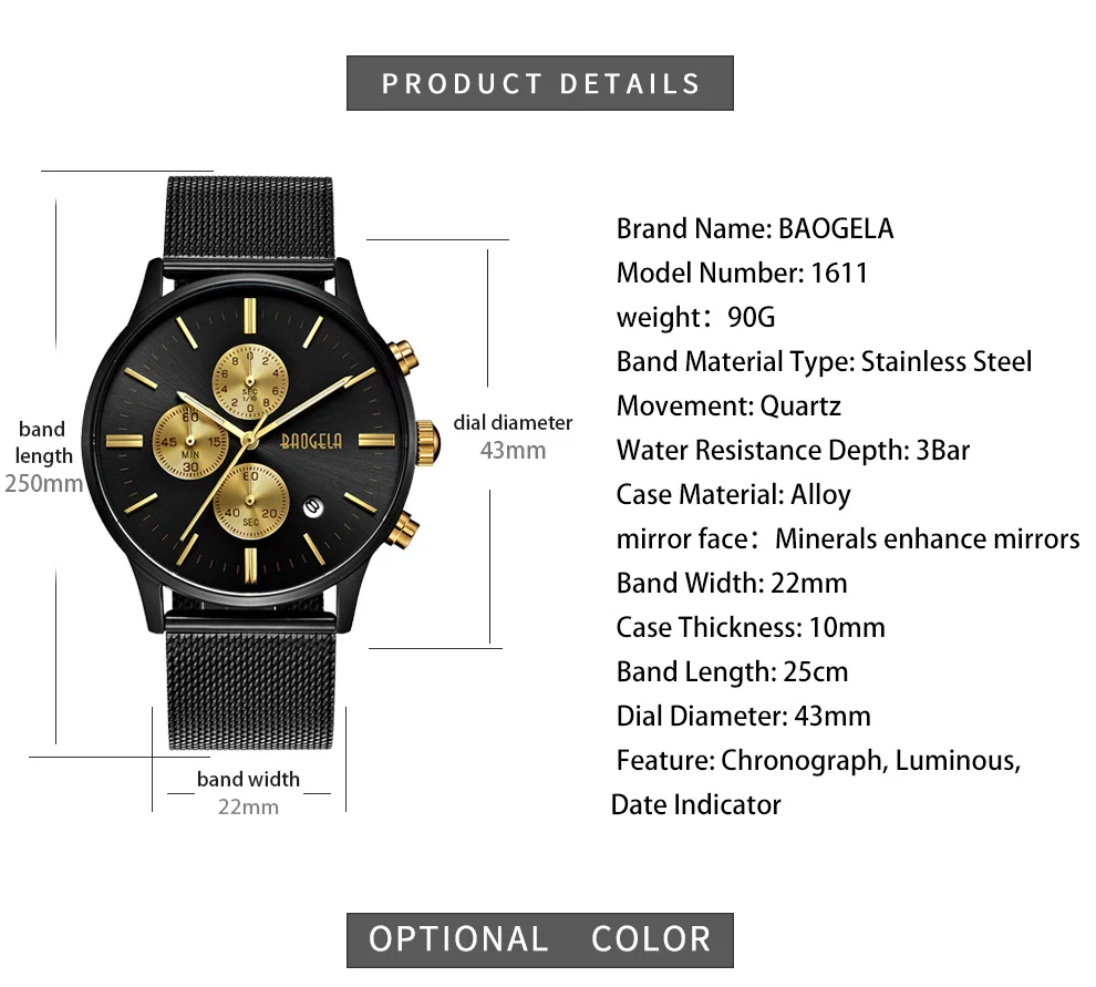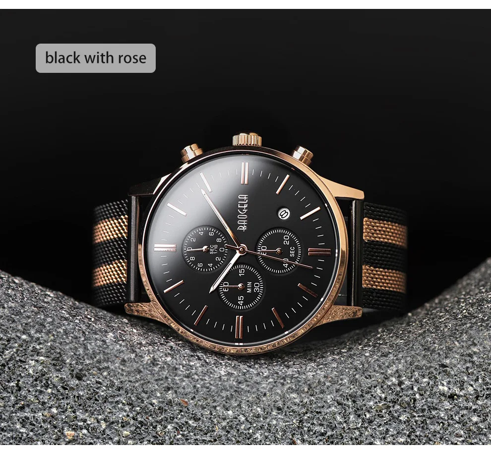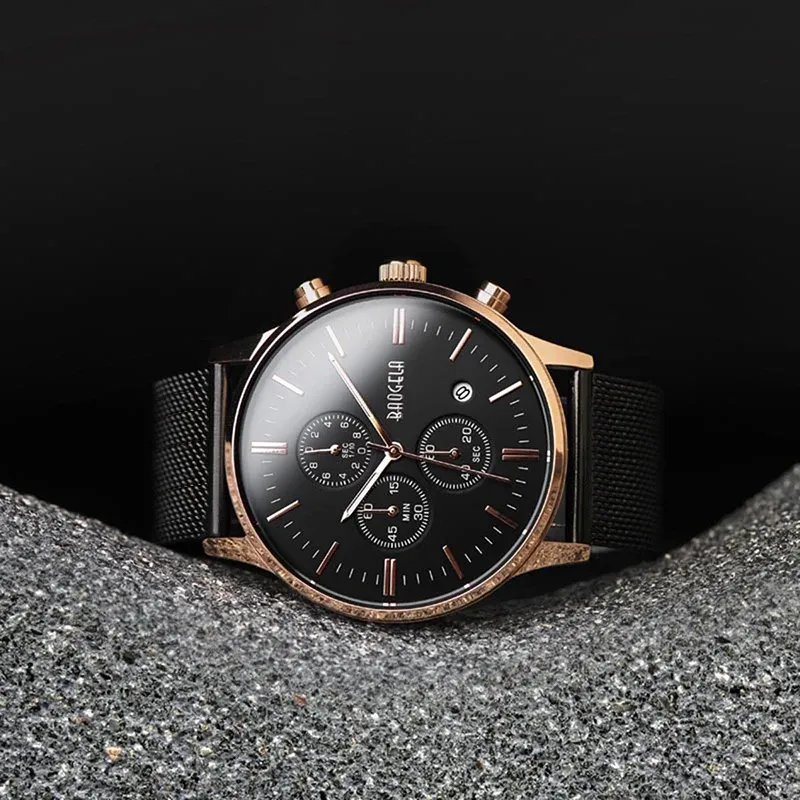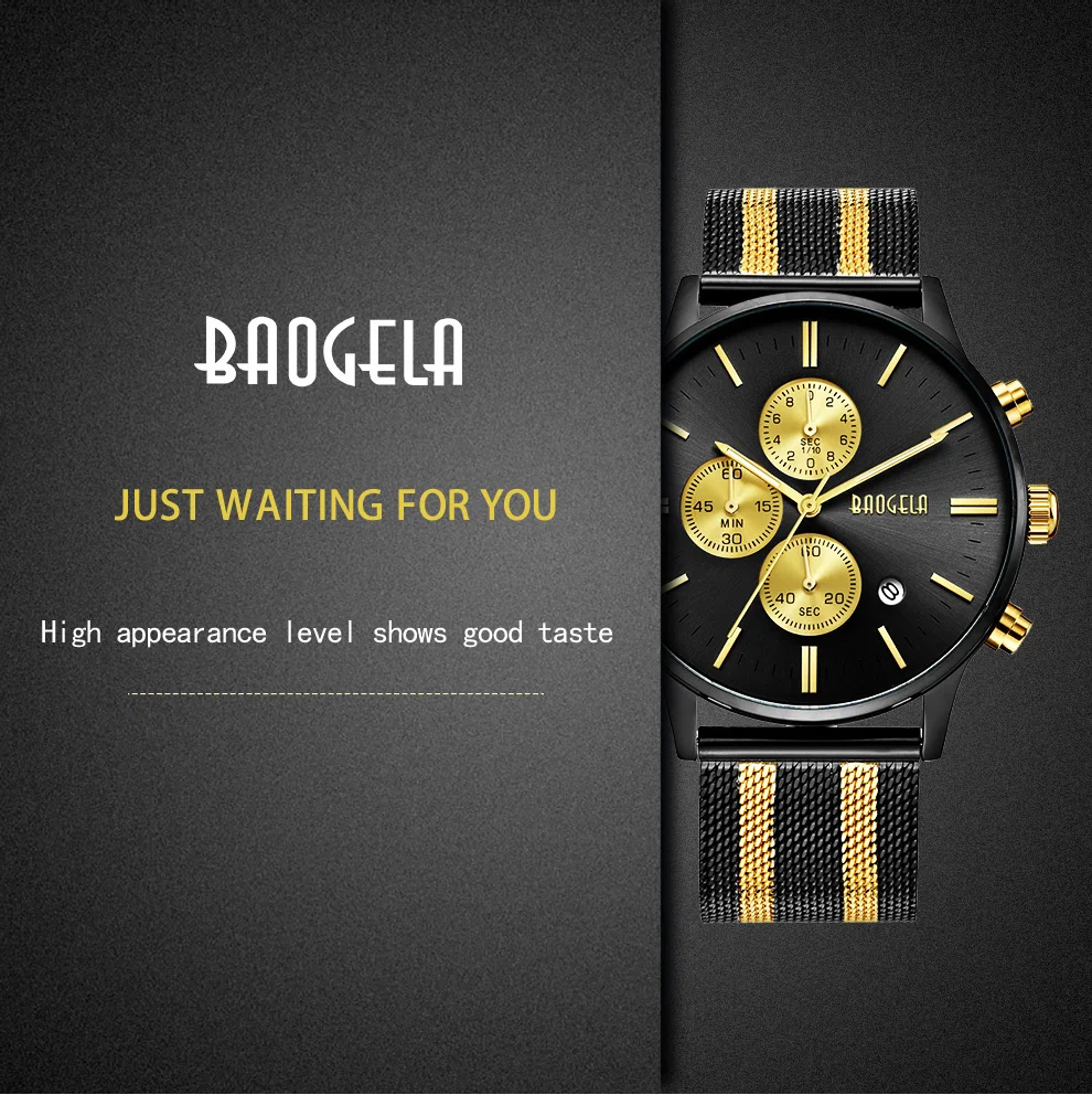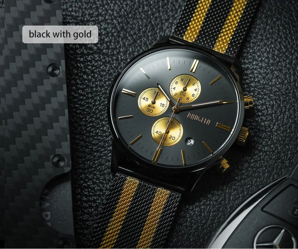 BAOGELA Men's Watch Waterproof Analog Quartz Wrist Watches Gold With Black Stainless Steel Mesh Band, Chronograph Date 1611