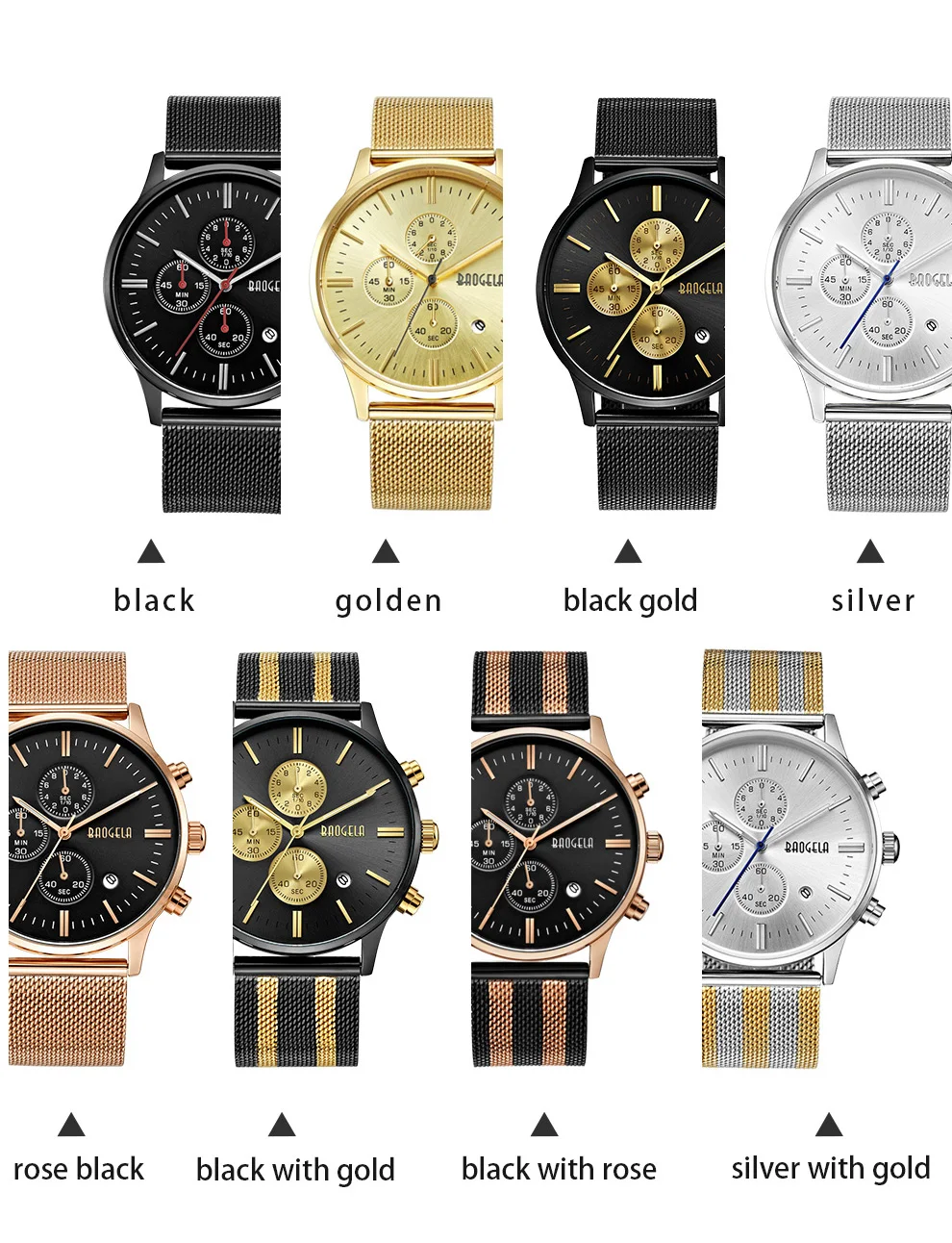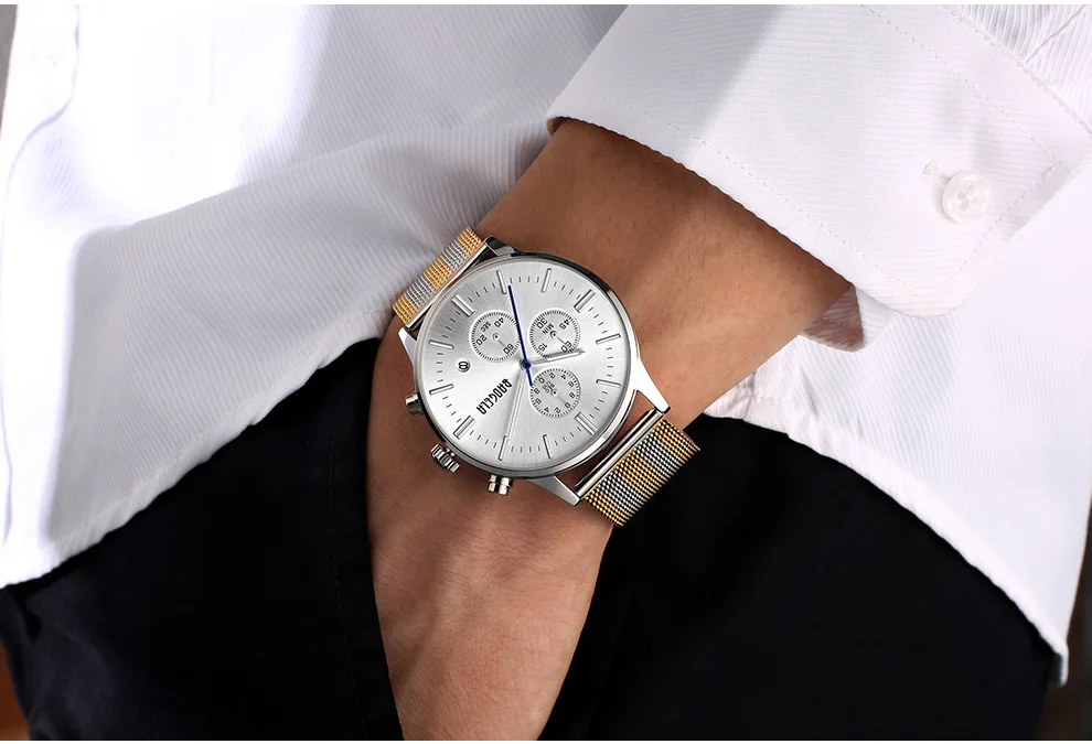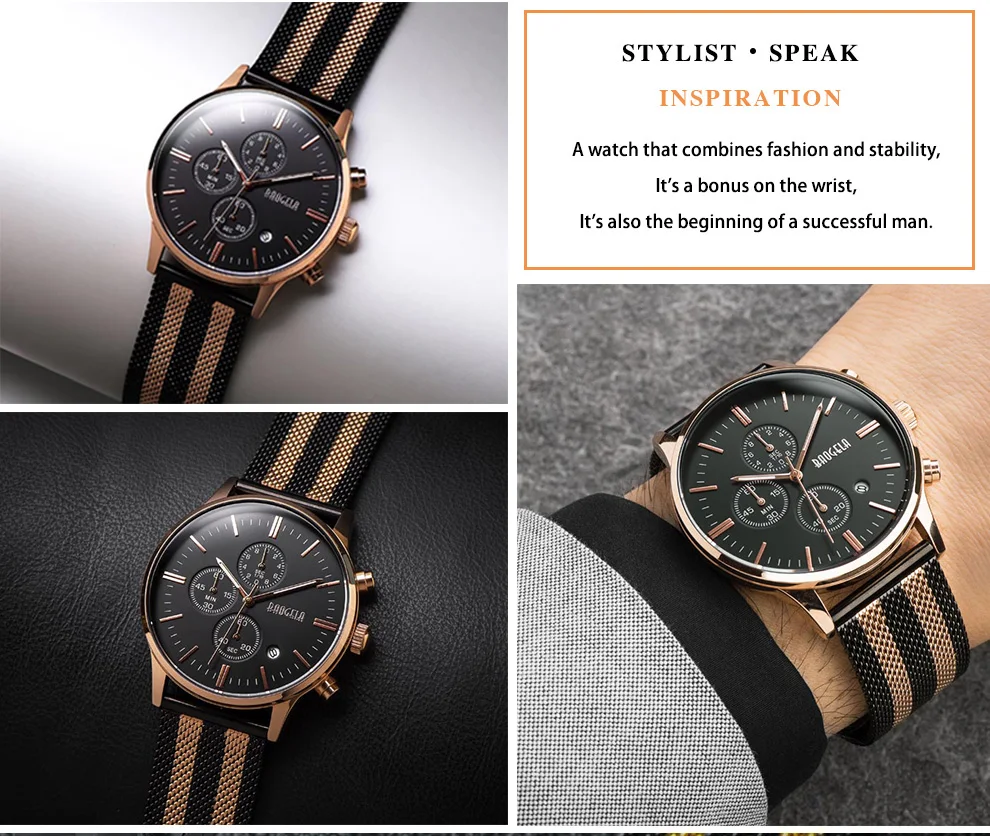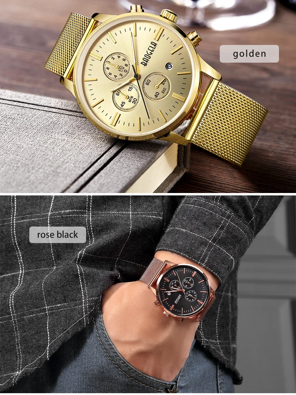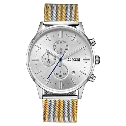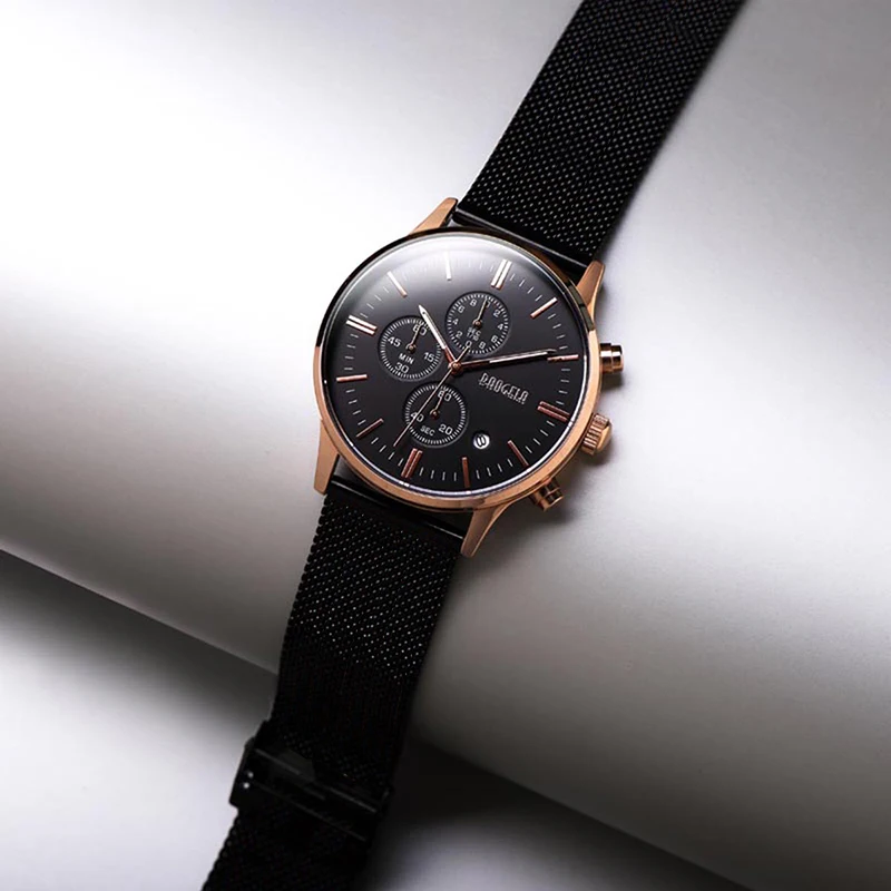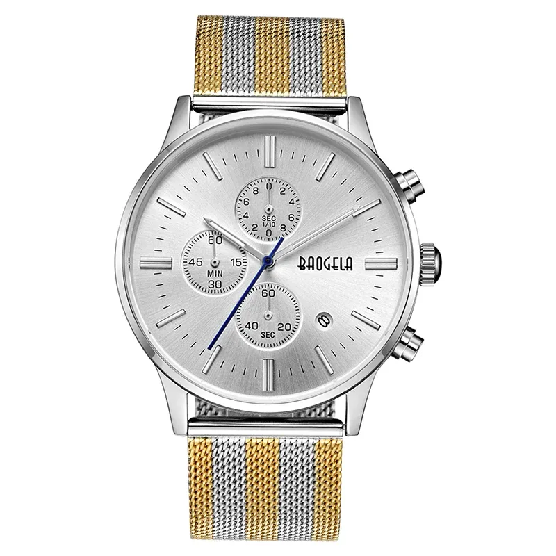 BAOGELA Men's Watch Waterproof Analog Quartz Wrist Watches Gold With Black Stainless Steel Mesh Band, Chronograph Date 1611