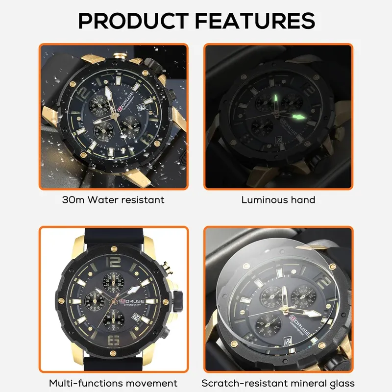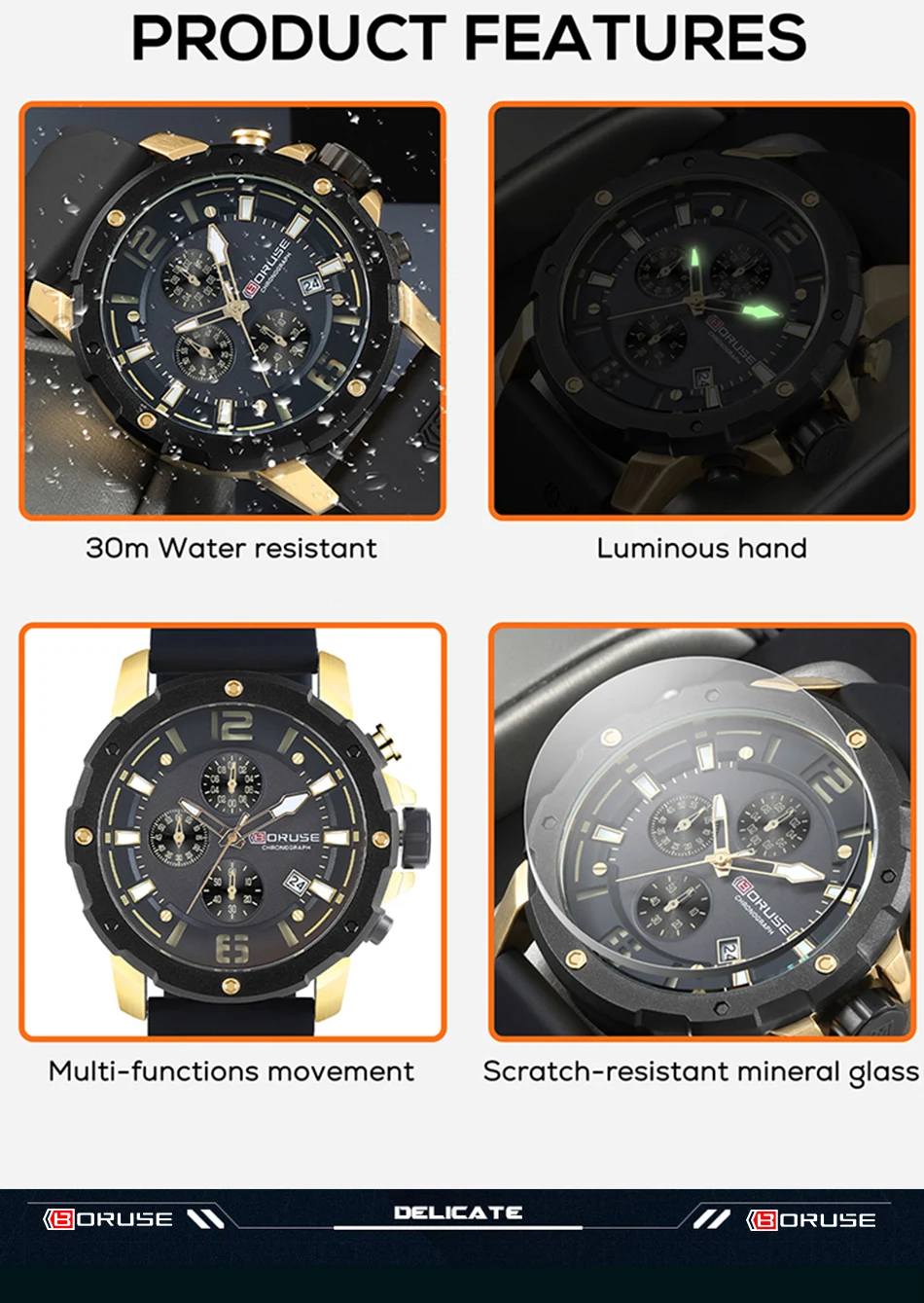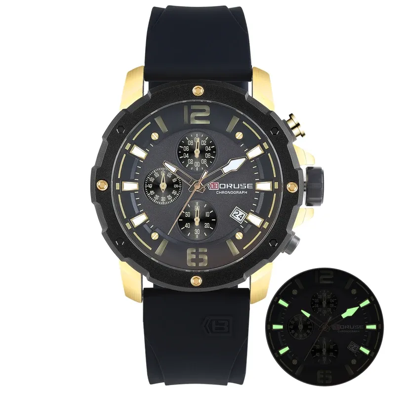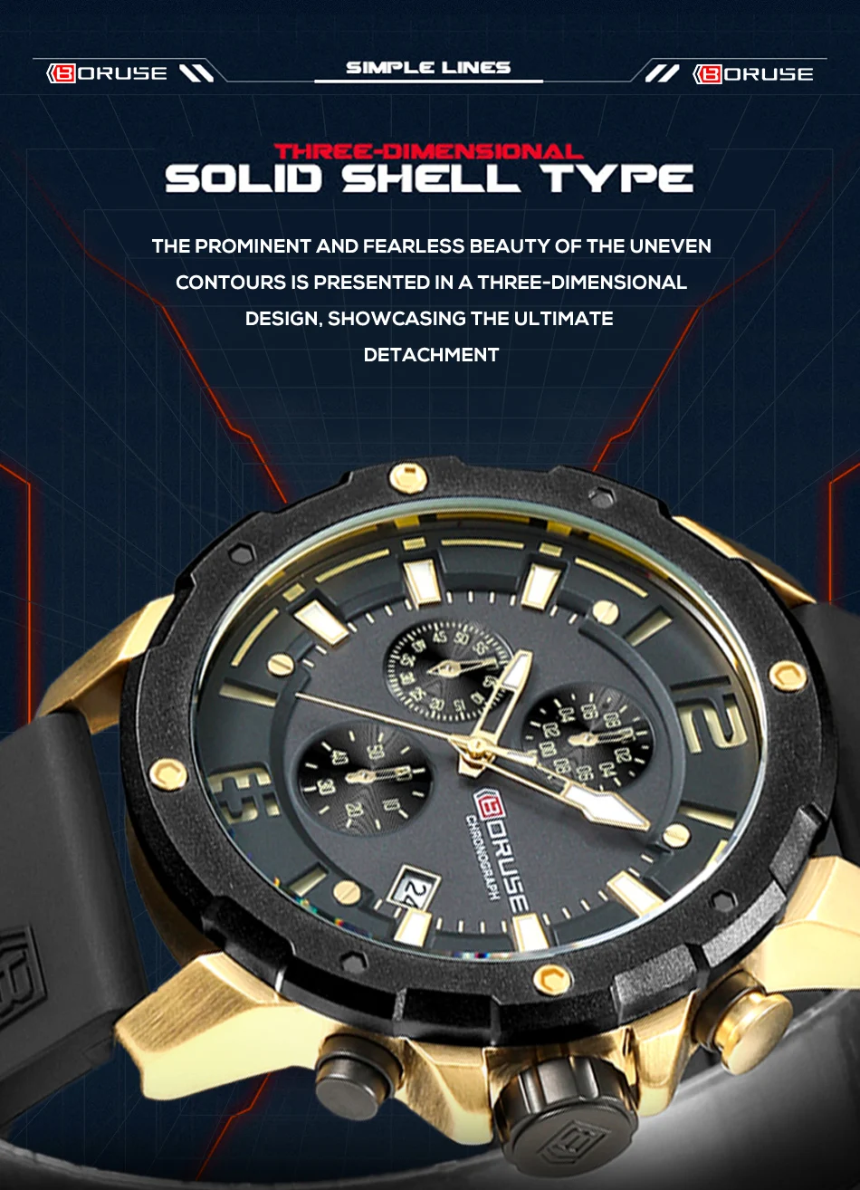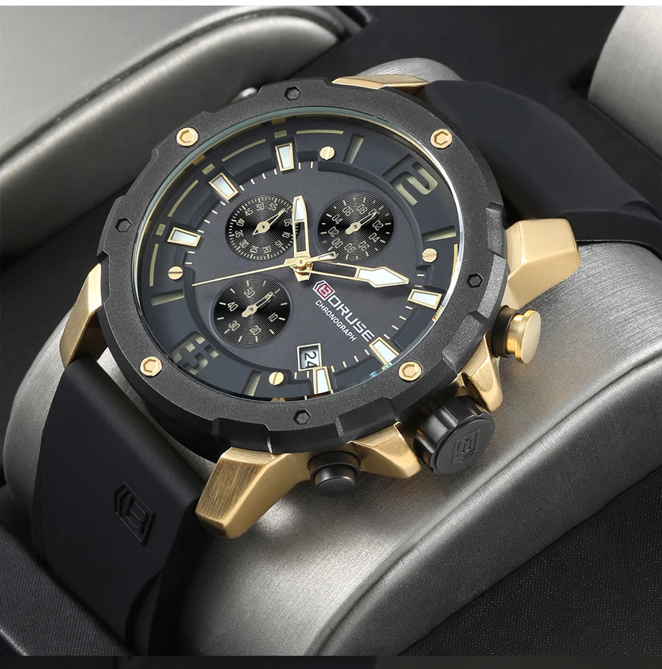 Boruse fashion mens watches top brand black gold quartz watch man silicone Chronos business wrist watches waterproof