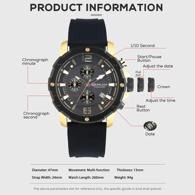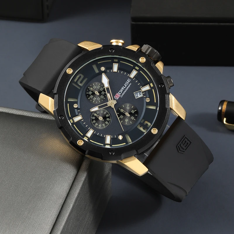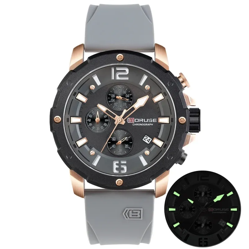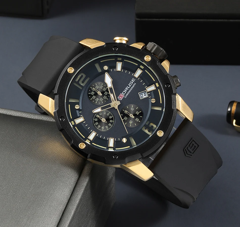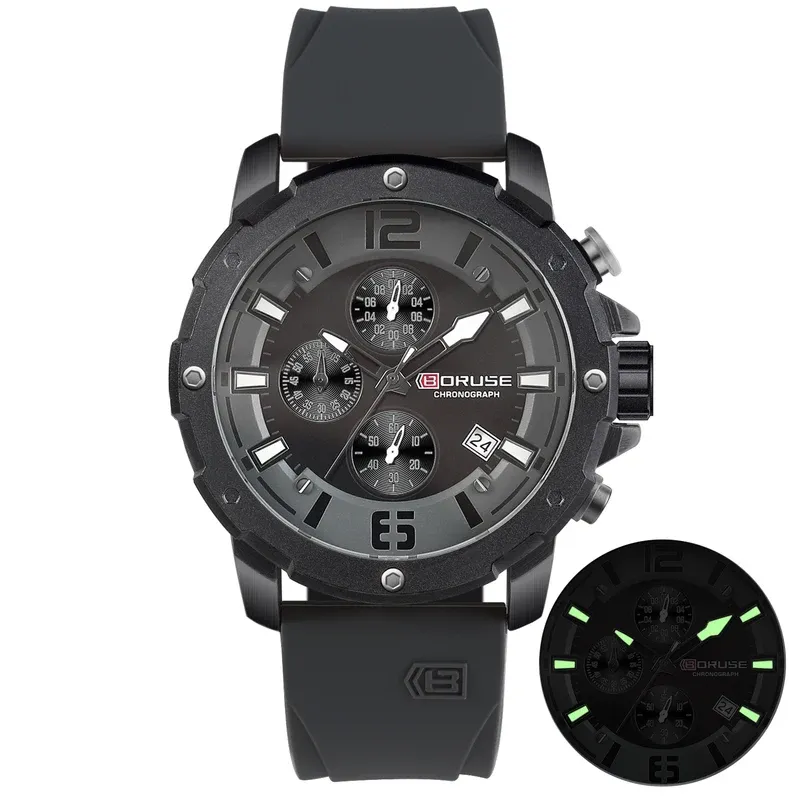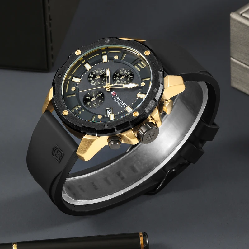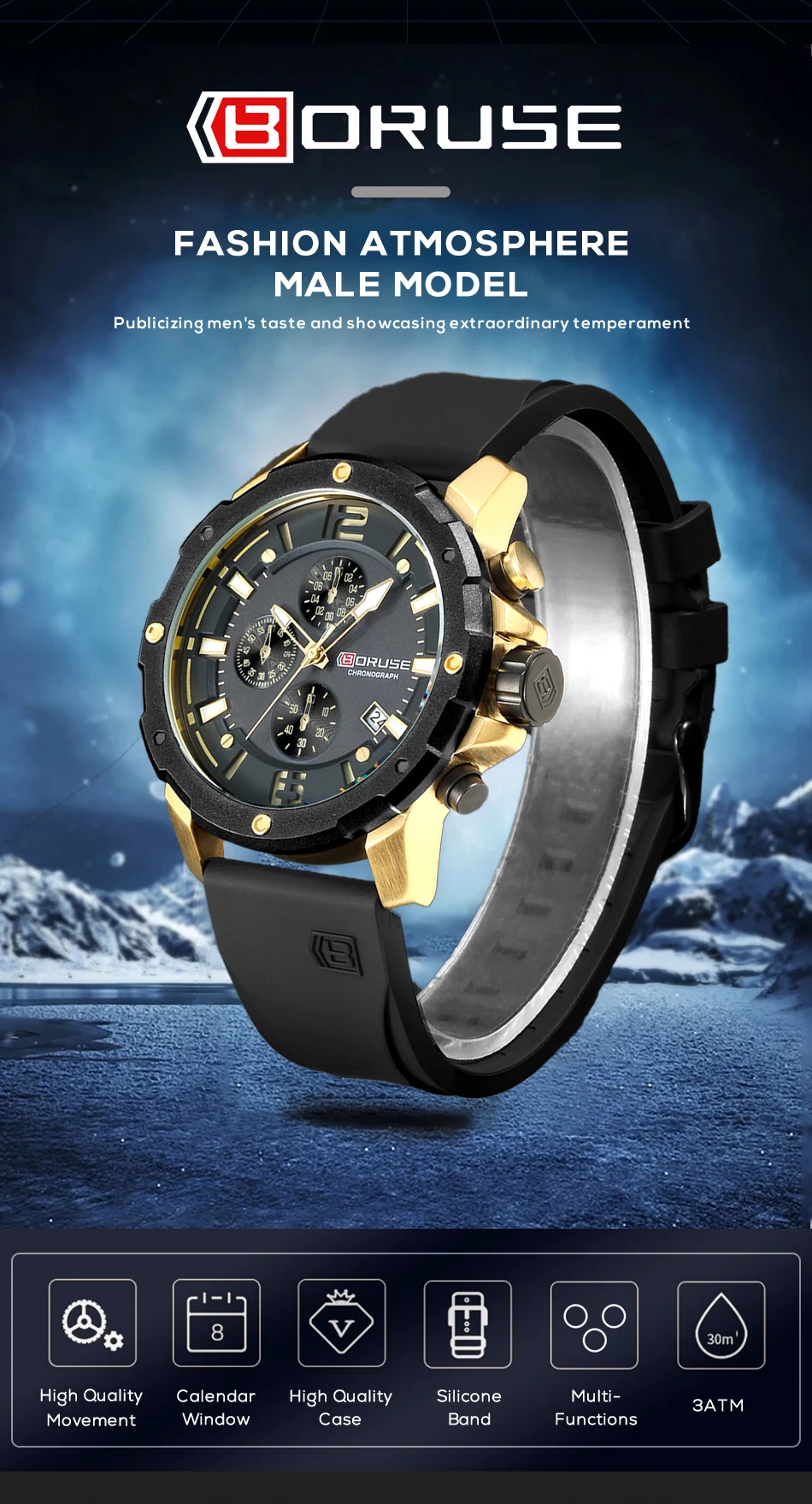 Boruse fashion mens watches top brand black gold quartz watch man silicone Chronos business wrist watches waterproof