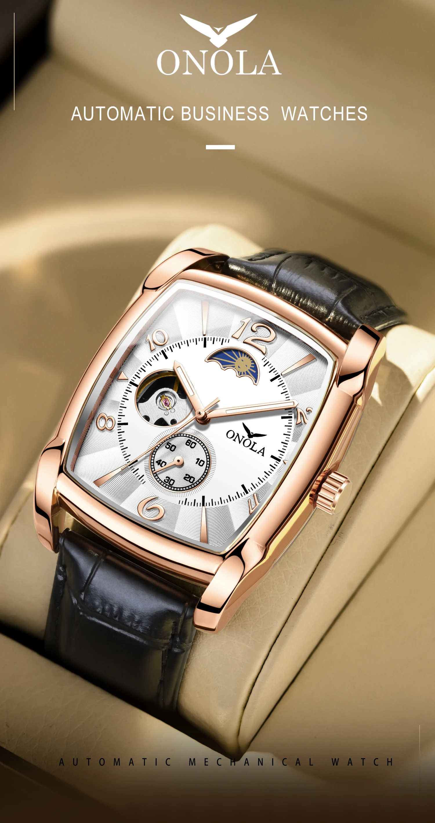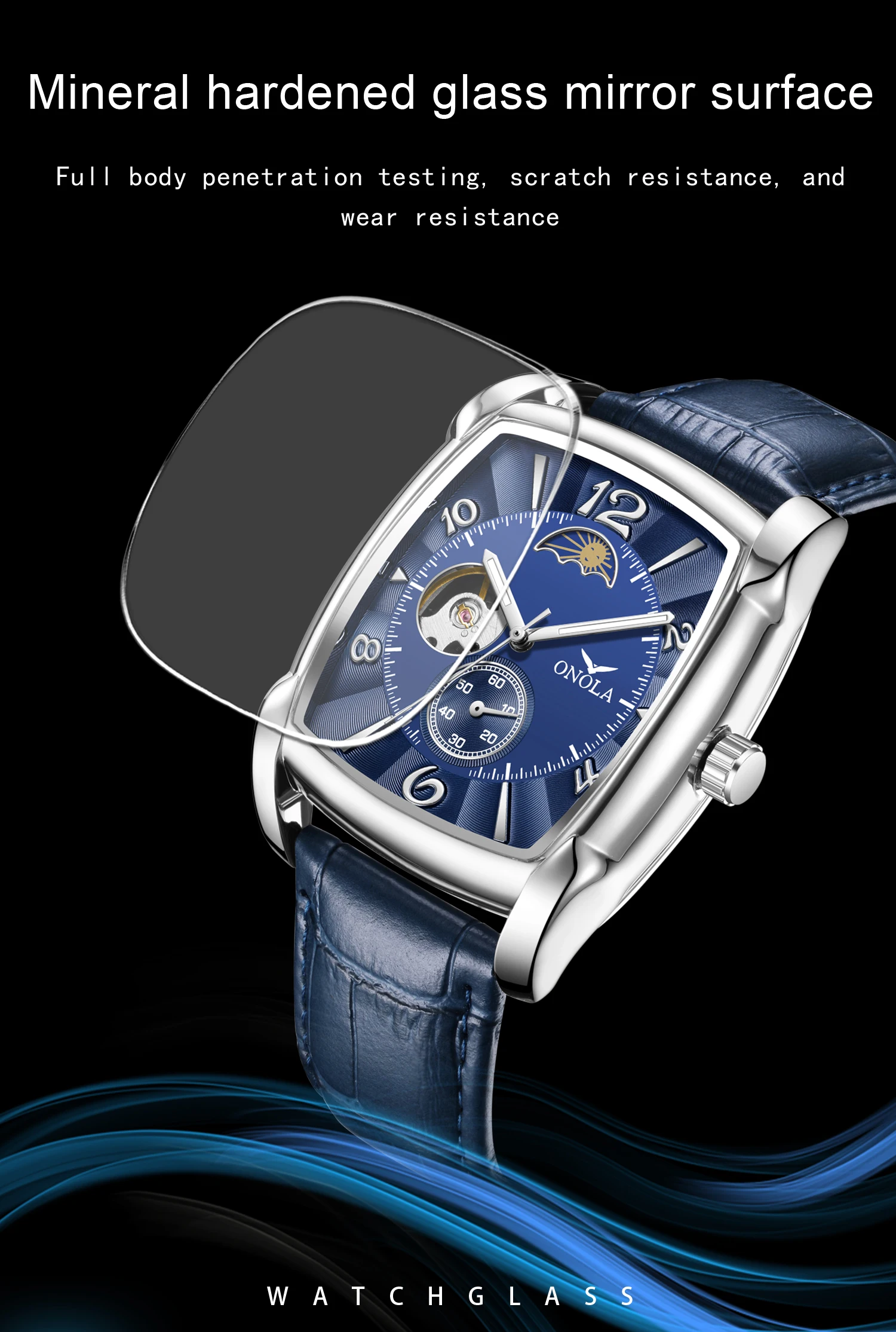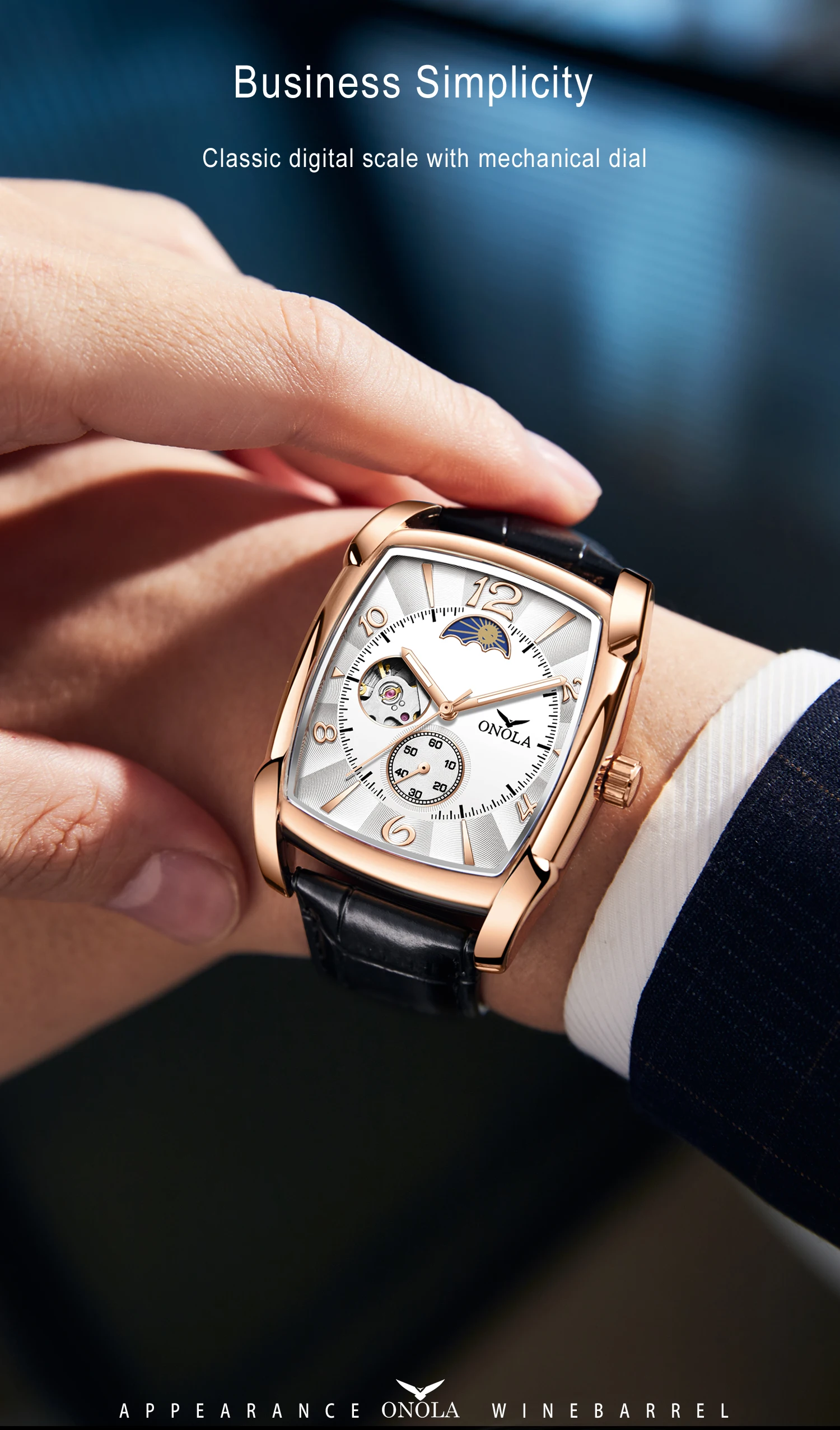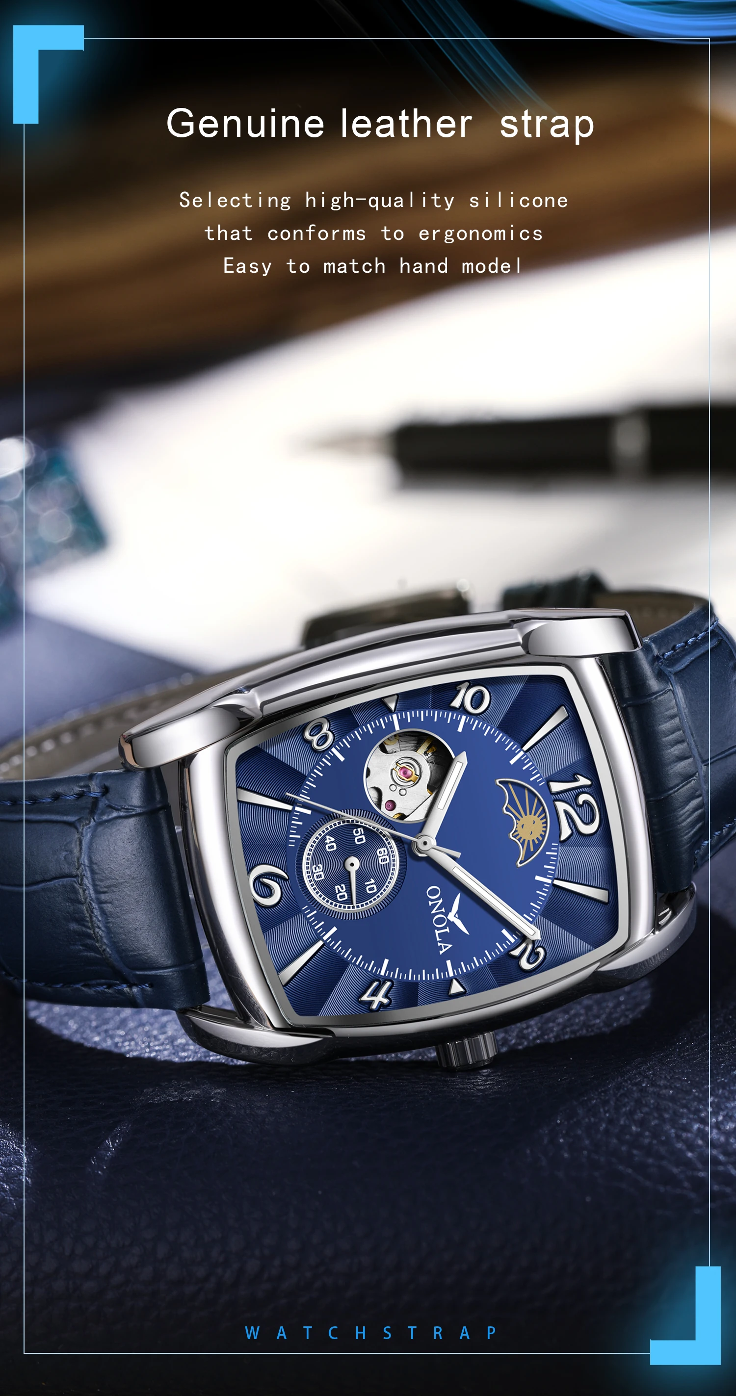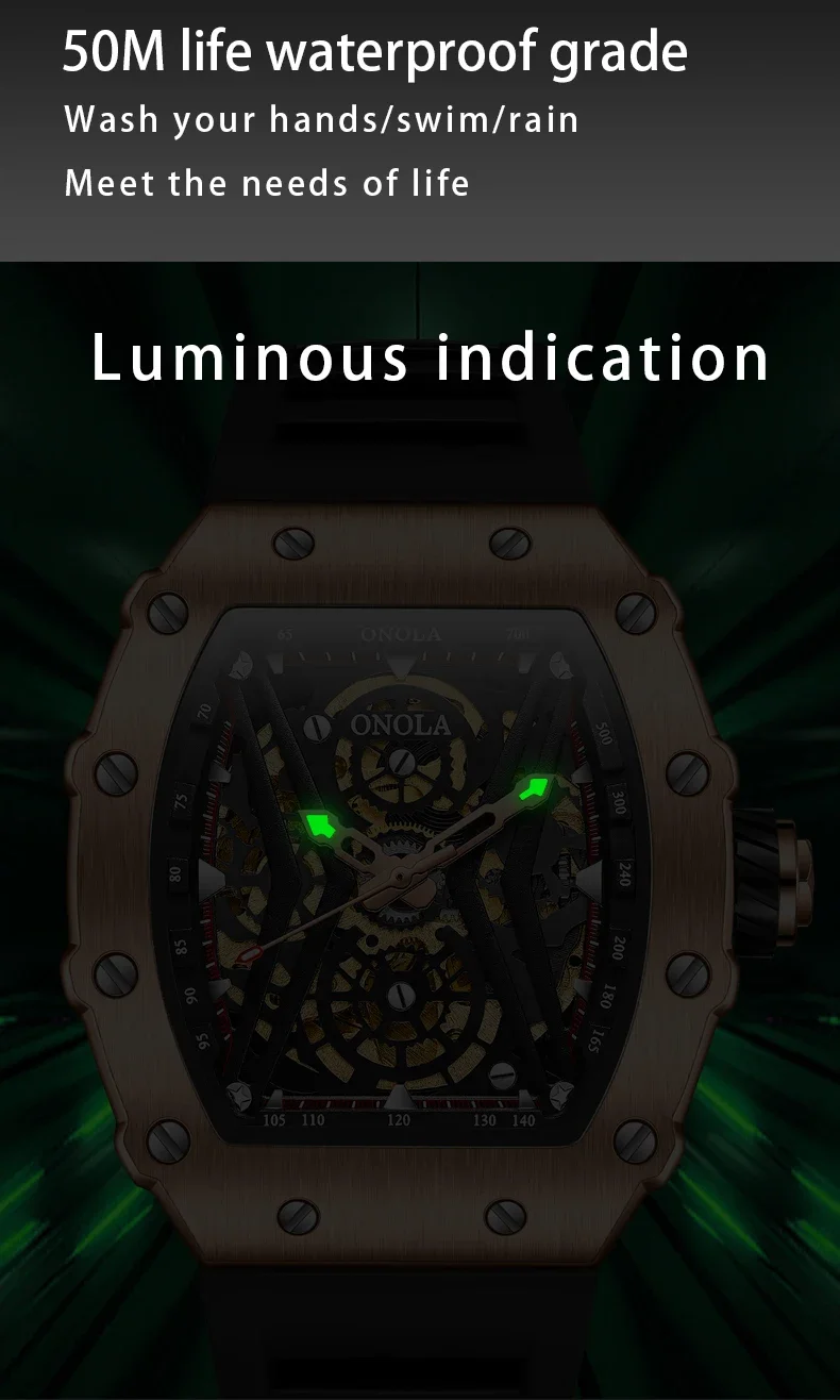 Brand ONOLA Top Luxury Fashion Men's Watches Luminous Square Mechanical Skeleton Sport Waterproof Male Automatic Watch Men