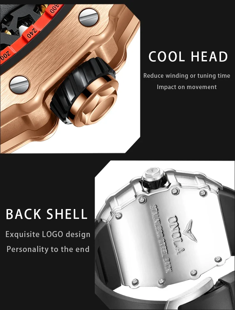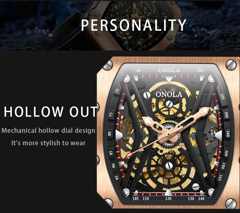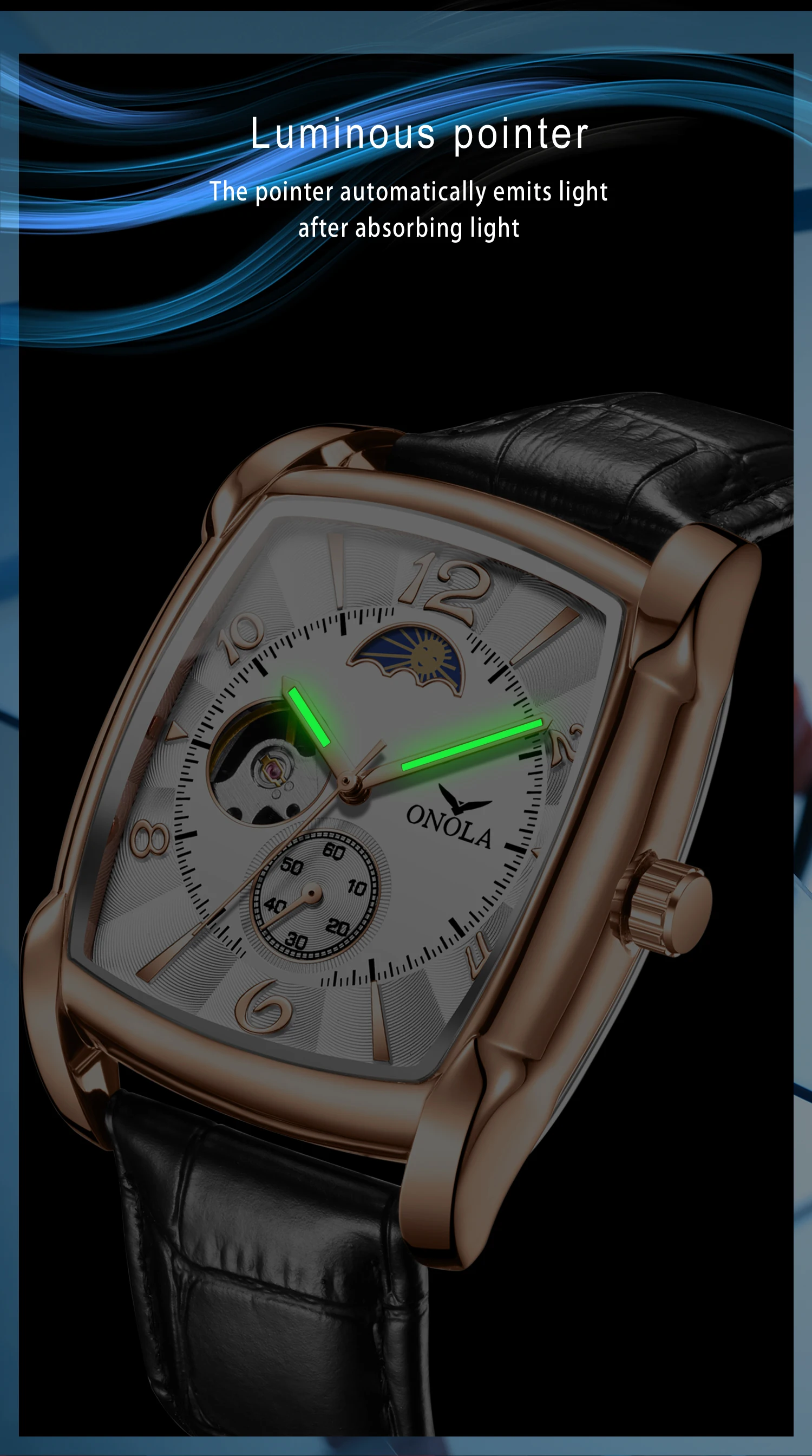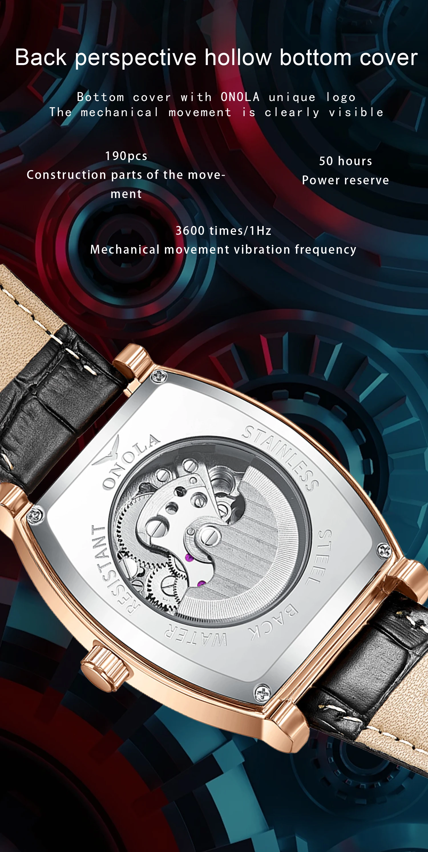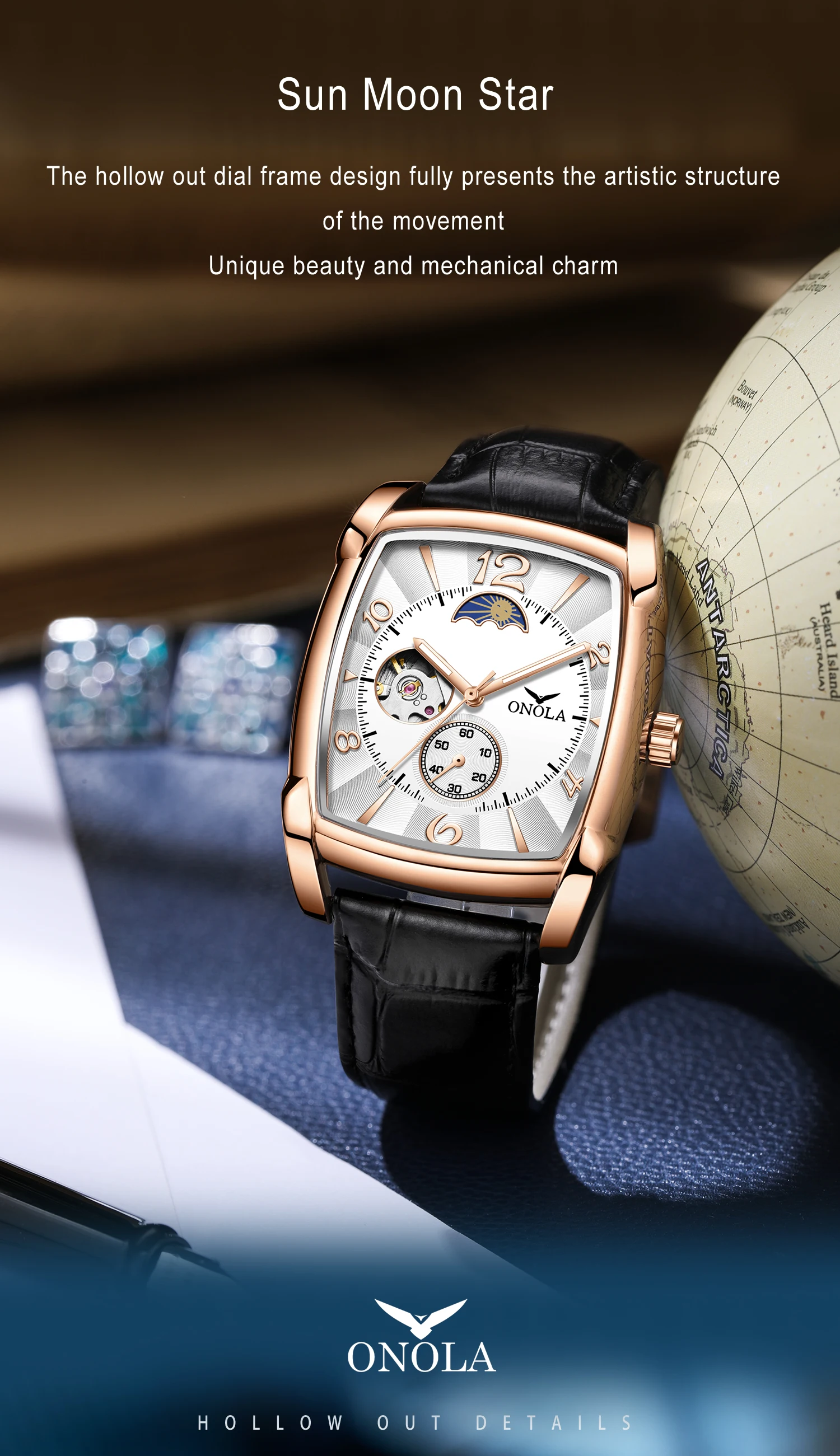 Brand ONOLA Top Luxury Fashion Men's Watches Luminous Square Mechanical Skeleton Sport Waterproof Male Automatic Watch Men