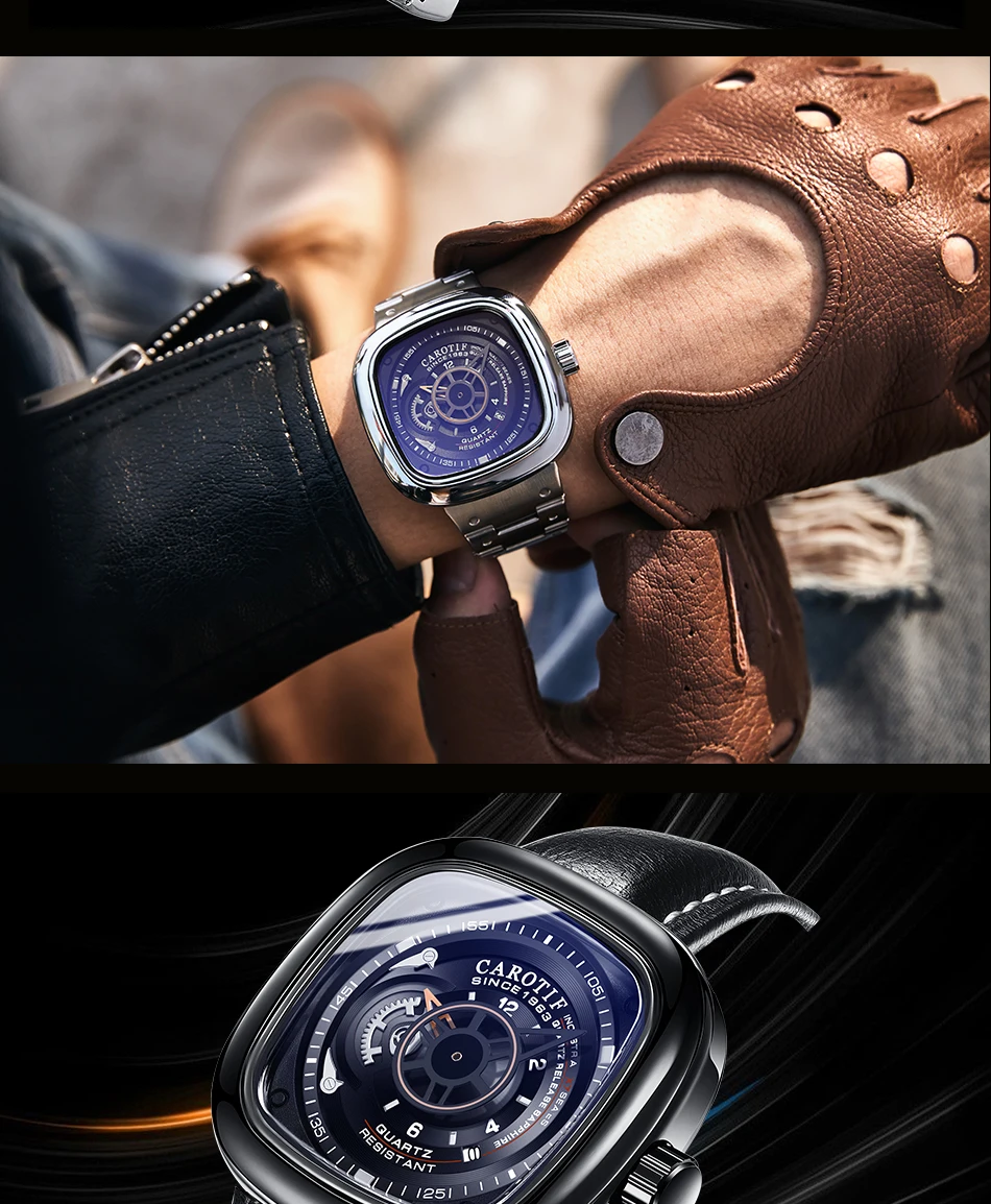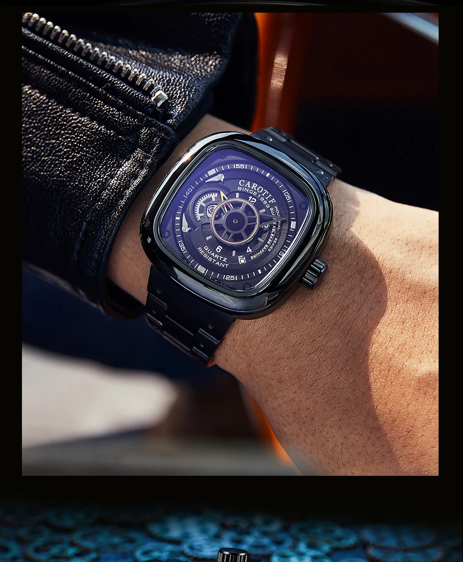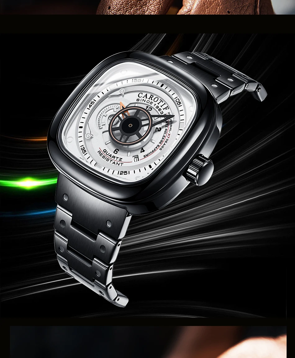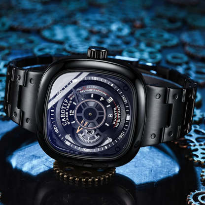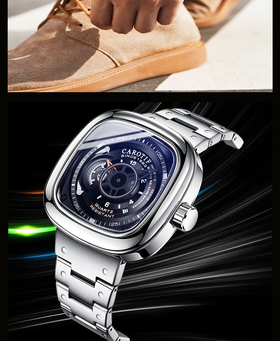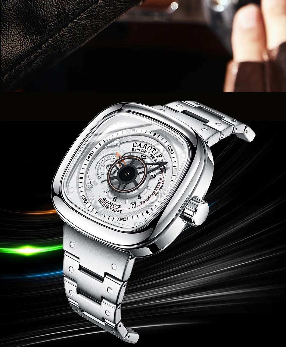Carotif Fashion Brand Square Dial Quartz Men Watch Stainless Steel Strap Business Wristwatch 30M Waterproof Men's Hand Clock