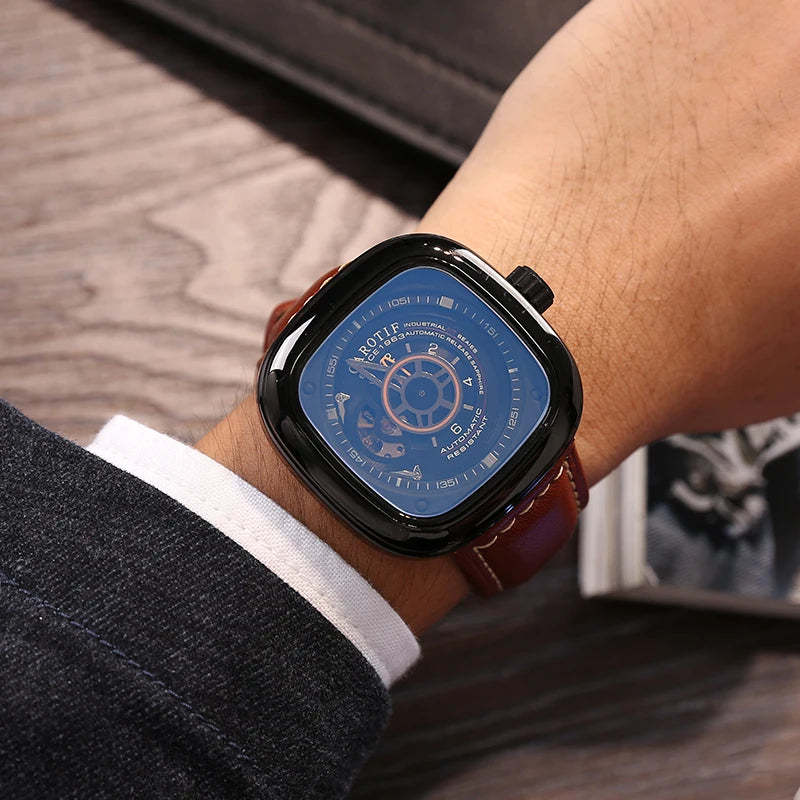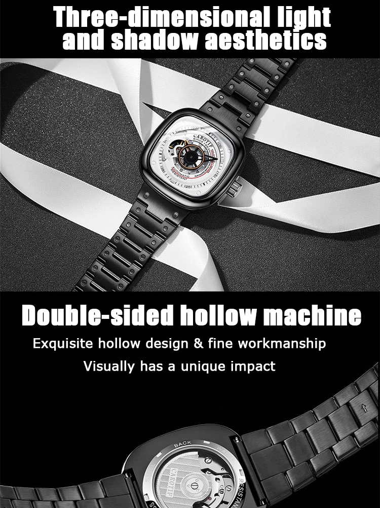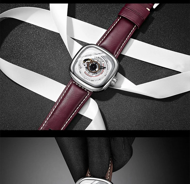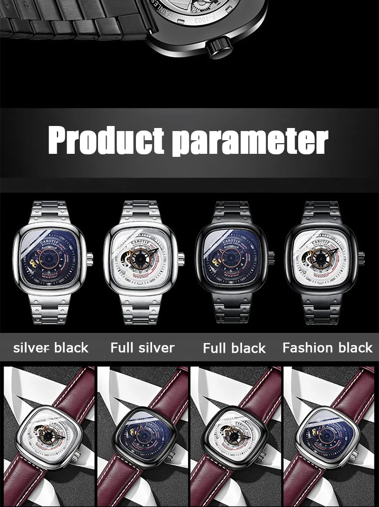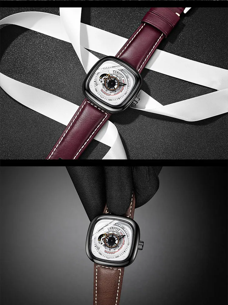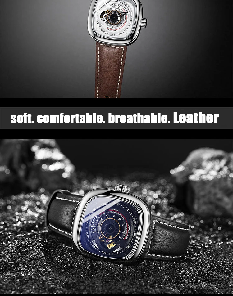 Carotif Man Square Dial Skeleton Mechanical Wrist Watch Casual Leather Strap Waterproof Automatic Wristwatch for Men Hand Clock