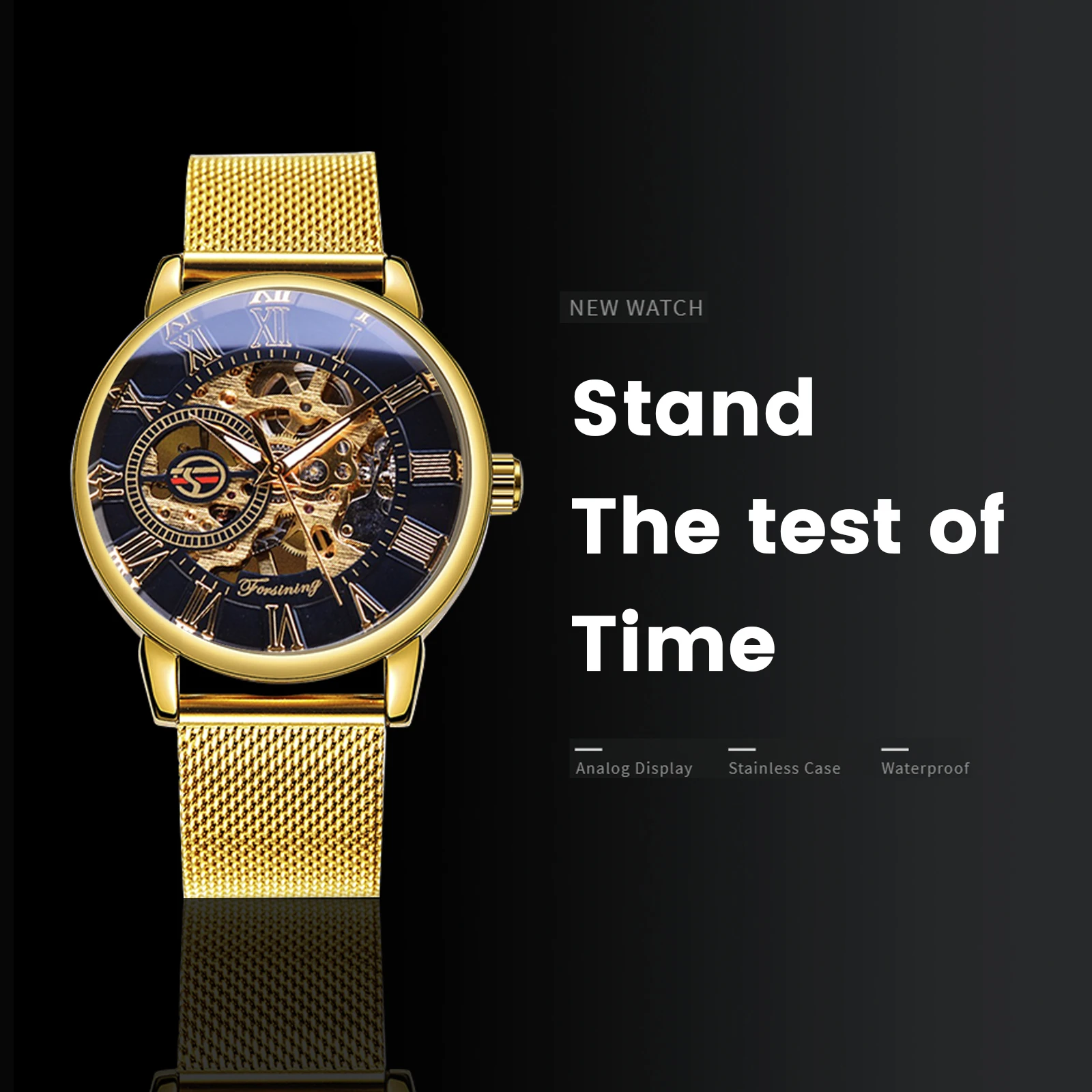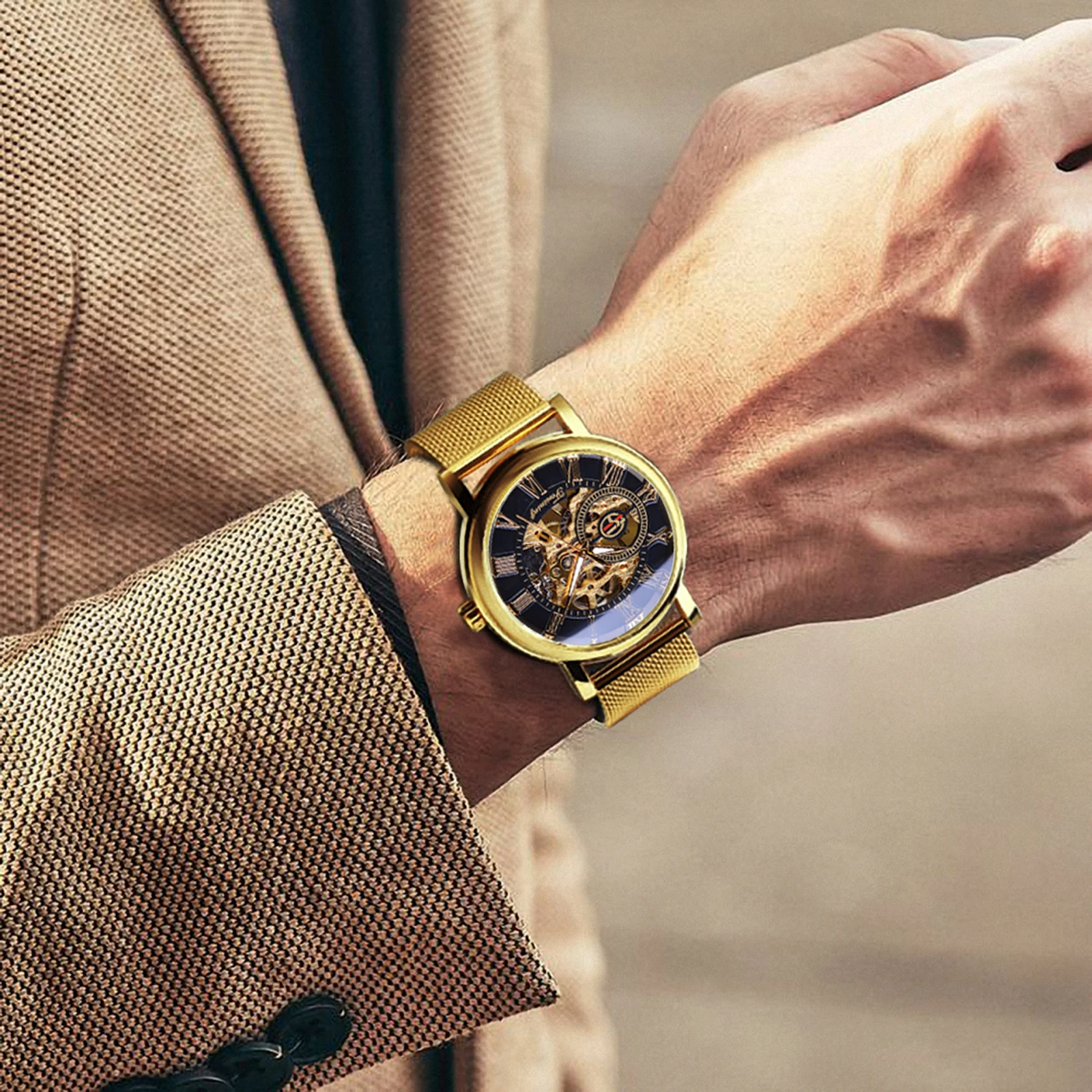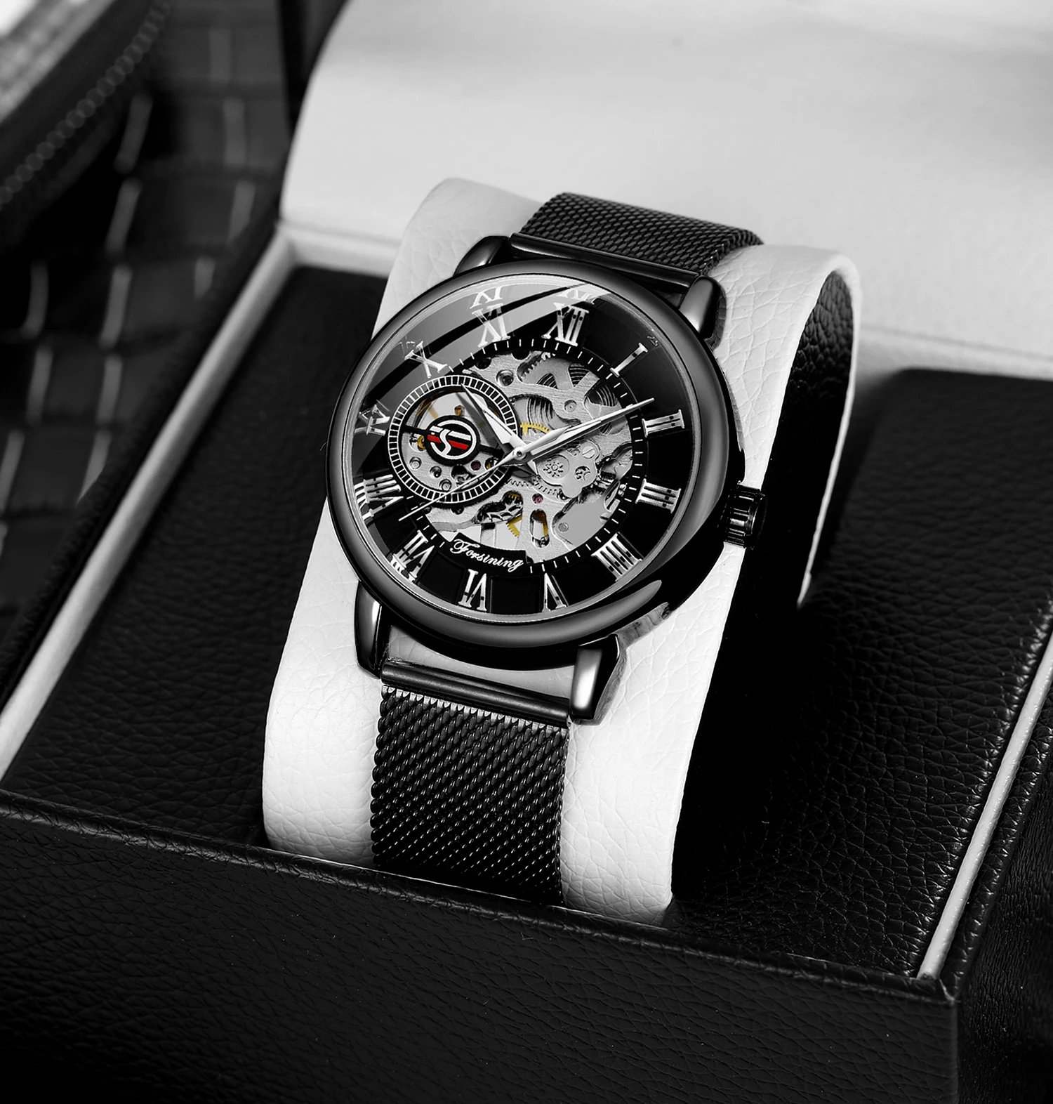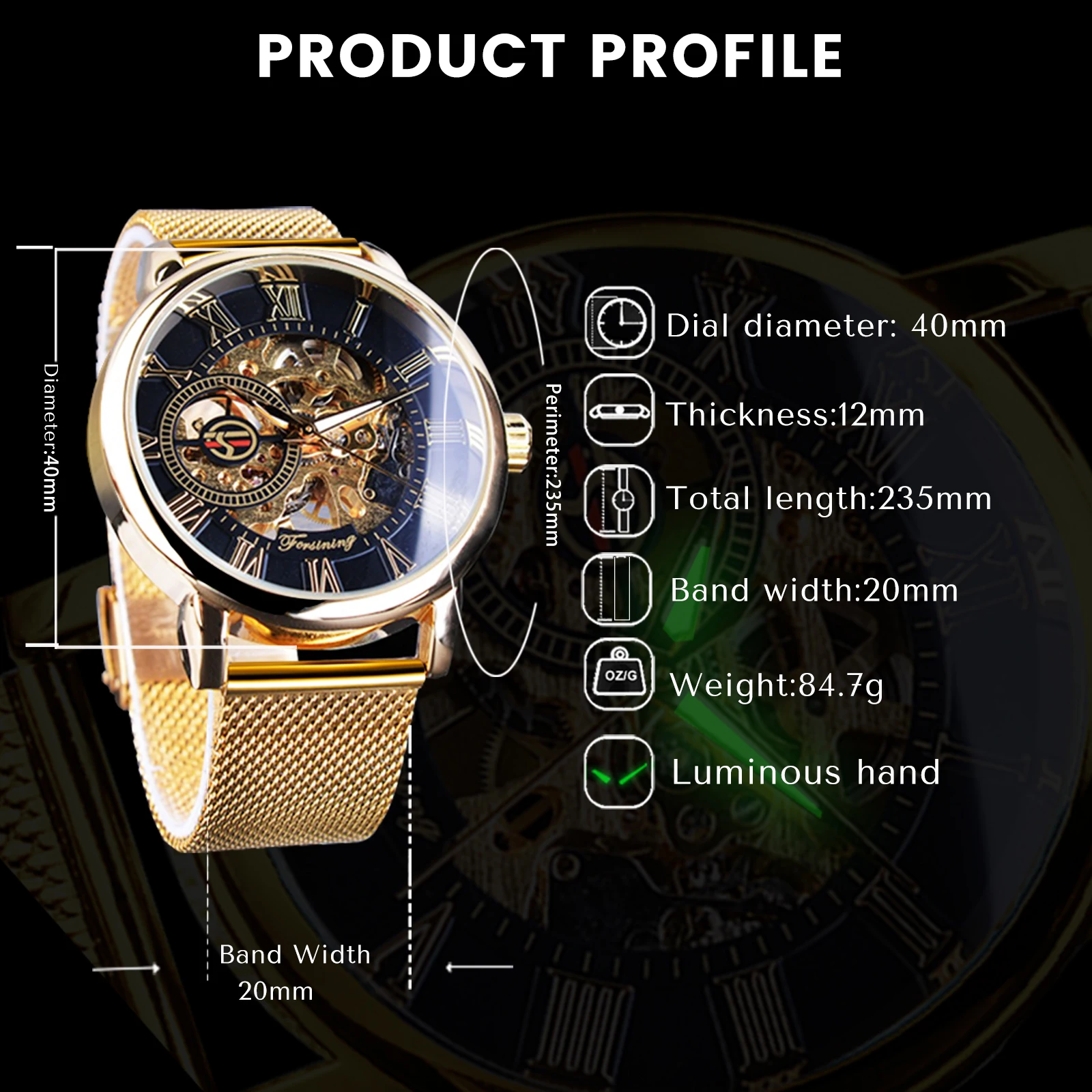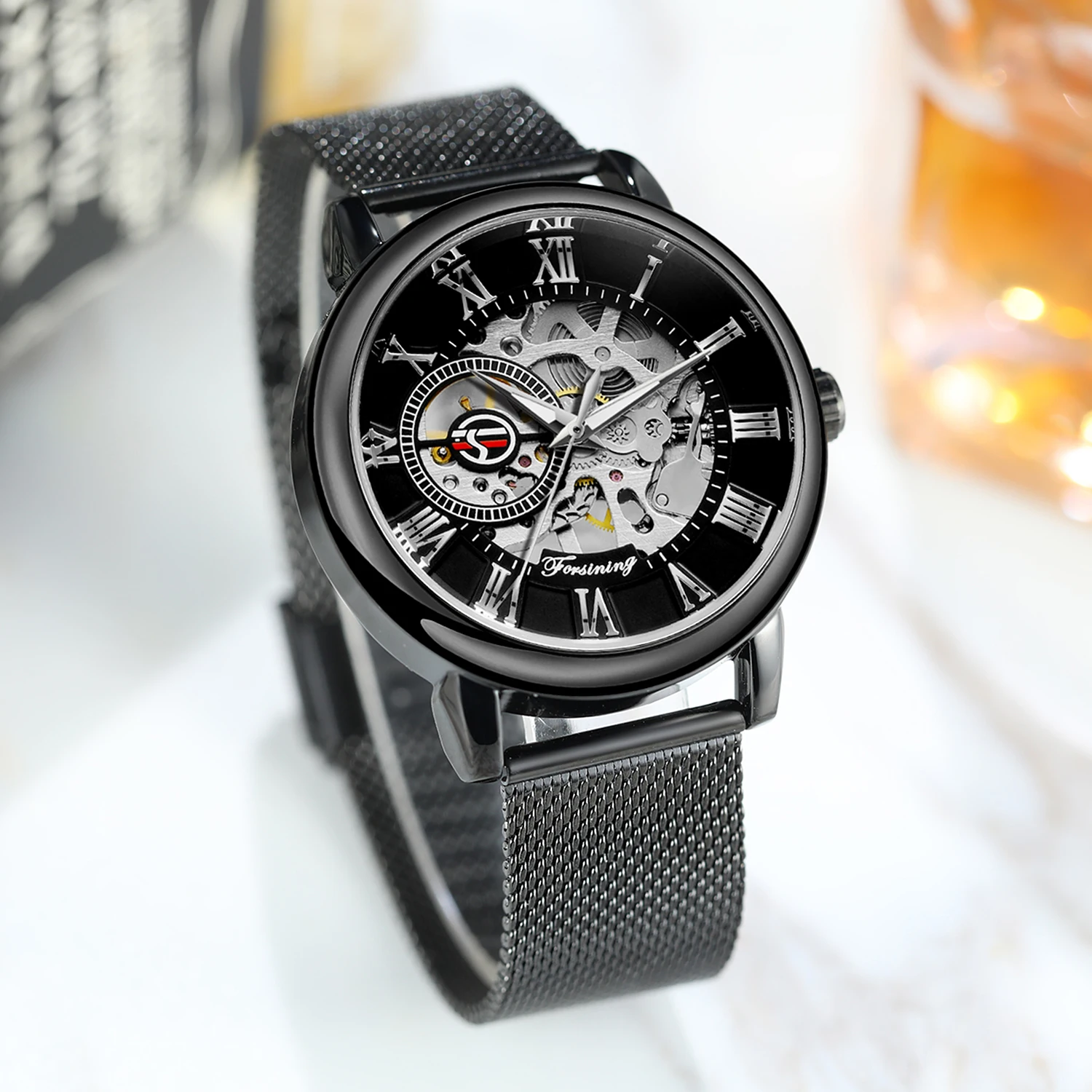 Classic Hand Winding Watches for Men Luminous Luxury Retro Gold Skeleton Mechanical Watch Mesh Stainless Steel Strap Forsining
