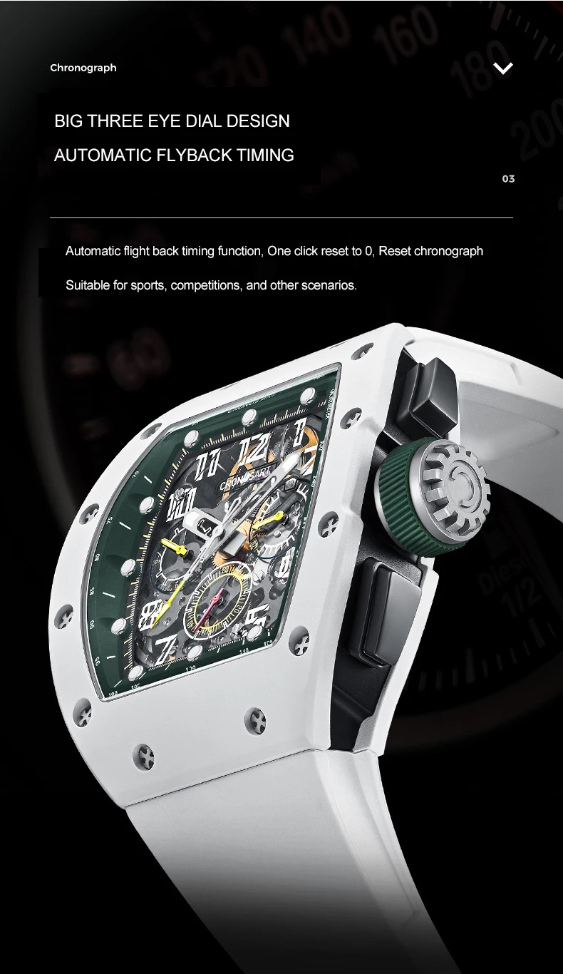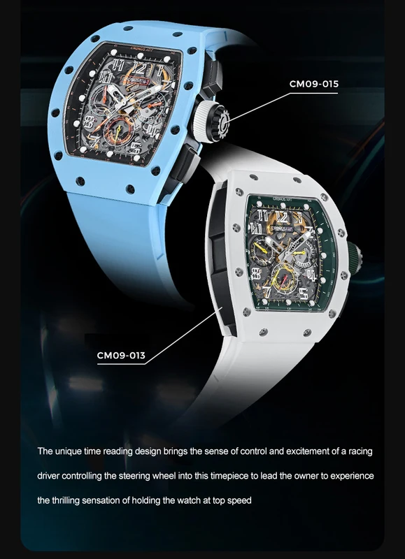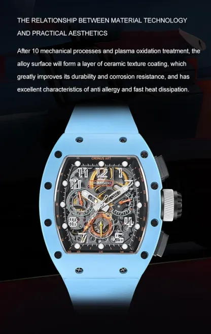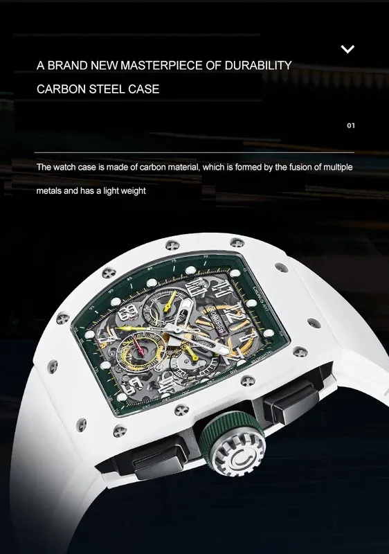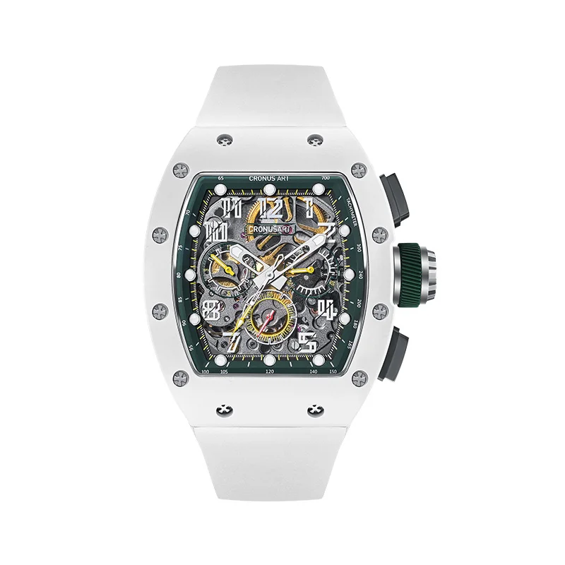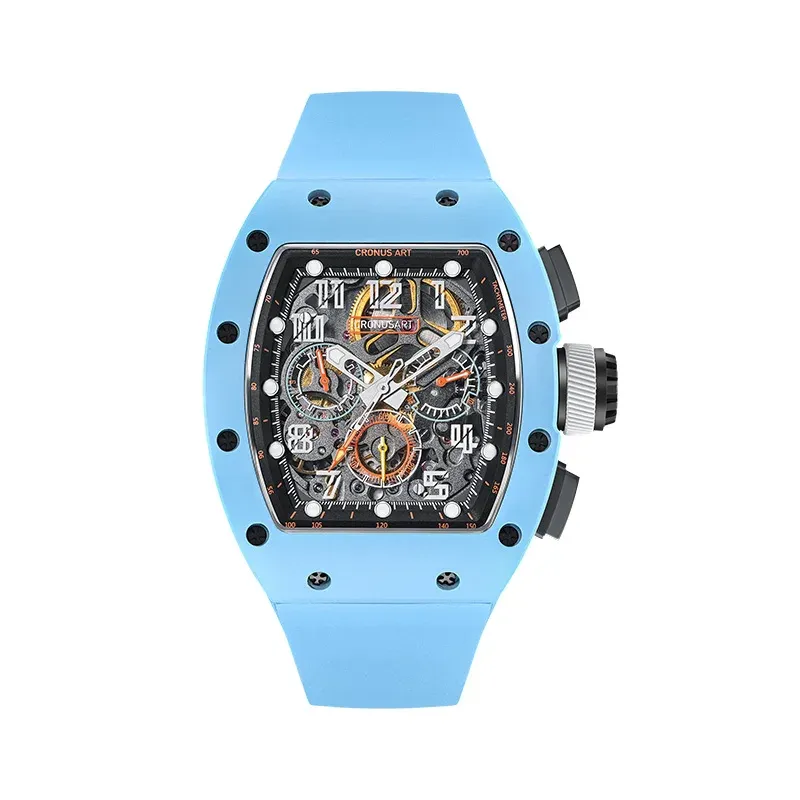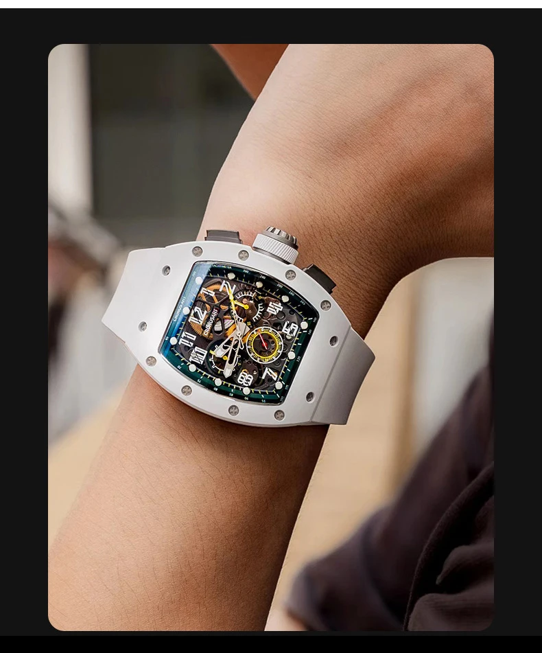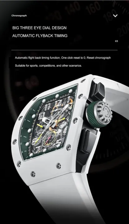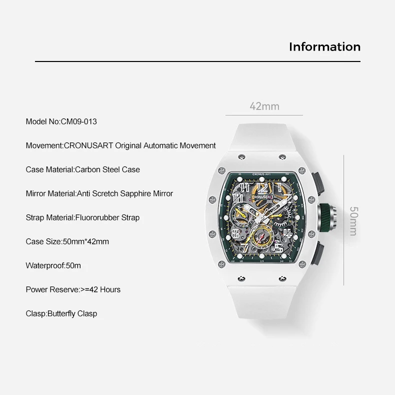 CRONUSART Men Automatic Watch 50MM Chronograph Tonneau Mechanical Wristwatch Sport Carbon Steel Case Luminous Fluororubber Strap