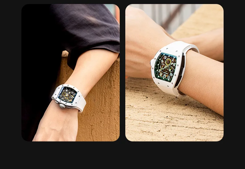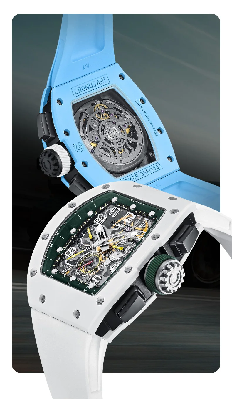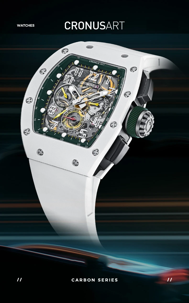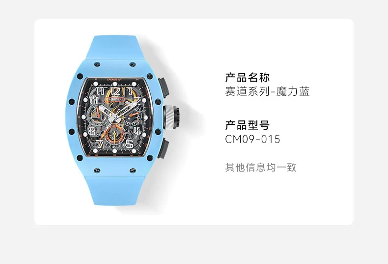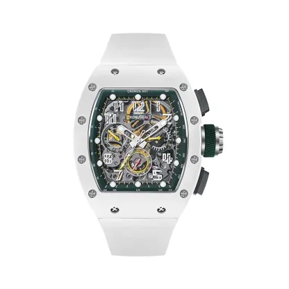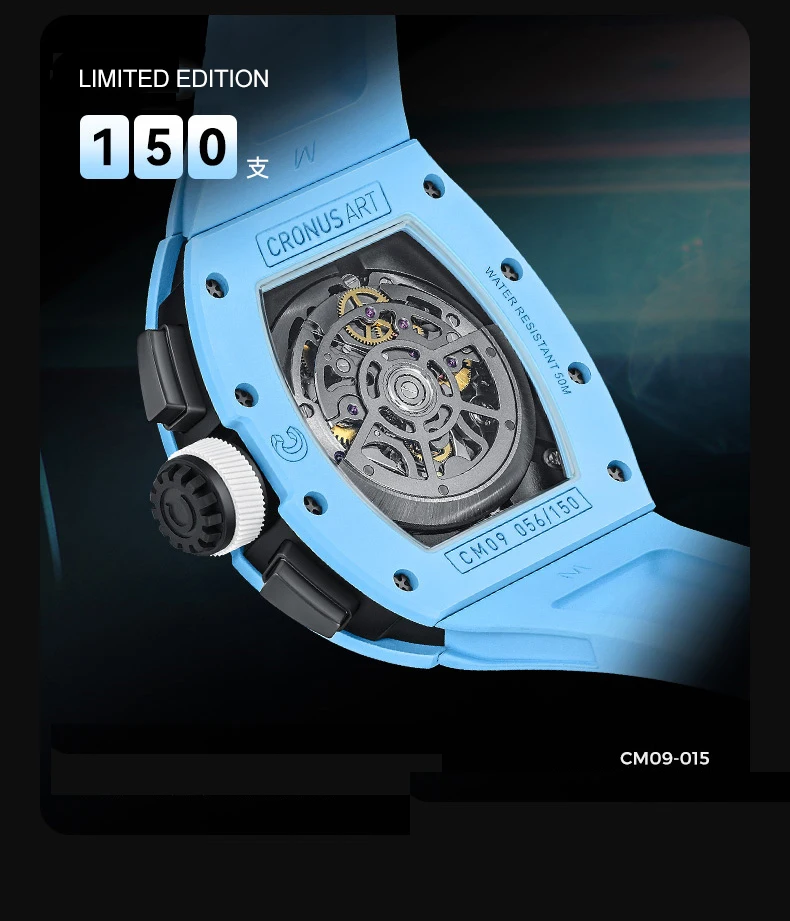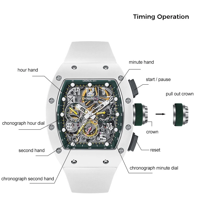 CRONUSART Men Automatic Watch 50MM Chronograph Tonneau Mechanical Wristwatch Sport Carbon Steel Case Luminous Fluororubber Strap