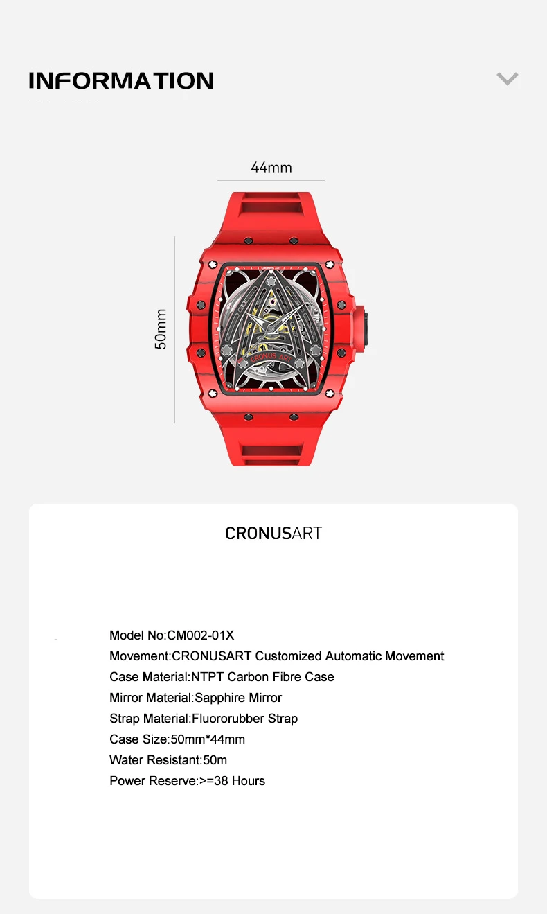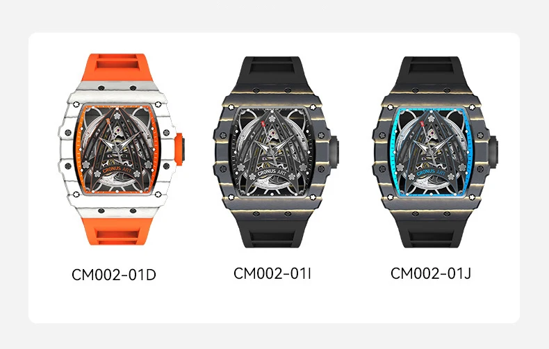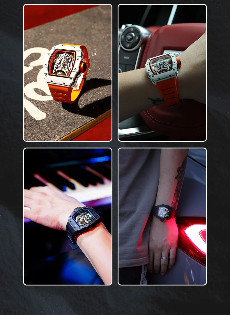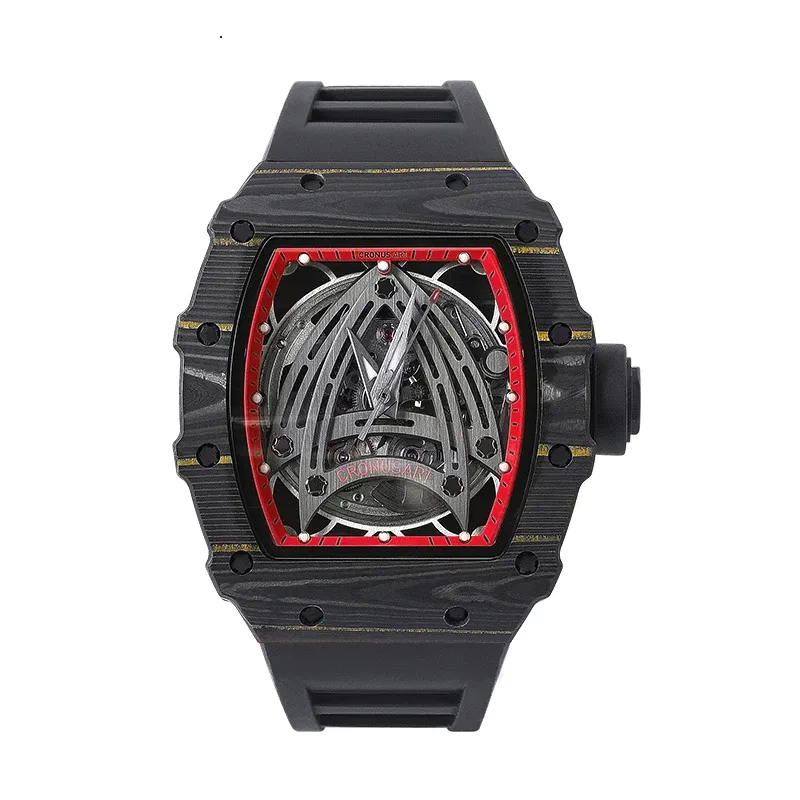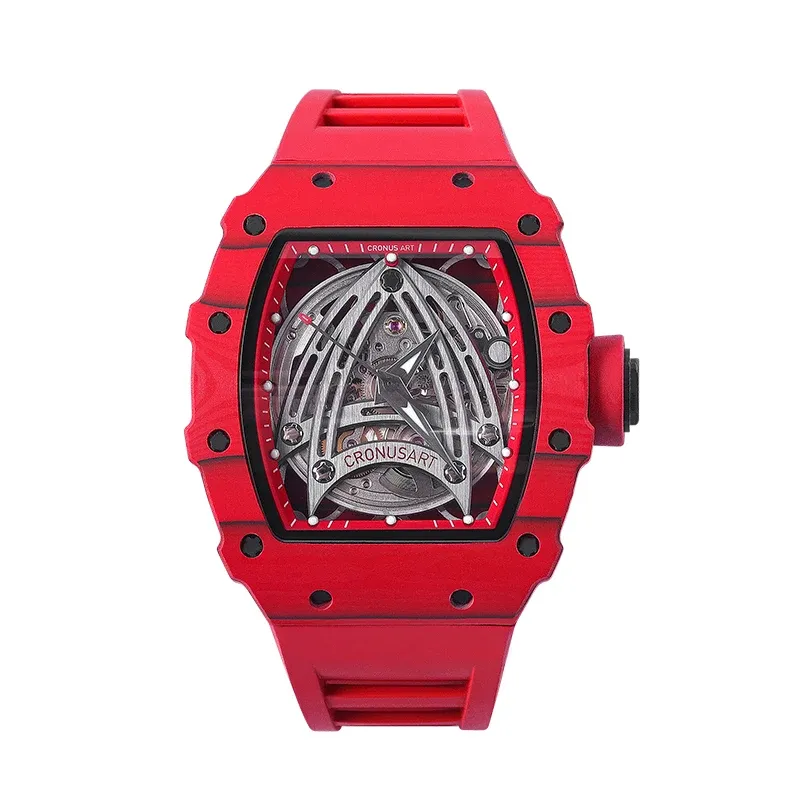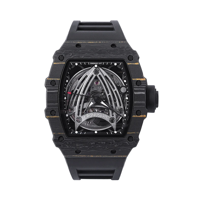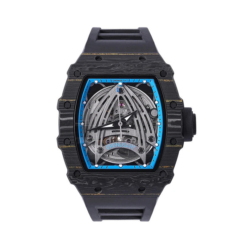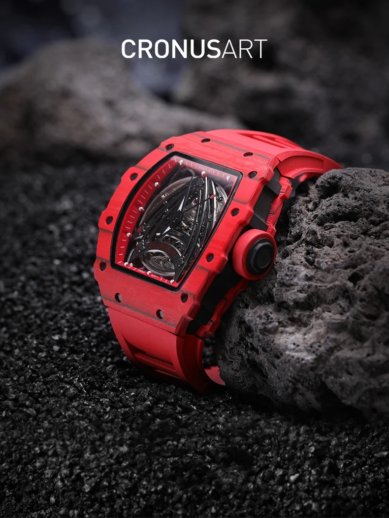 CRONUSART Men Automatic Watch 50MM Luxury Tonneau Mechanical Wristwatch Carbon Fibre Case Luminous Fluororubber Strap