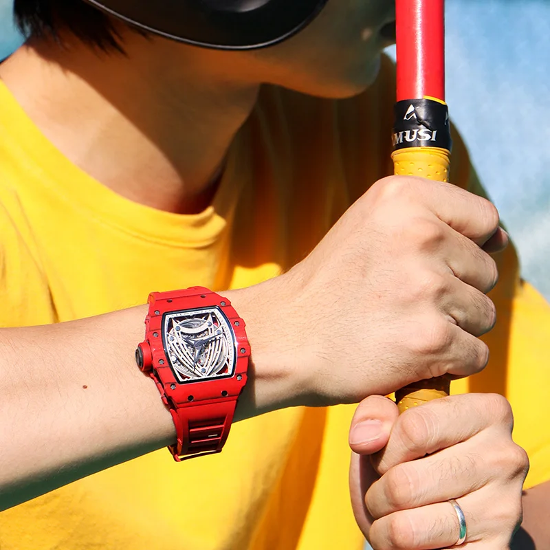 Cronusart men Automatic Watch luxury tonneau mechanical wristwatch Carbon Fibre case Fluororubber strap luminous skeleton dial