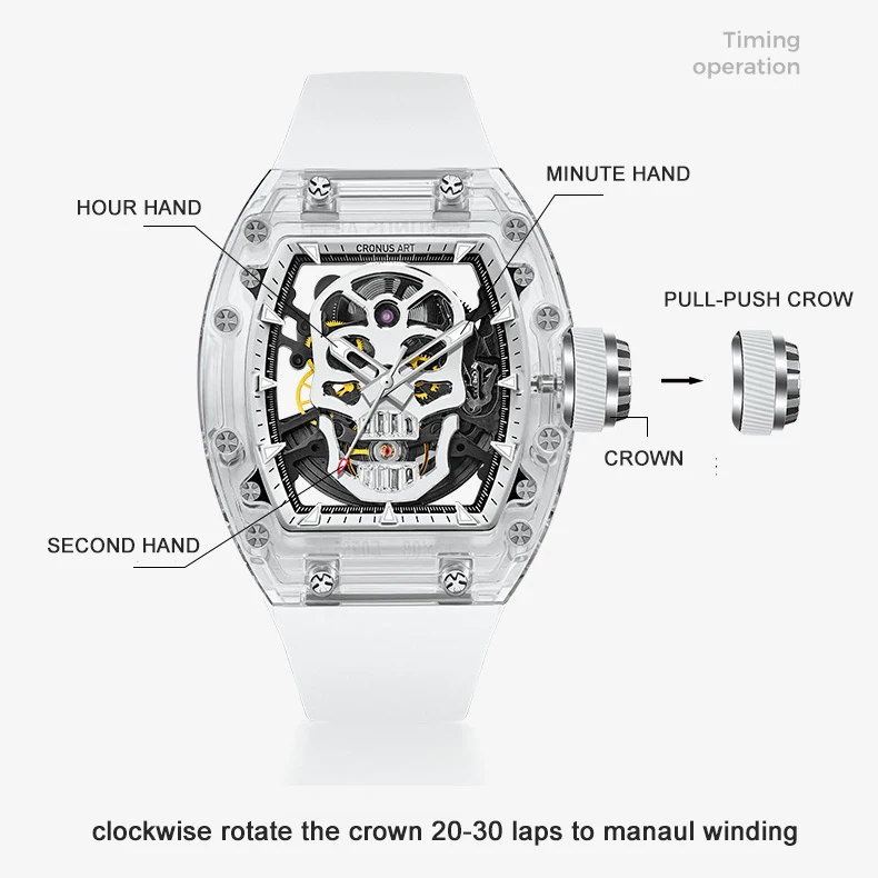 CRONUSART Men Automatic Watch Tonneau Mechanical Wristwatch Sapphire Case Luminous Fluororubber Strap Hollow Out Skull Dial