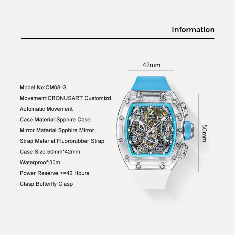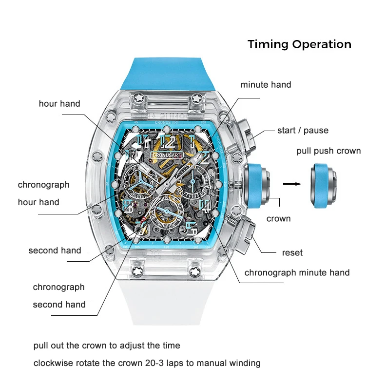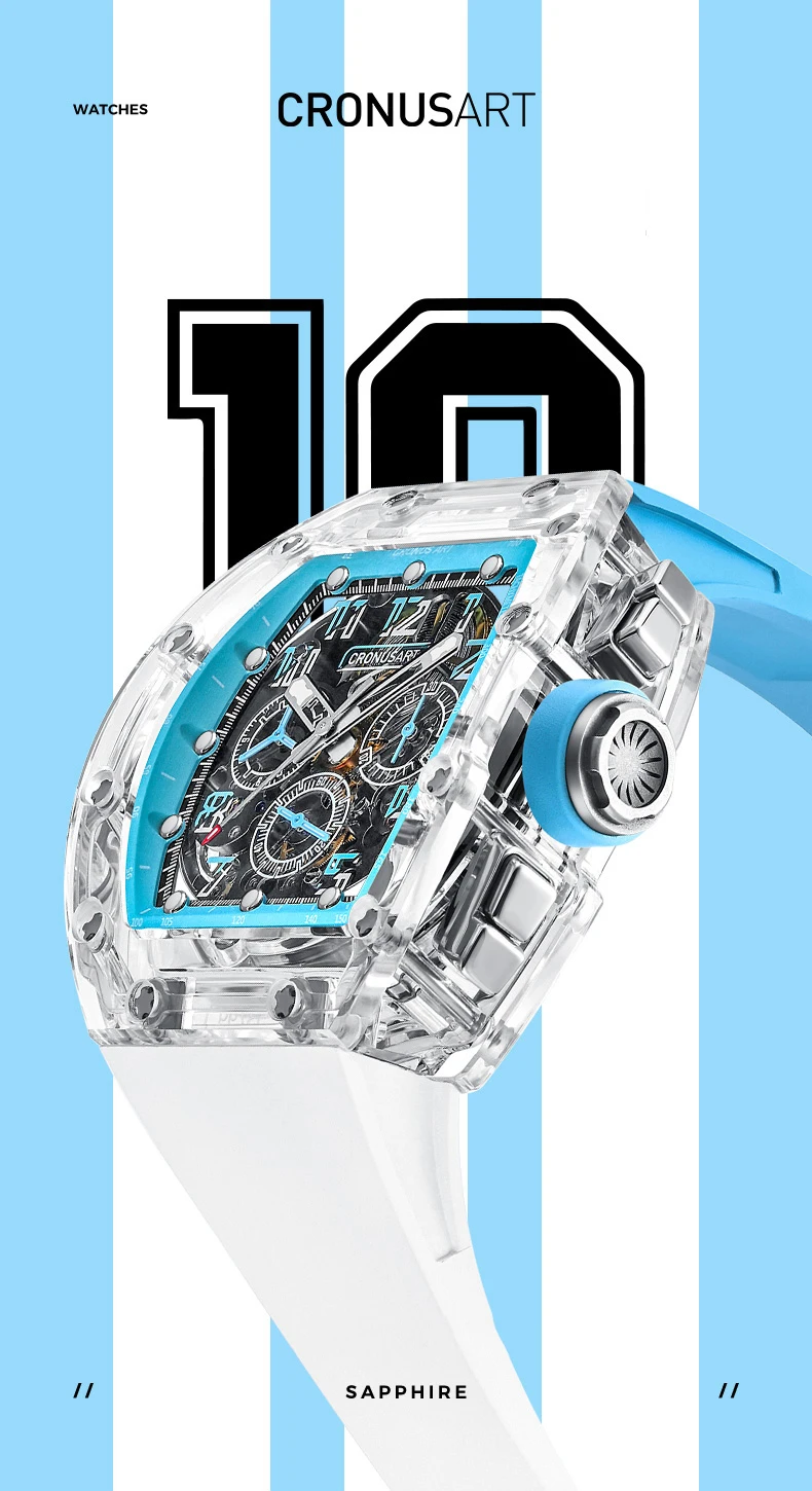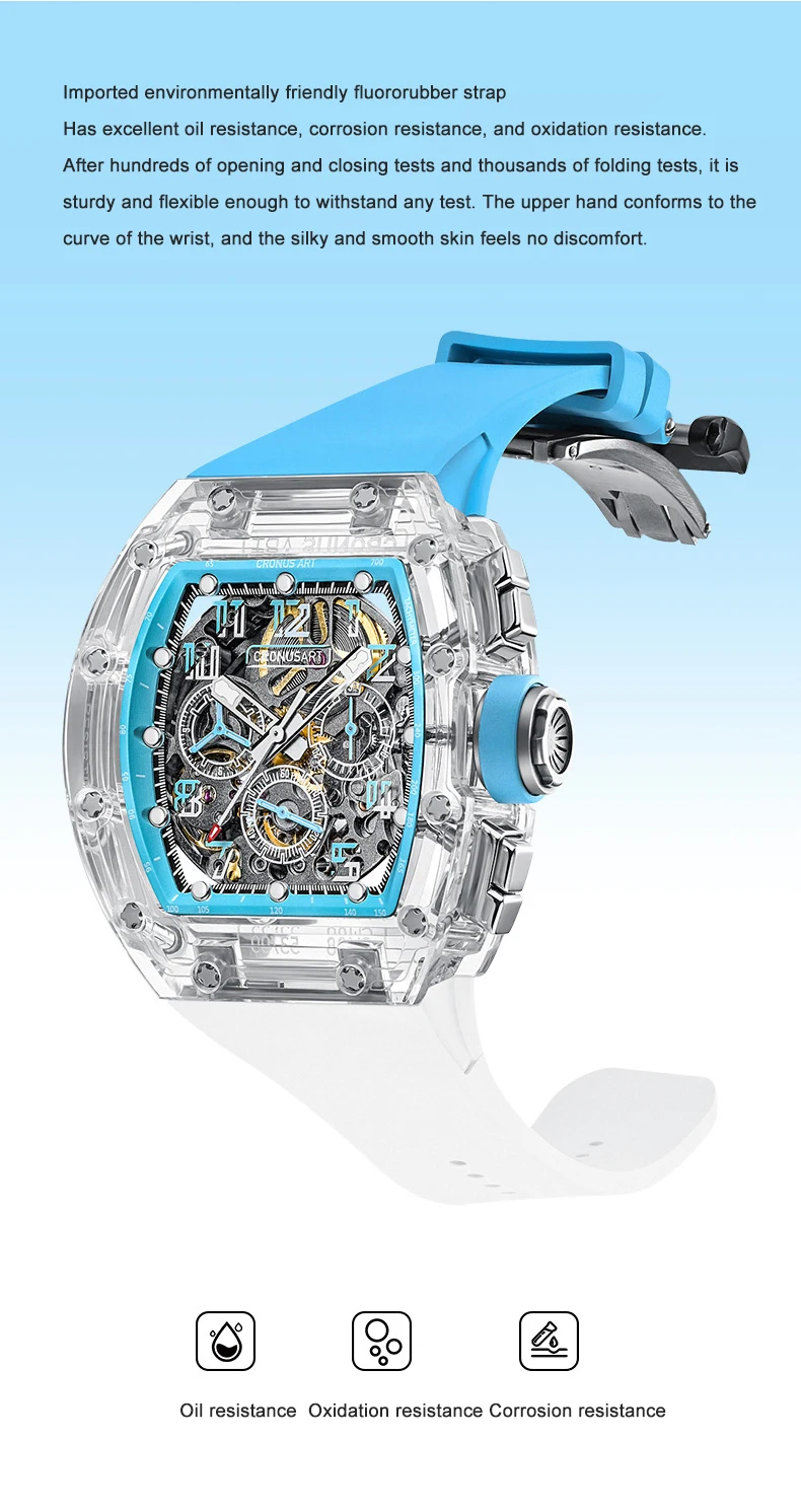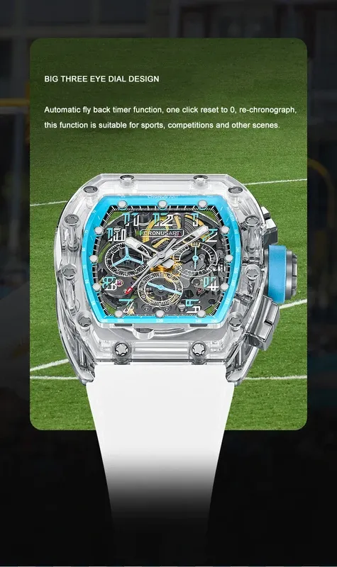 CRONUSART Men Chronograph Watch 50MM Tonneau Mechanical Wristwatch Sapphire Case Luminous Fluororubber Strap Big Triple Windows