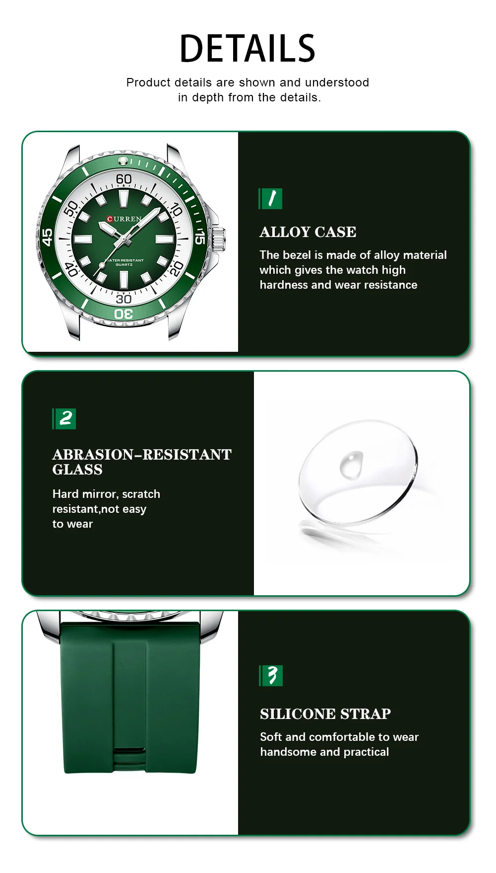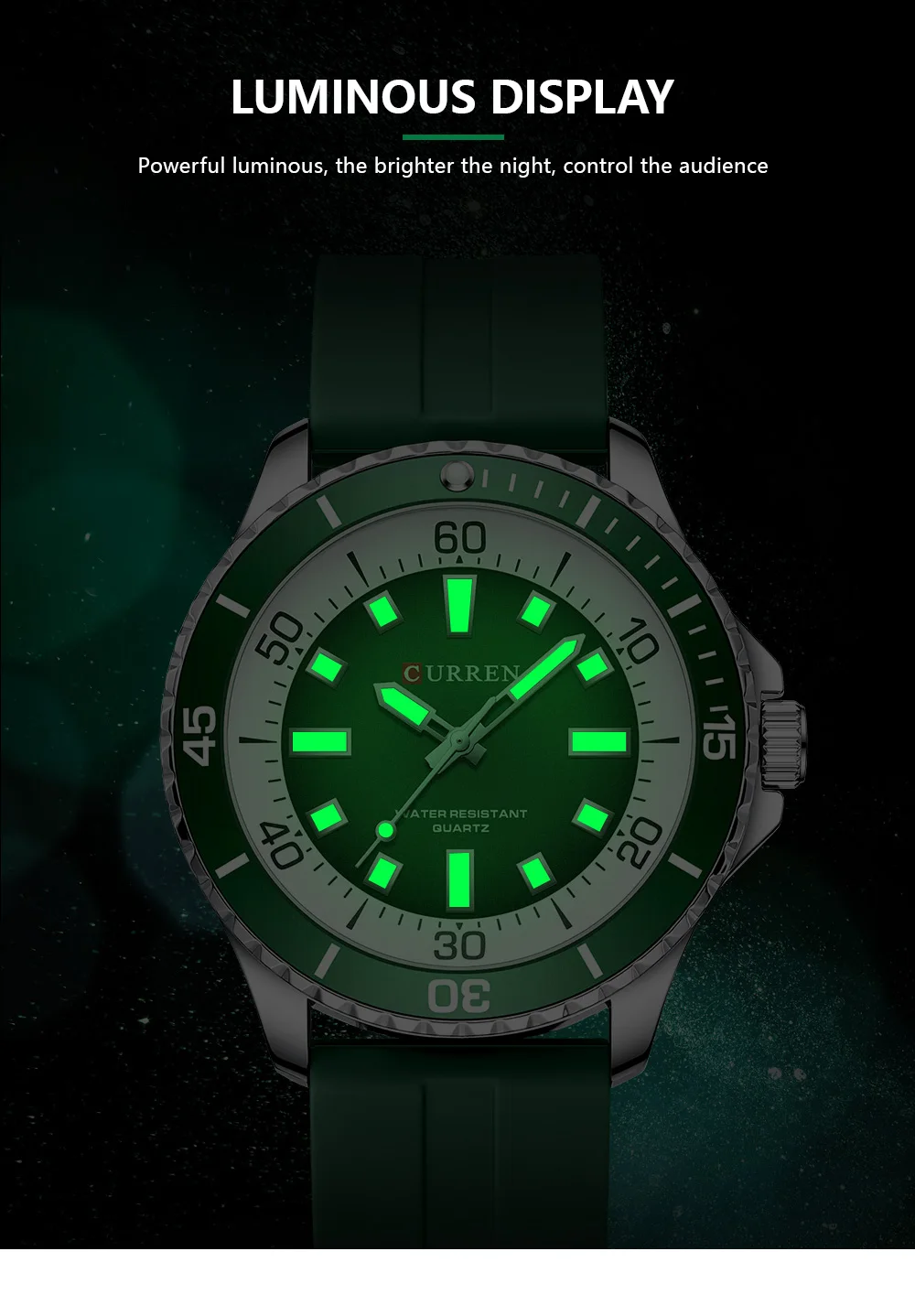 luminous, atuo date, silicone strap, waterproof 3 ATM