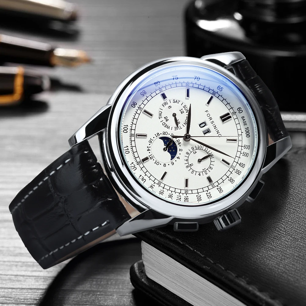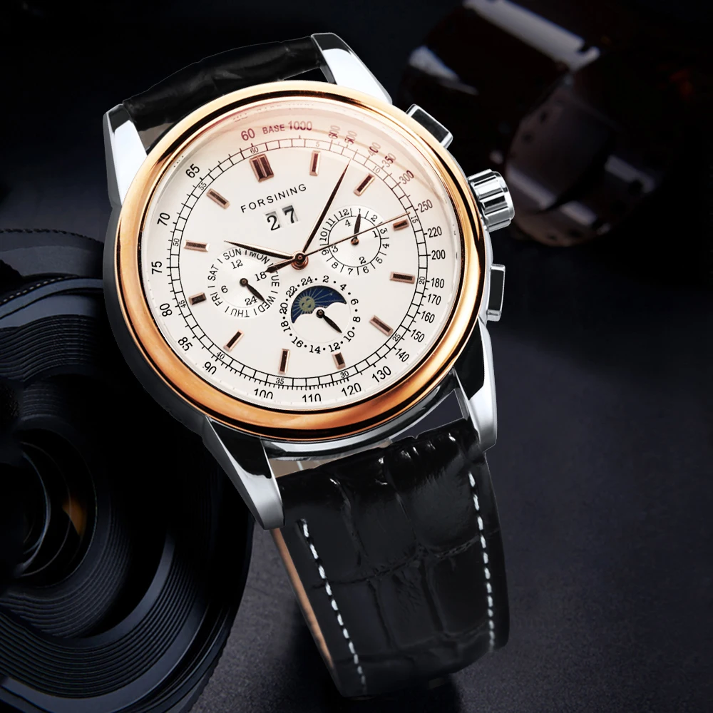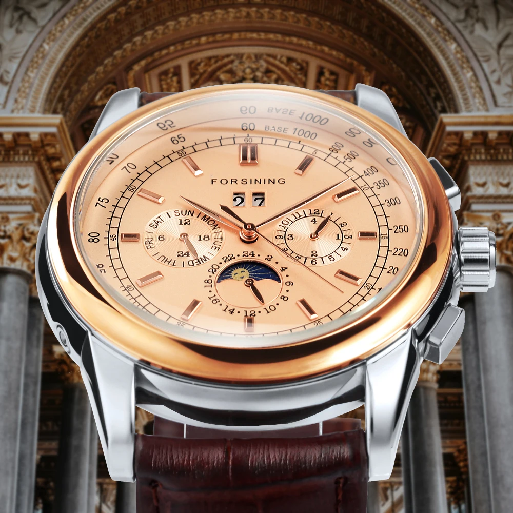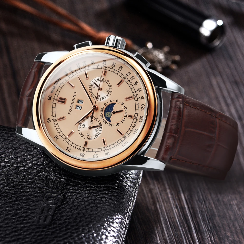 Forsining Classic Retro Mechanical Watches for Men Moon Phase Calendar Brown Genuine Leather Strap Luxury Automatic Mens Watch