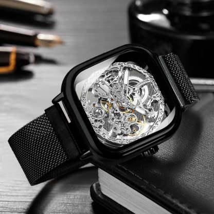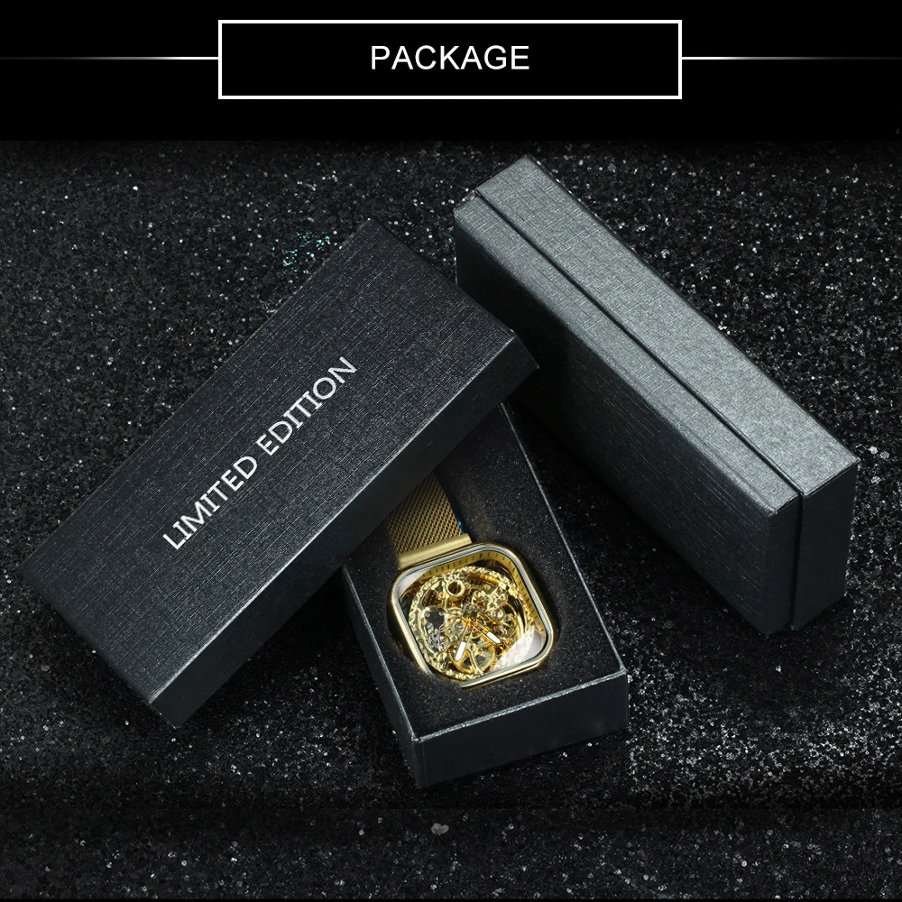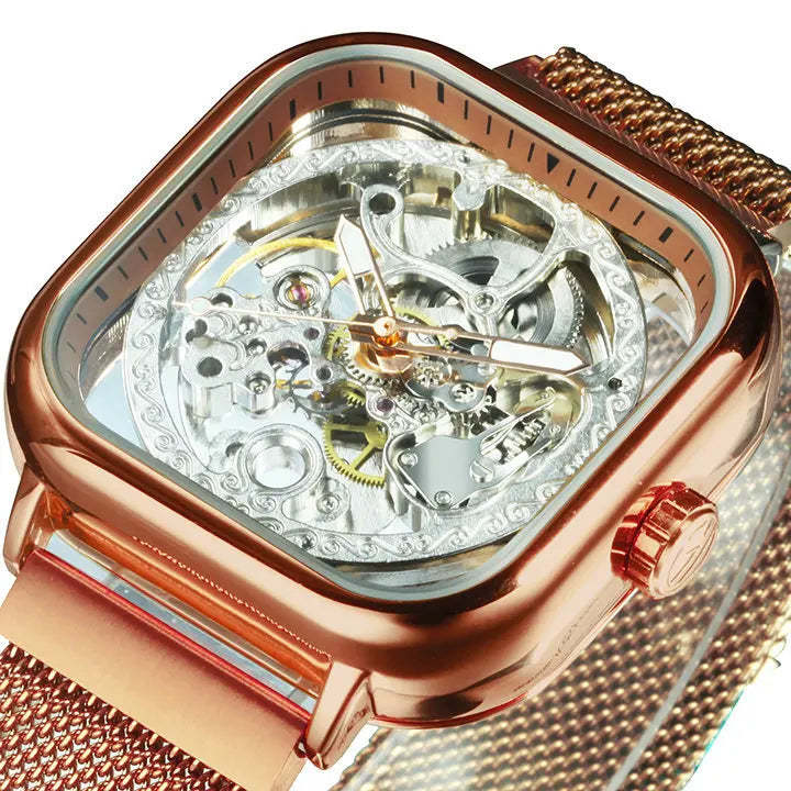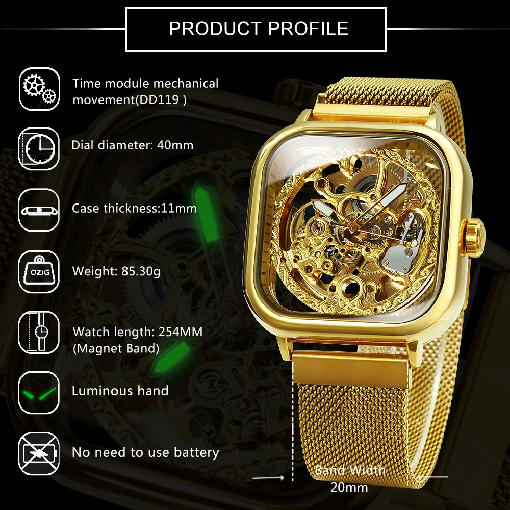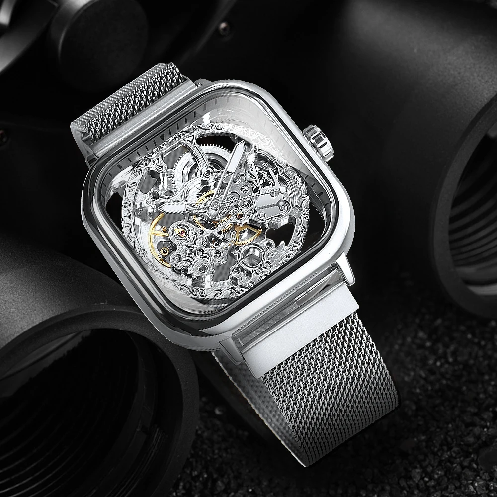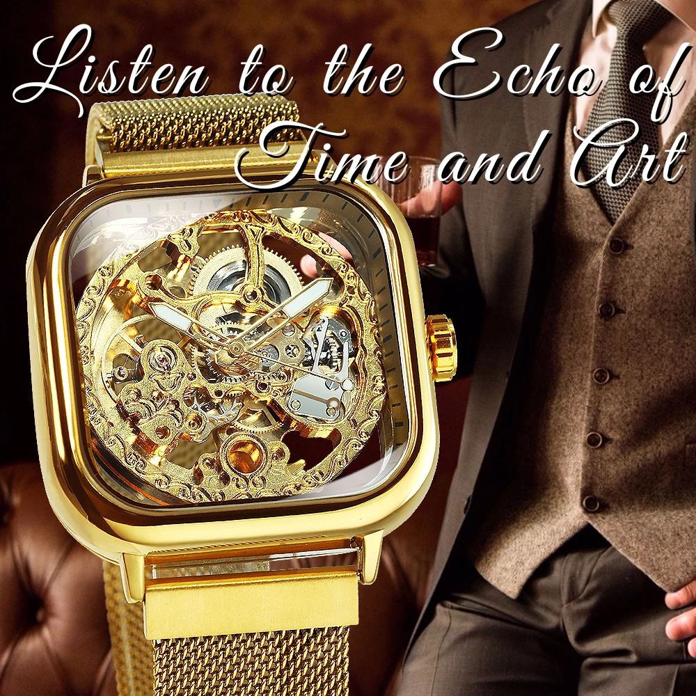 Forsining Luxury Gold Watch for Men Engraved Movement Luminous Square Automatic Mechanical Watches Mesh Stainless Steel Strap