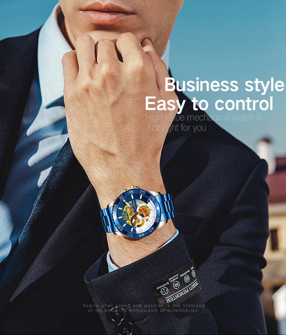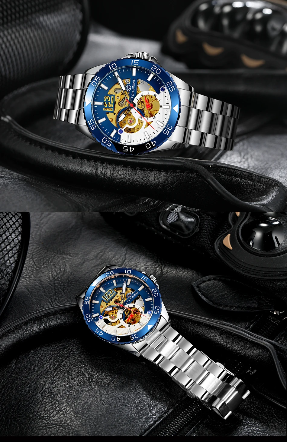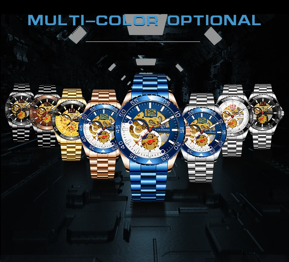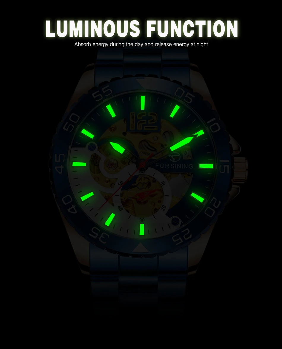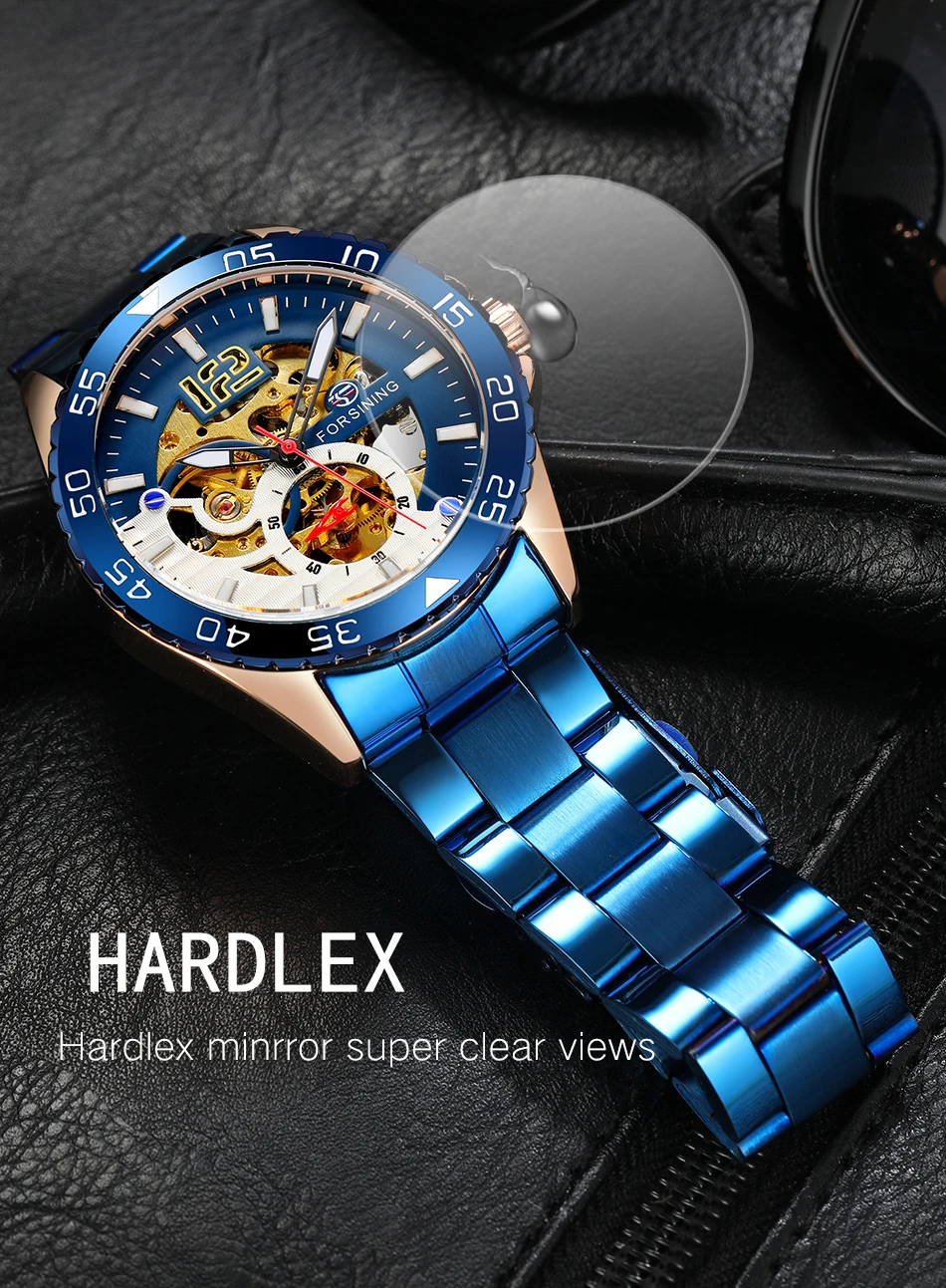 Forsining Sports Skeleton Automatic Mechanical Watch for Men Blue Rotating Bezel Luminous Hand Mens Waches Stainless Steel Strap