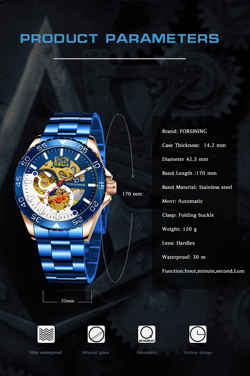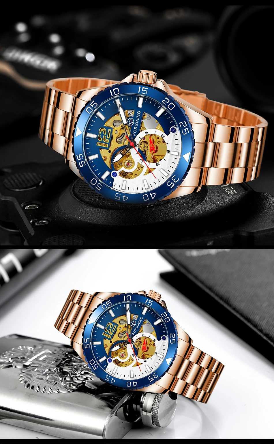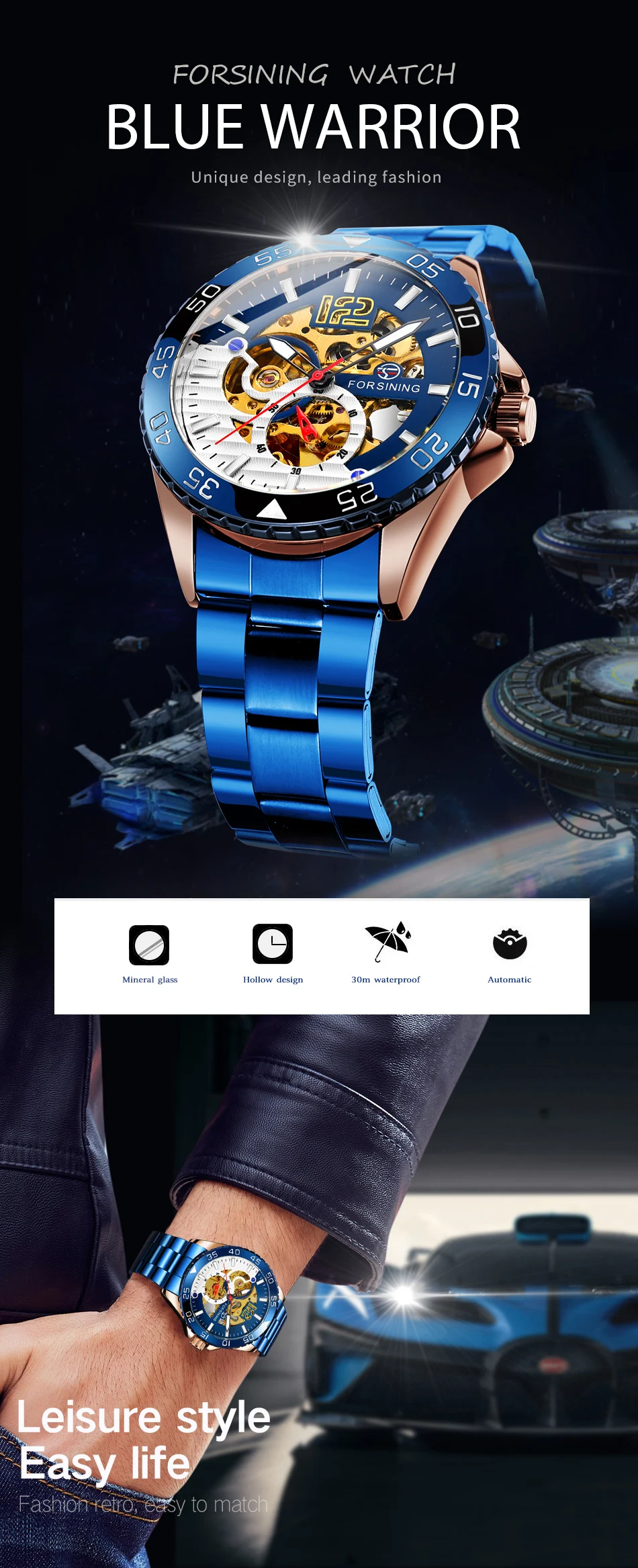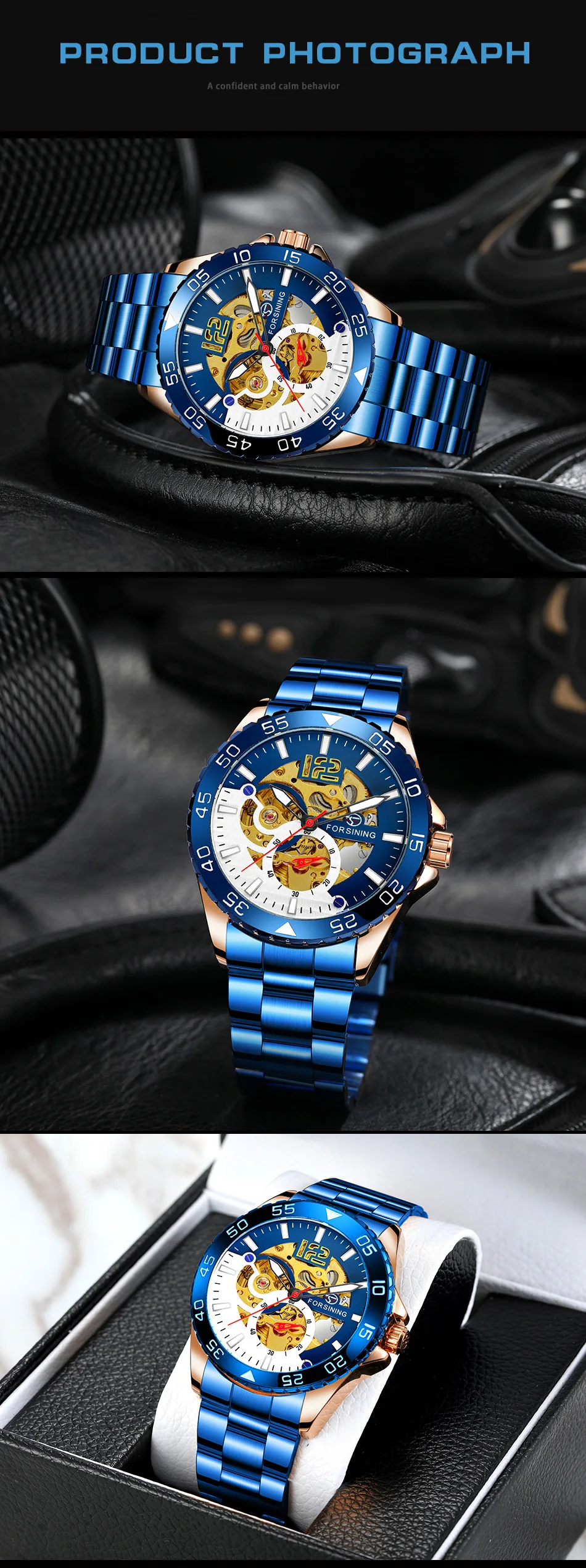 Forsining Sports Skeleton Automatic Mechanical Watch for Men Blue Rotating Bezel Luminous Hand Mens Waches Stainless Steel Strap