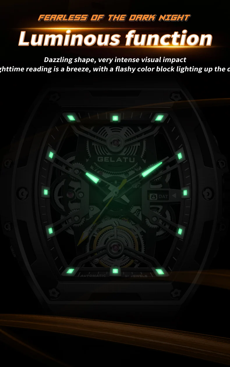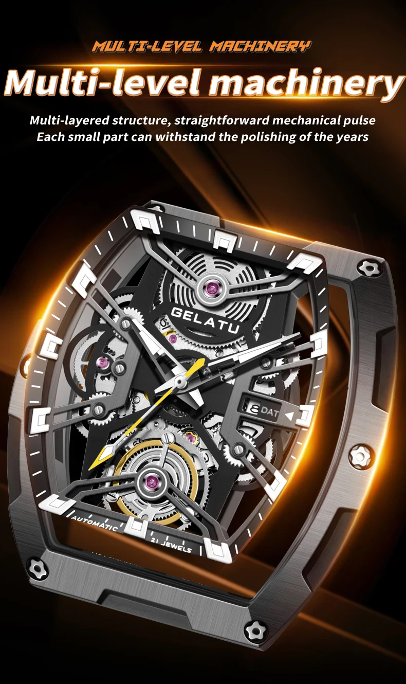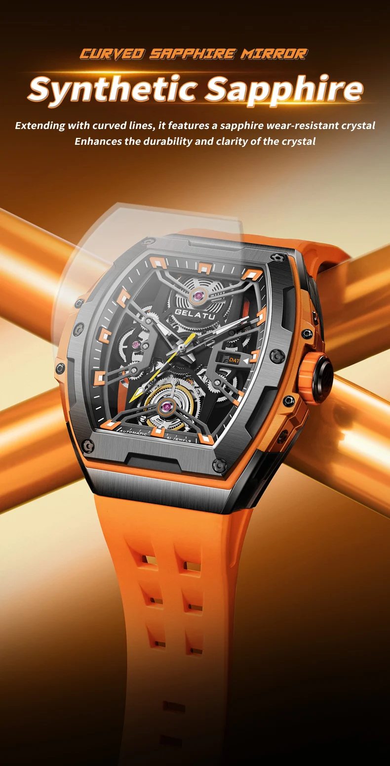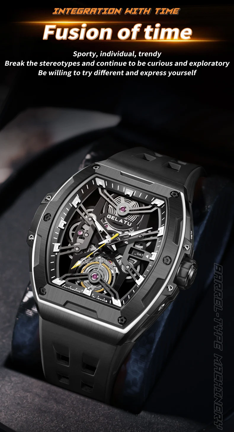 GELATU Original Brand Luxury Watch for Men Automatic Mechanical Tonneau Waterproof Silicone Sapphire Crystal Skeleton Wristwatch