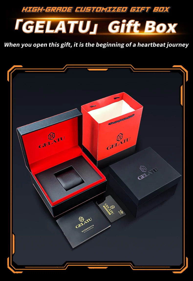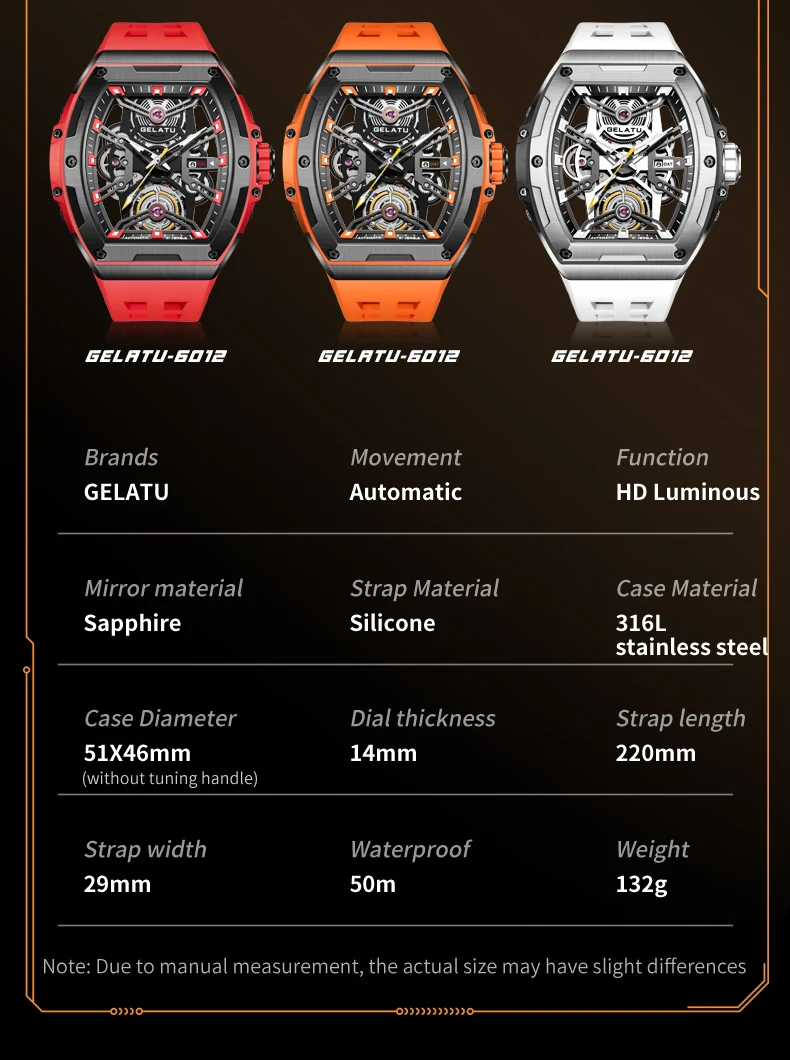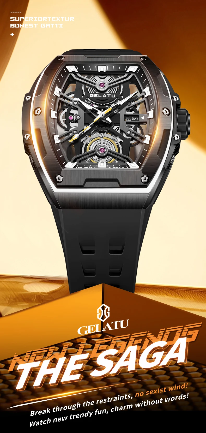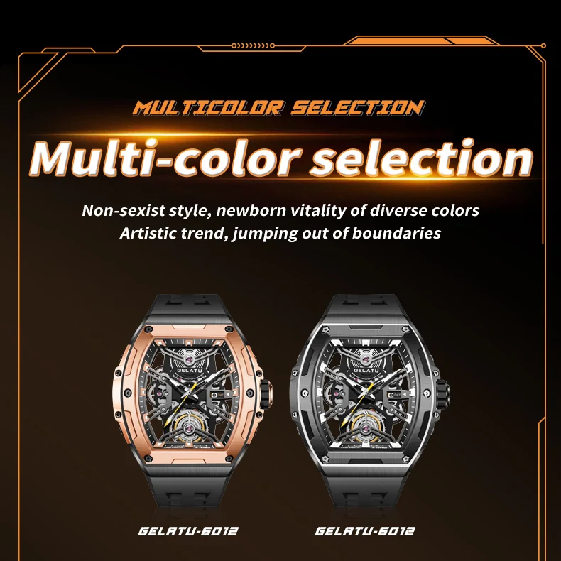 GELATU Original Brand Luxury Watch for Men Automatic Mechanical Tonneau Waterproof Silicone Sapphire Crystal Skeleton Wristwatch