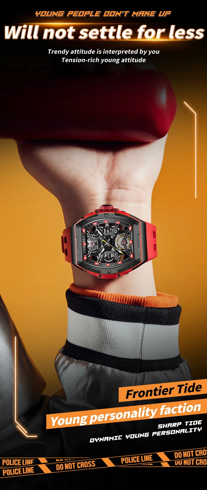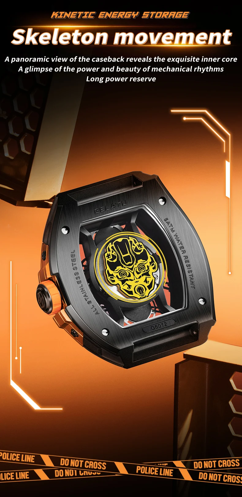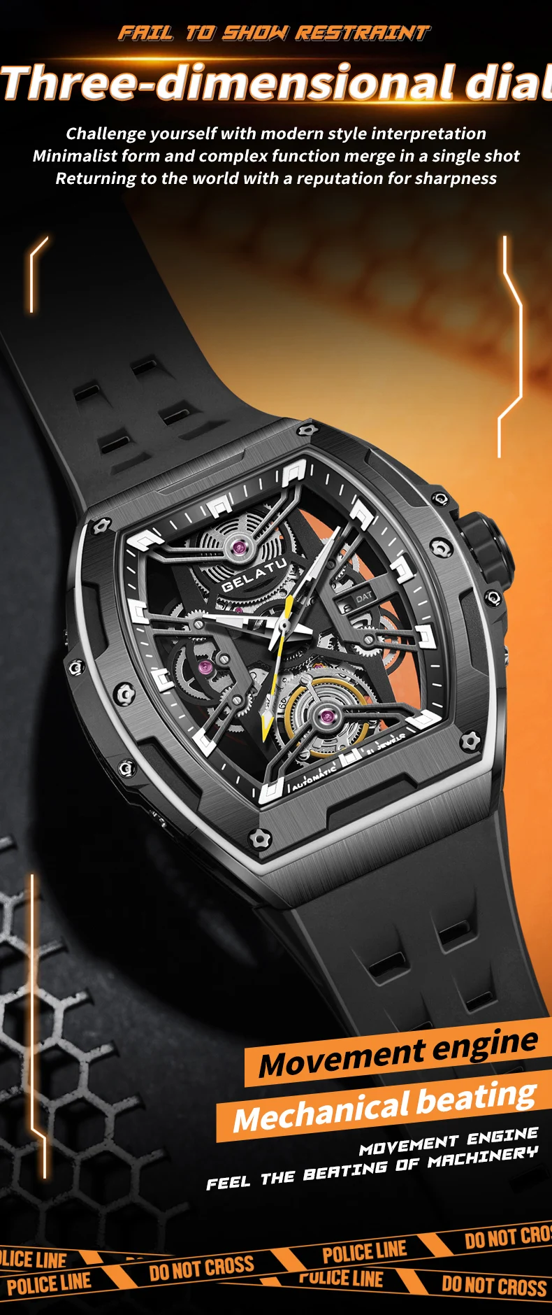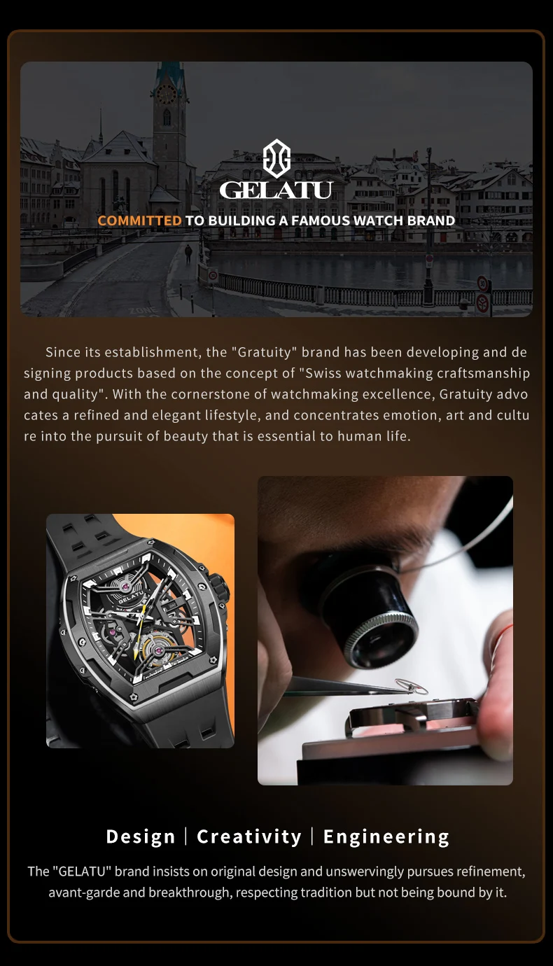 GELATU Original Brand Luxury Watch for Men Automatic Mechanical Tonneau Waterproof Silicone Sapphire Crystal Skeleton Wristwatch