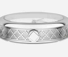 These timepieces, with their refined case and minimalist dial, display this design to its fullest expression: the cases are etched with the diamante pattern, and dials feature the motif all over conveying a fabric print effect.