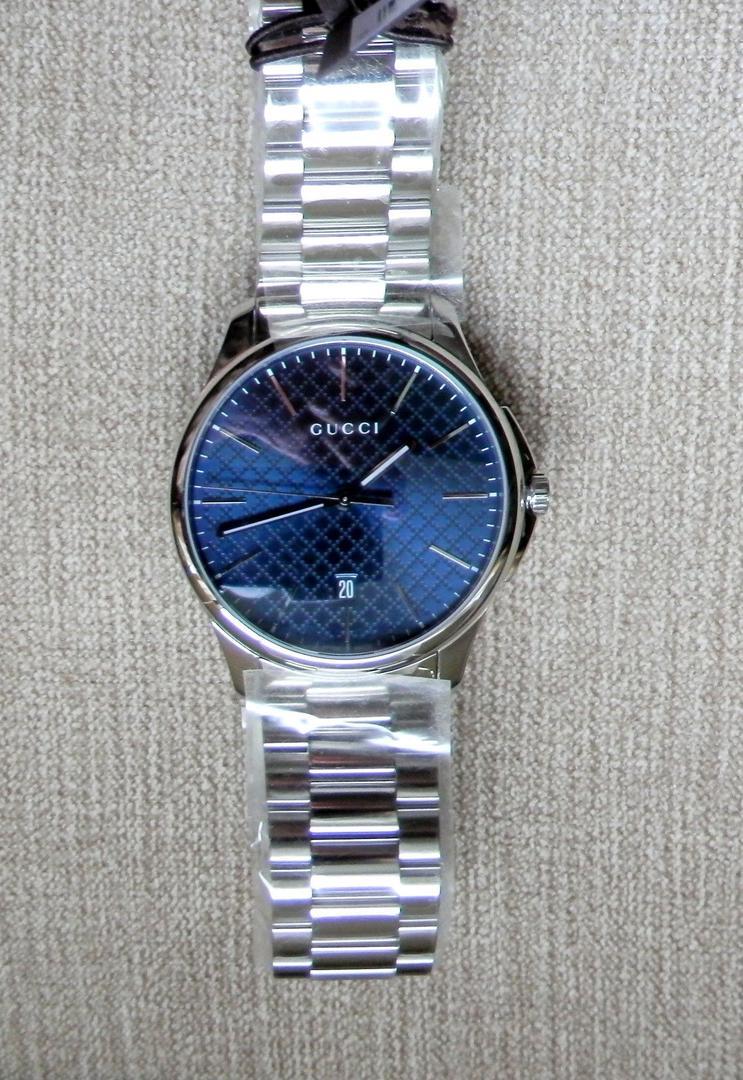 Gucci G-Timeless quartz watch. 40mm stainless steel case with bracelet. Dark blue dial with diamante pattern and date calendar.