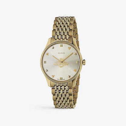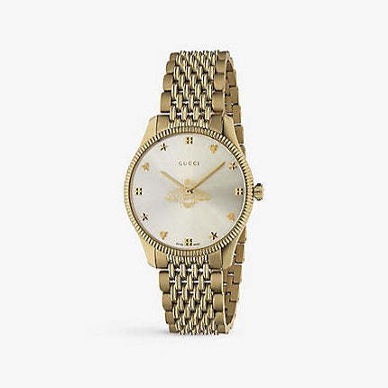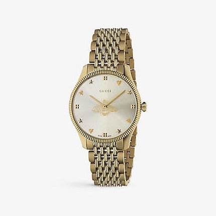 This Gucci G-Timeless Slim Bee Ladies Watch features a 36mm PVD Plated case, showcasing a Silver dial and sapphire crystal glass. Powered by a quartz movement, this stunning watch also showcases a pvd plated bracelet finished with a folding clasp for added security. This timepiece is also water resistant to 50 Metres.