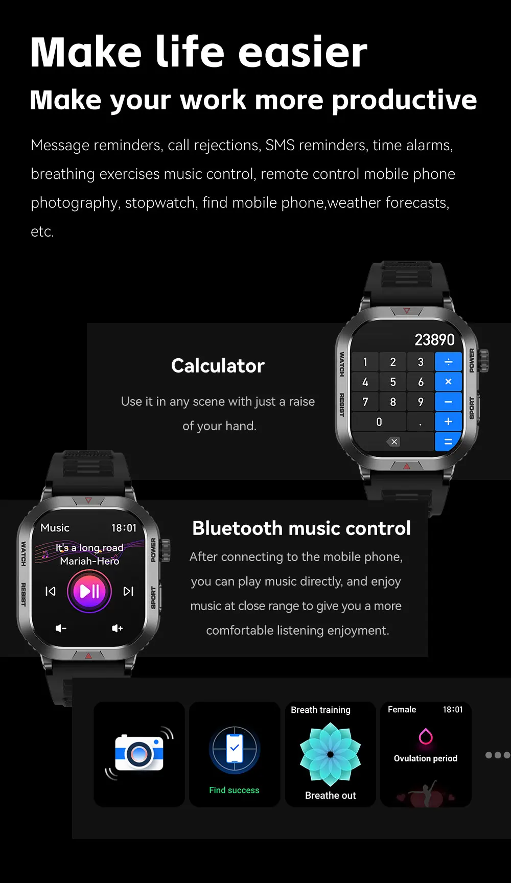 Calories, distance, step counting, raising the wrist to turn on the screen, weather, music control, alarm clock, find mobile phone, etc.
