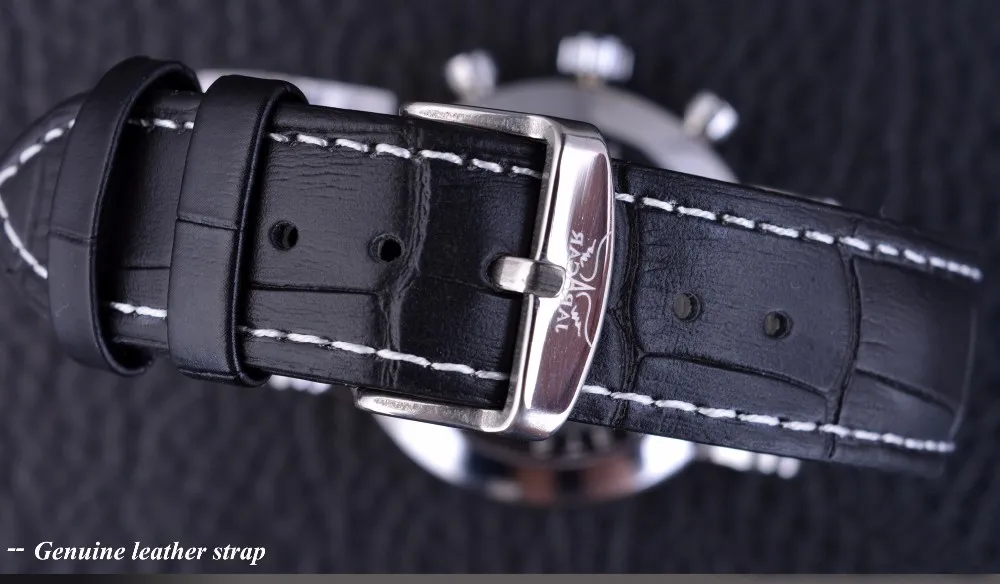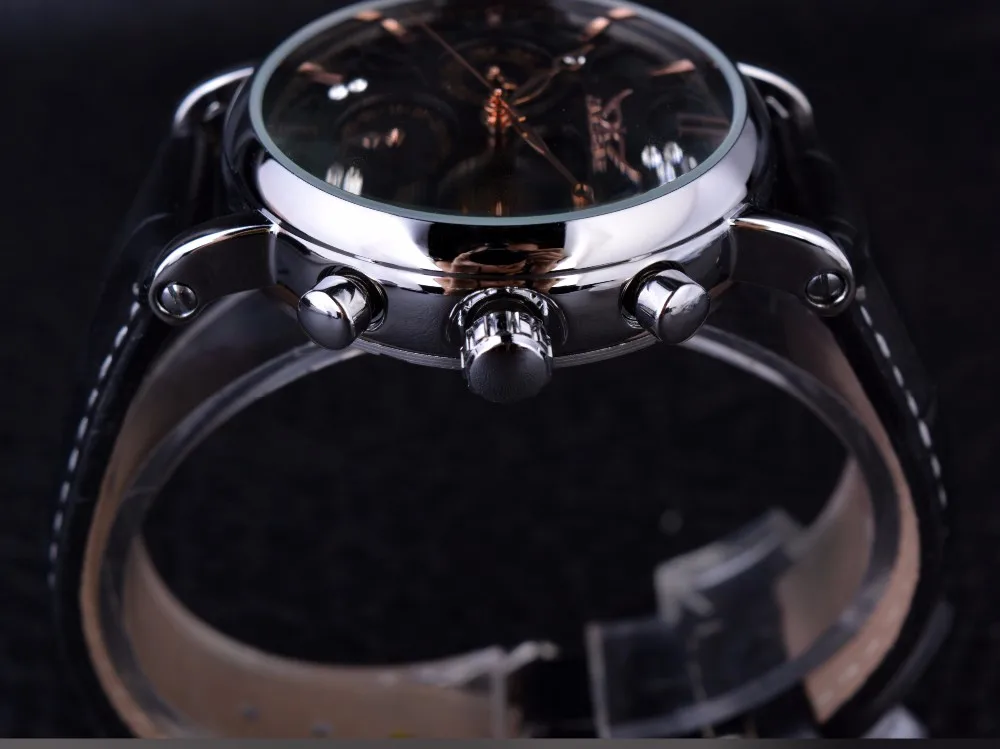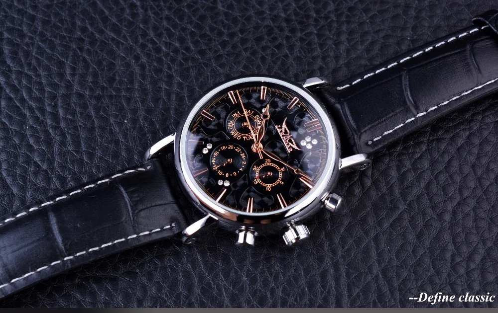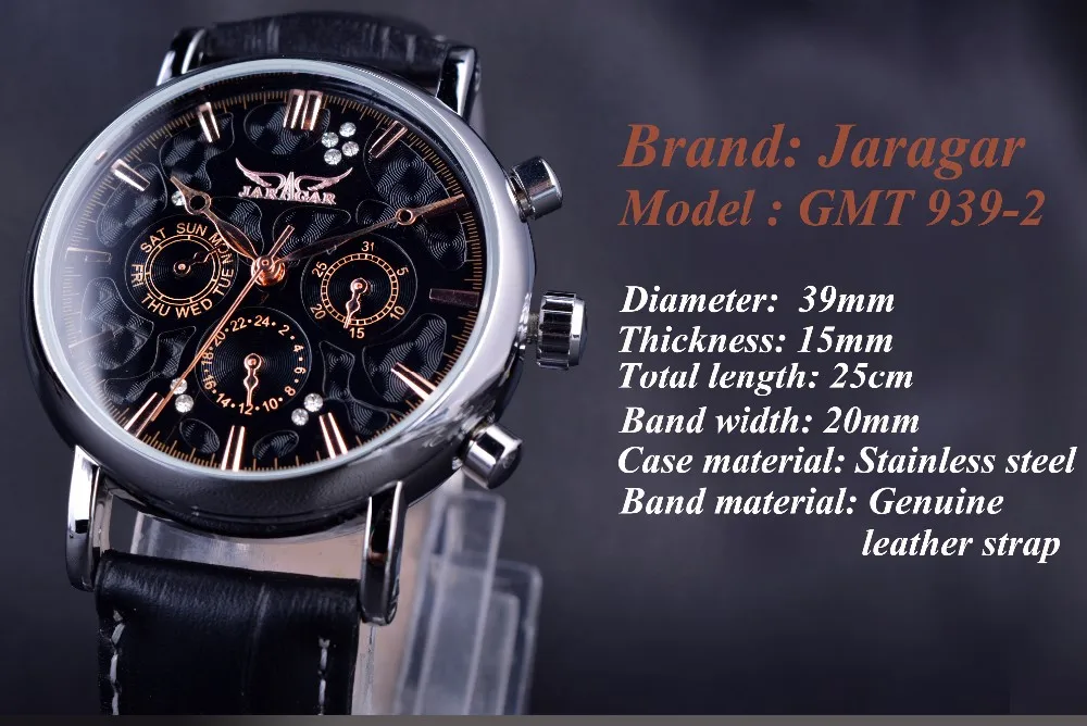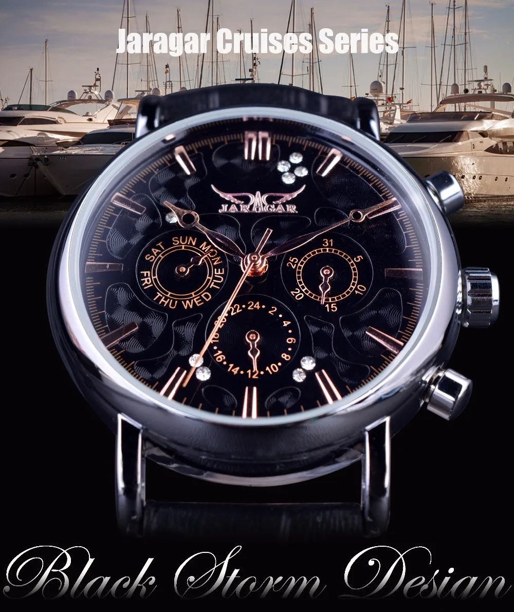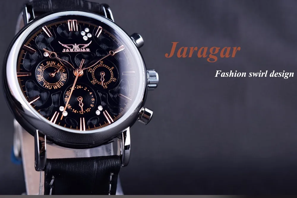 Jaragar Obscure Swirl Fashion 3 Dial Design Diamond Black Golden Dial Genuine Leather Men Watch Top Brand Luxury Automatic Watch