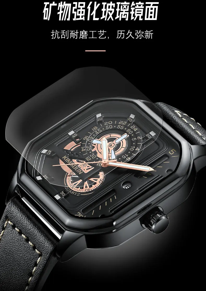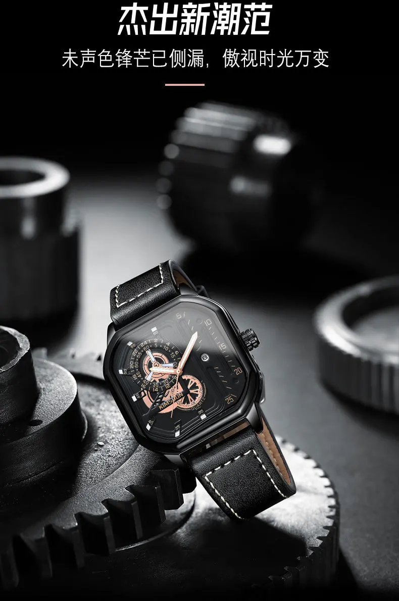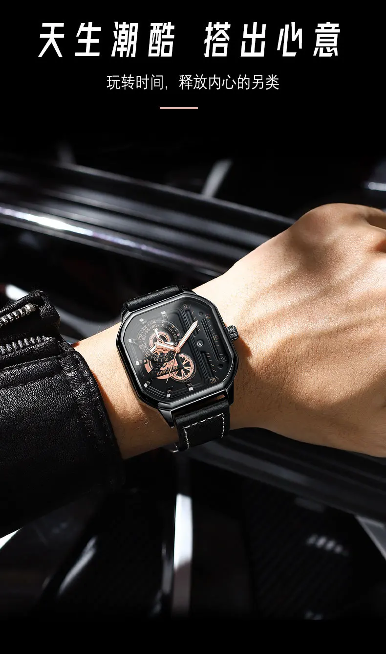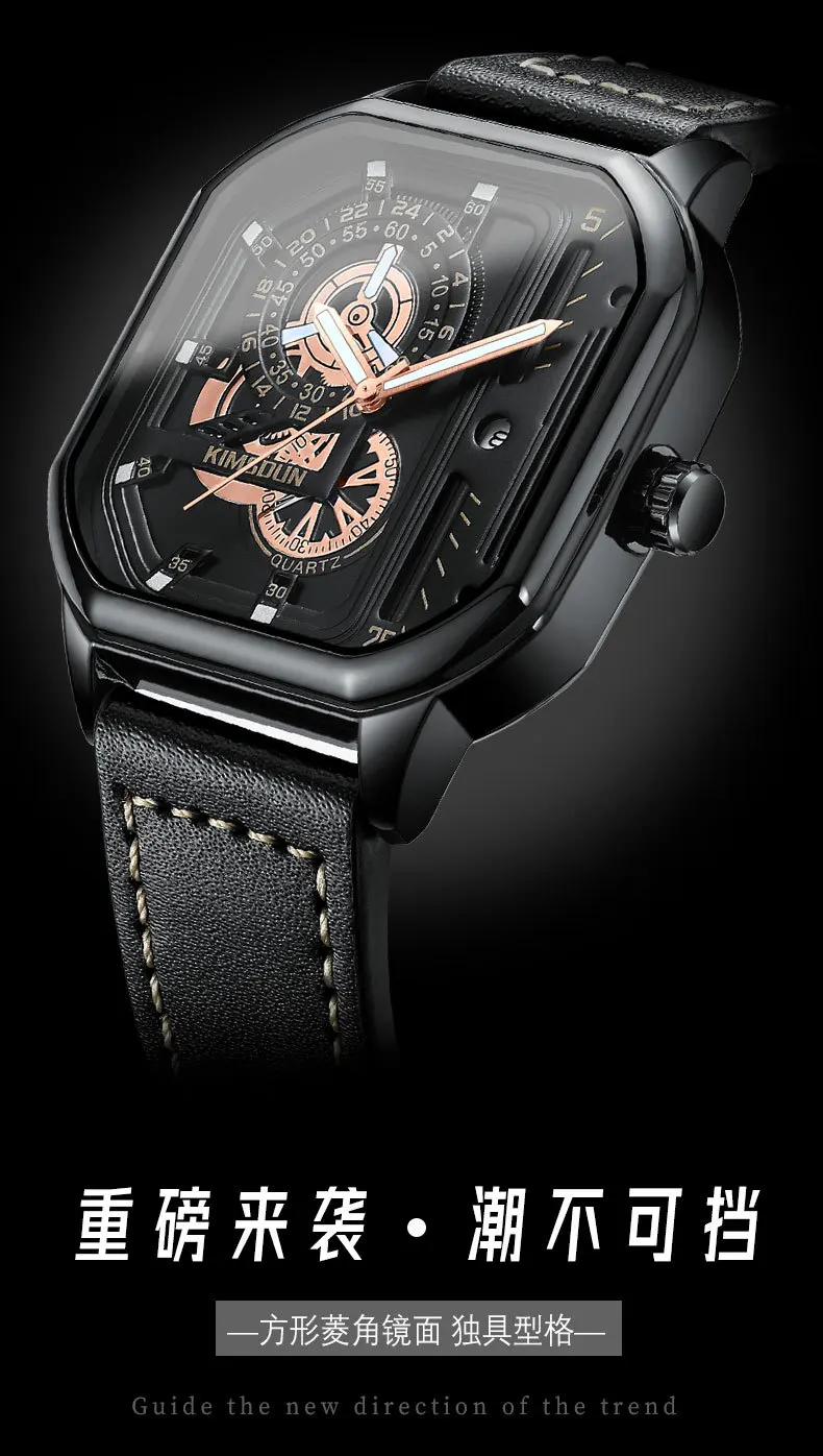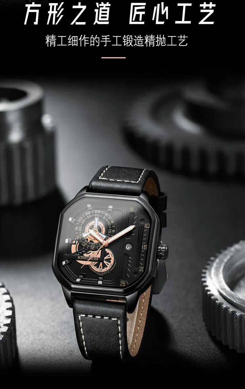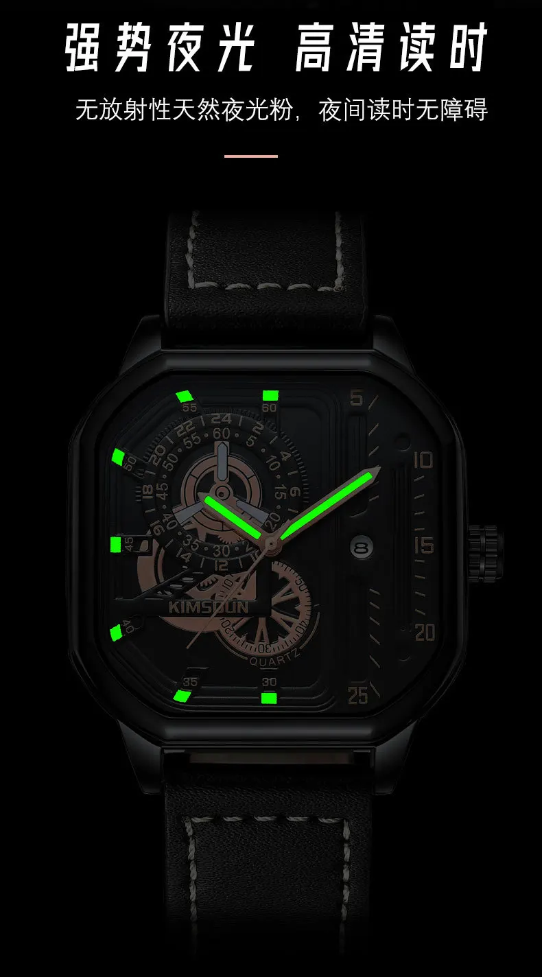 KIMSDUN new square watches luminous waterproof fashion Wristwatch leisure business men's Quartz Watch Leather Strap man Watch